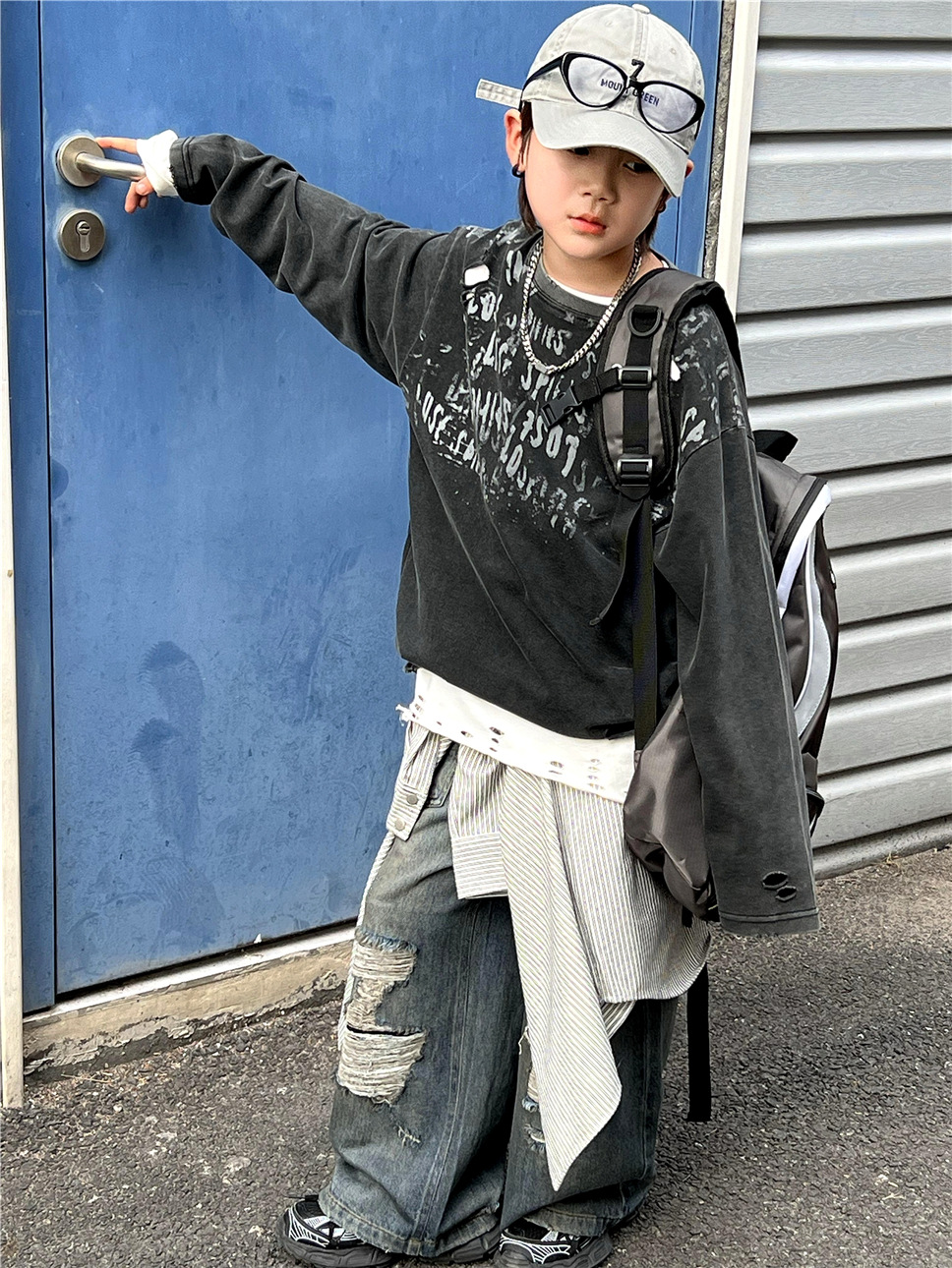 가을 2024 년 새 어린이 긴팔 레트로 홀 볶음 컬러 앞면과 뒷글자 유행 스타일베이스 셔츠 소년 소녀