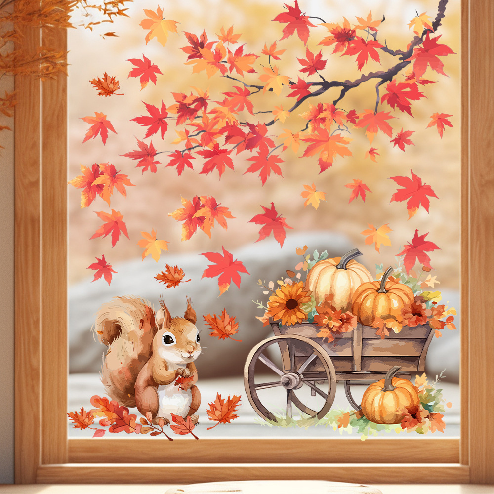 Yiyao JD3605 추수 감사절 단풍 잎 호박 다람쥐 창 스티커 유리 문 및 Windows 접착제가없는 정전기 스티커스토어 가기