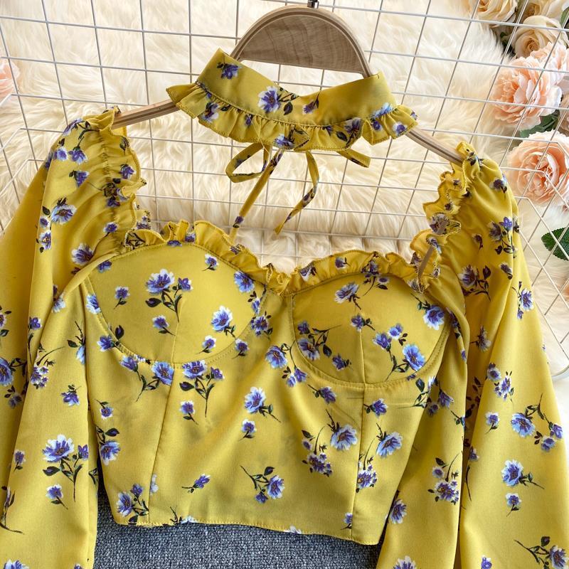모리 스타일 달콤한 꽃 버블 슬리브 여성용 우드귀 교수형 넥 레이스 업 쉬폰 셔츠 탑