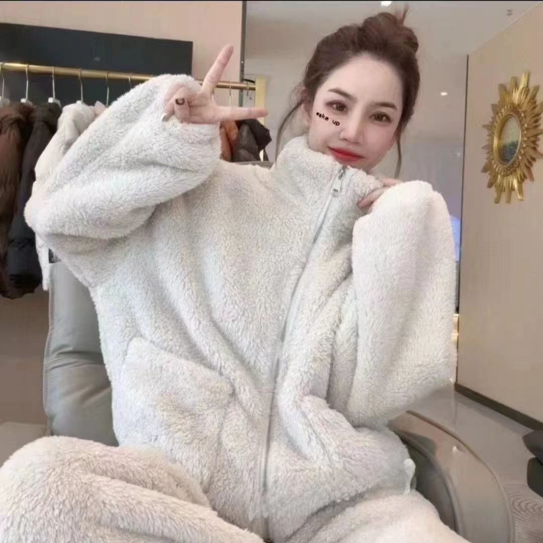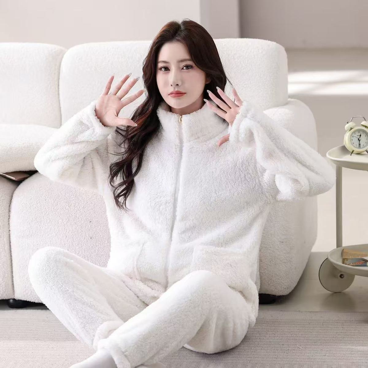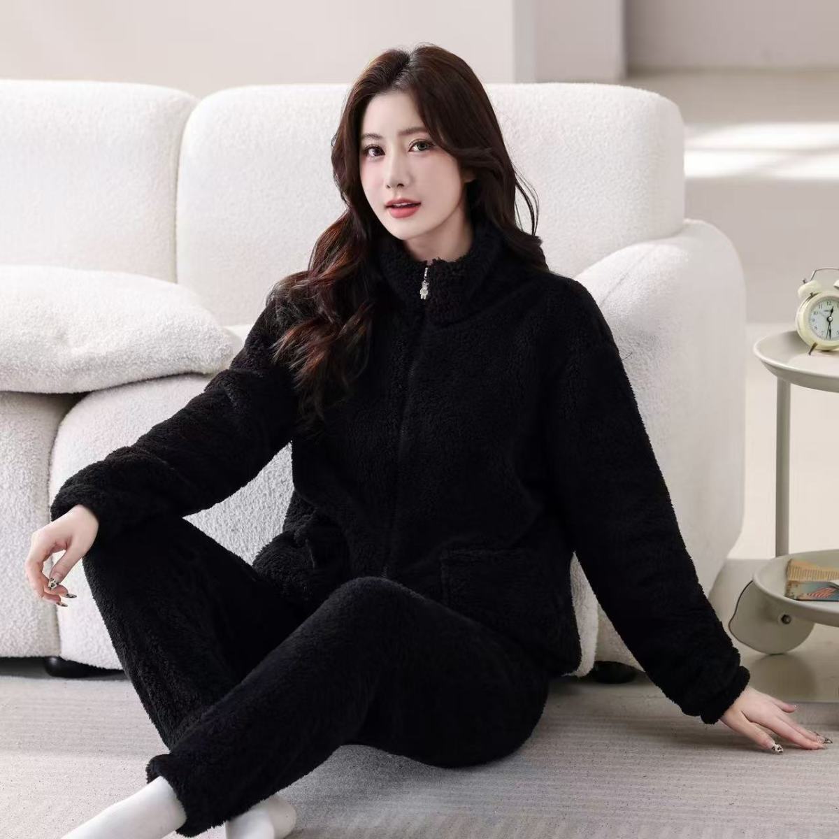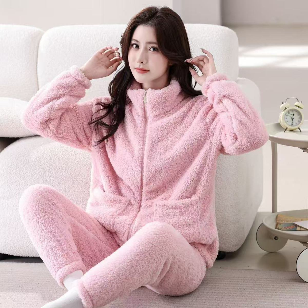 2025년 신상 코랄벨벳 커플 잠옷 여성용 겨울용 두꺼운 보온 홈웨어 루즈핏 투피스 세트