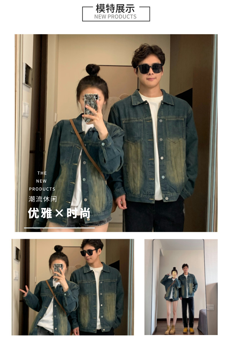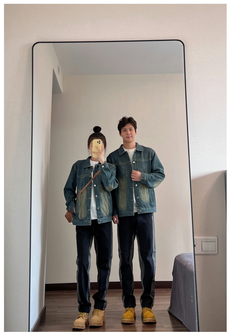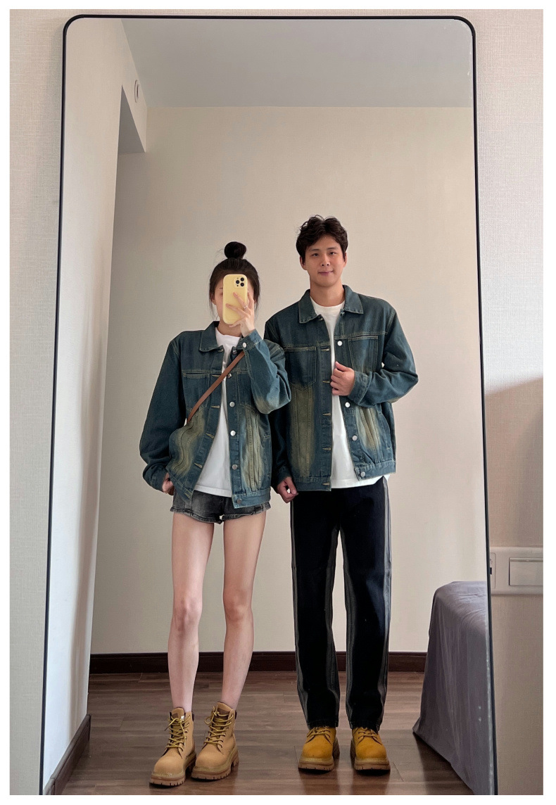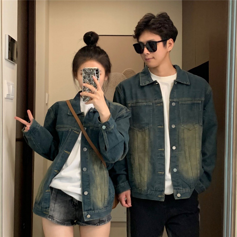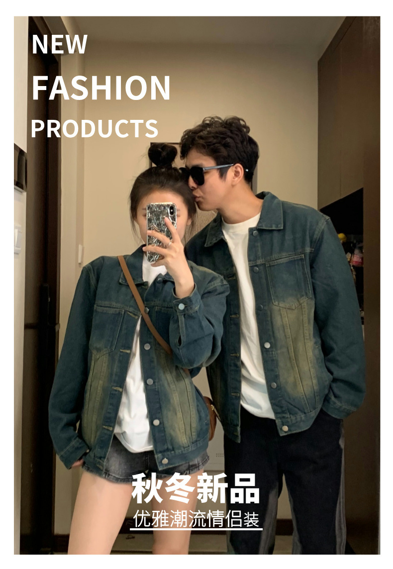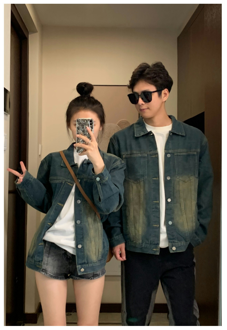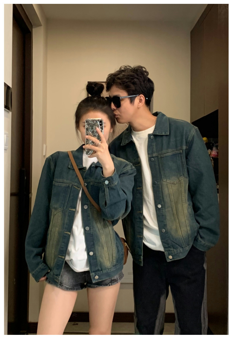 2024 년 가을 커플의 캐주얼 데님 코트 재킷 올드 워시 아메리칸 스트리트 탑스토어 가기