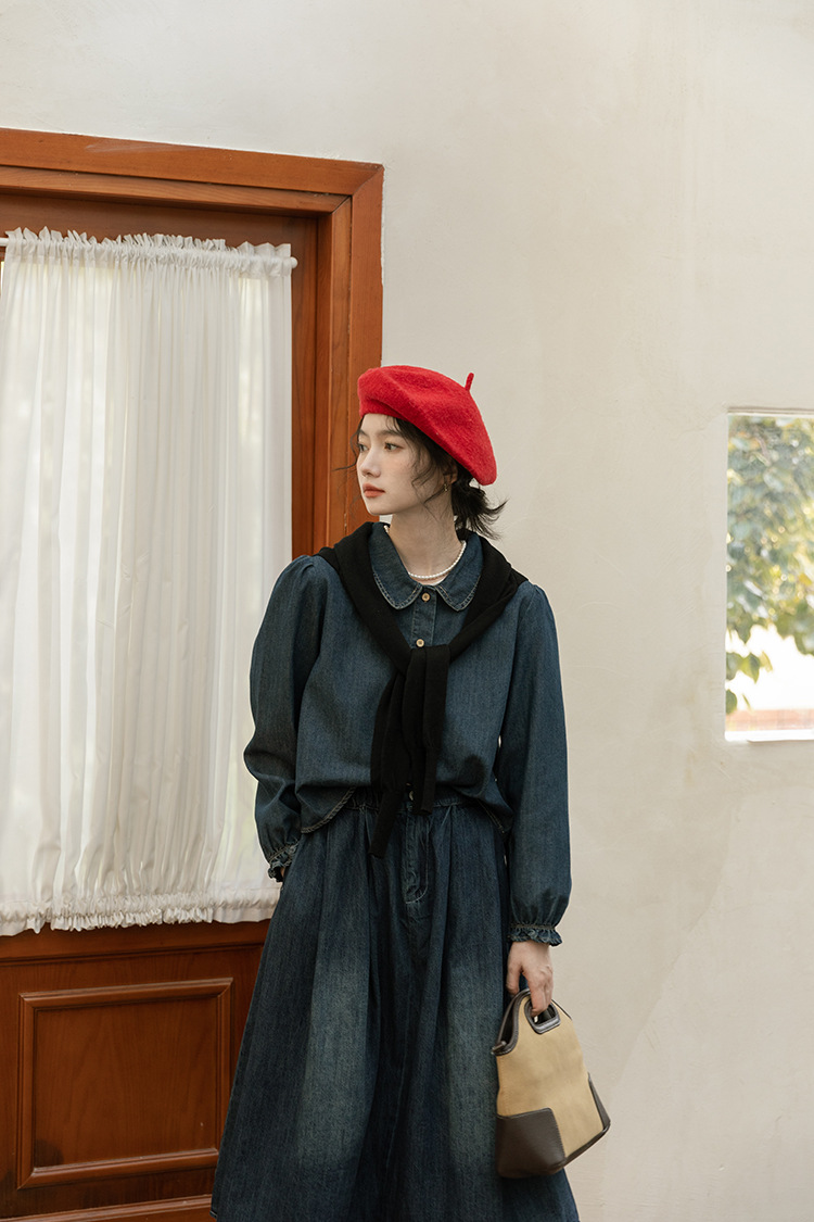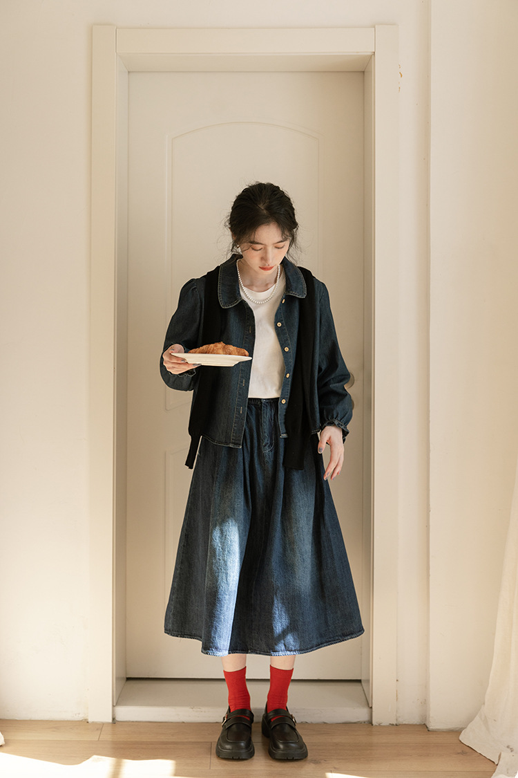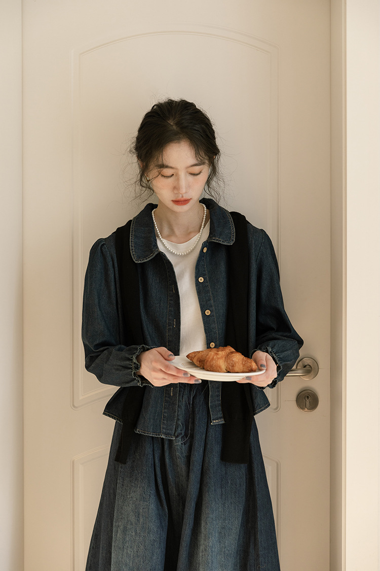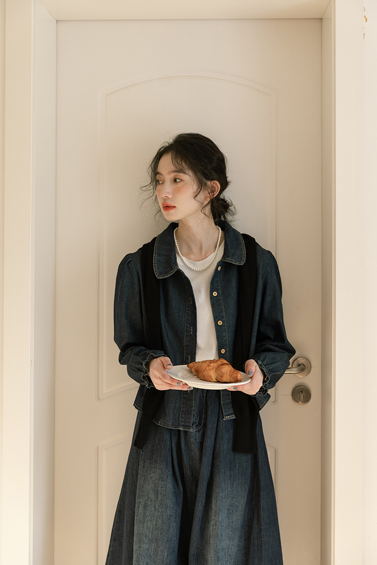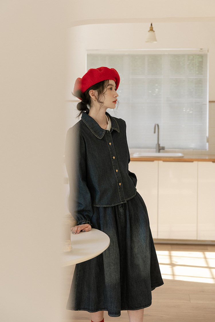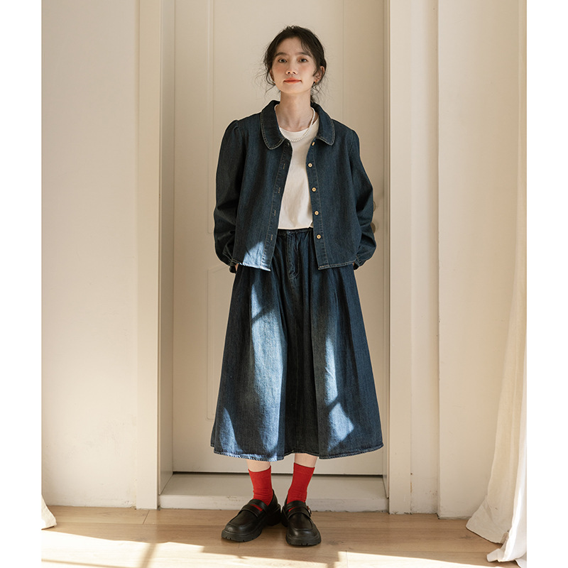 데님 치마 세트 여성 2024 가을 새로운 빈티지 인형 칼라 꽃잎 소매 긴 소매 데님 재킷 스커트스토어 가기