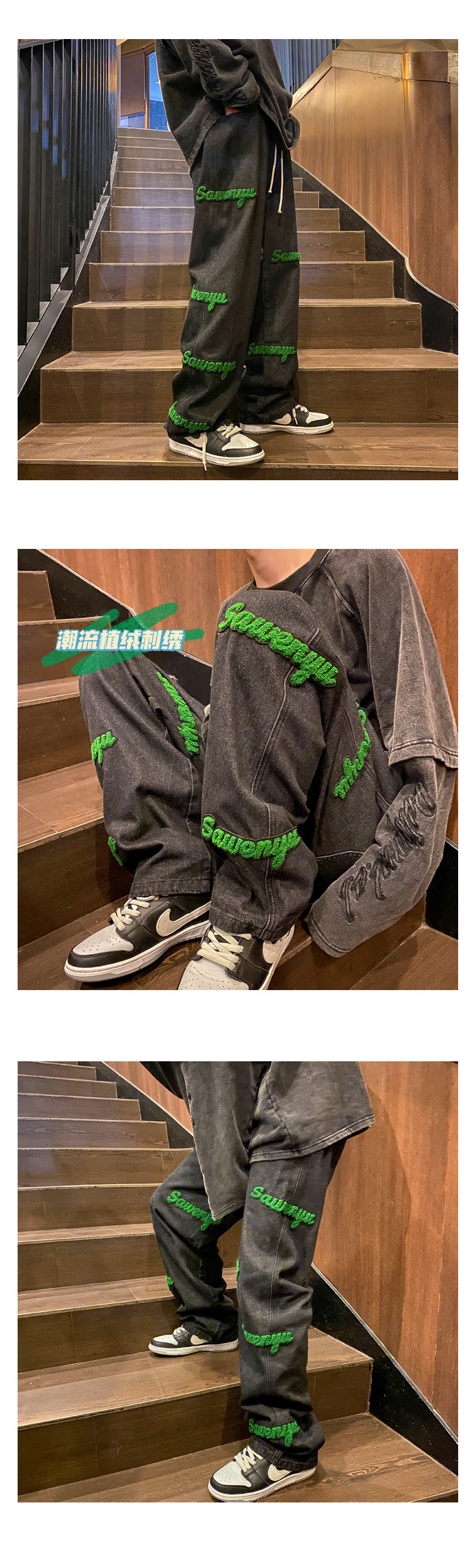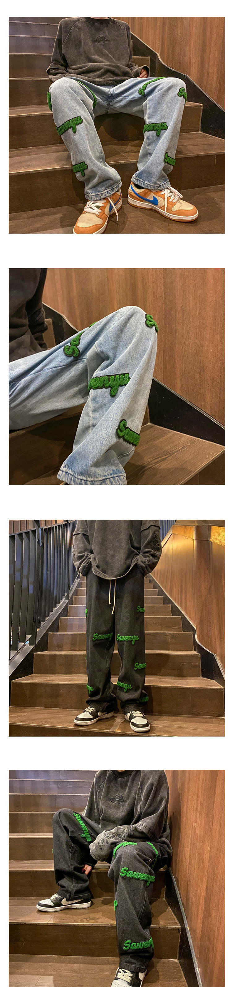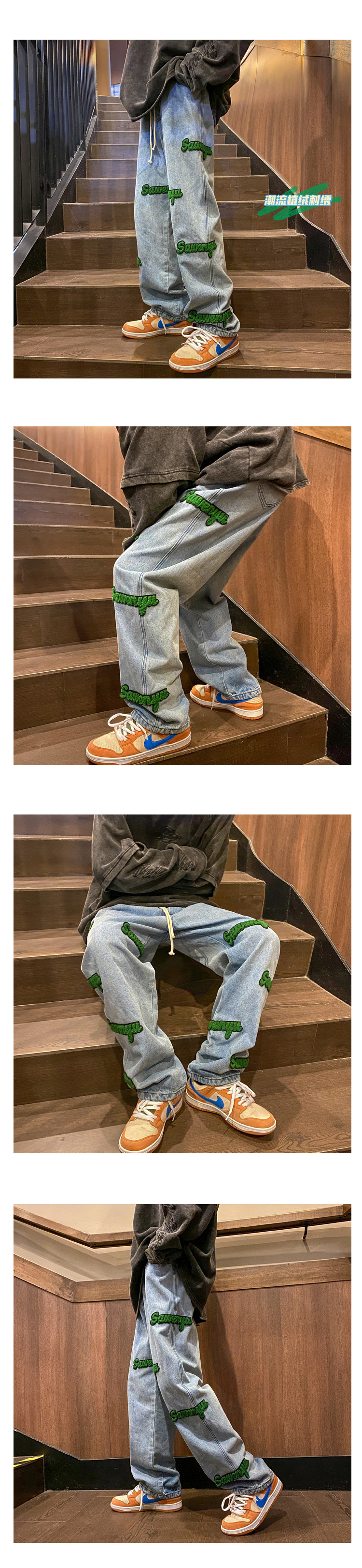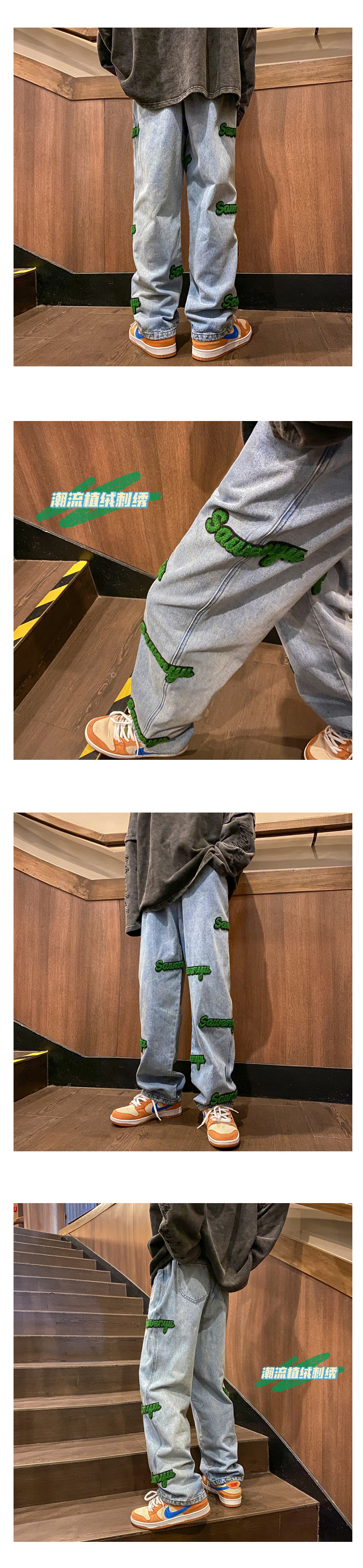 고정 자수 청바지 남성 봄 트렌디 브랜드 하이 스트리트 인 홍콩 스타일 바지 봄과 가을 느슨한 스트레이트 와이드 다리 바지스토어 가기