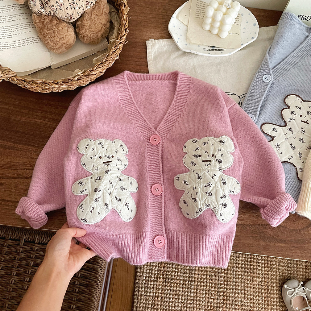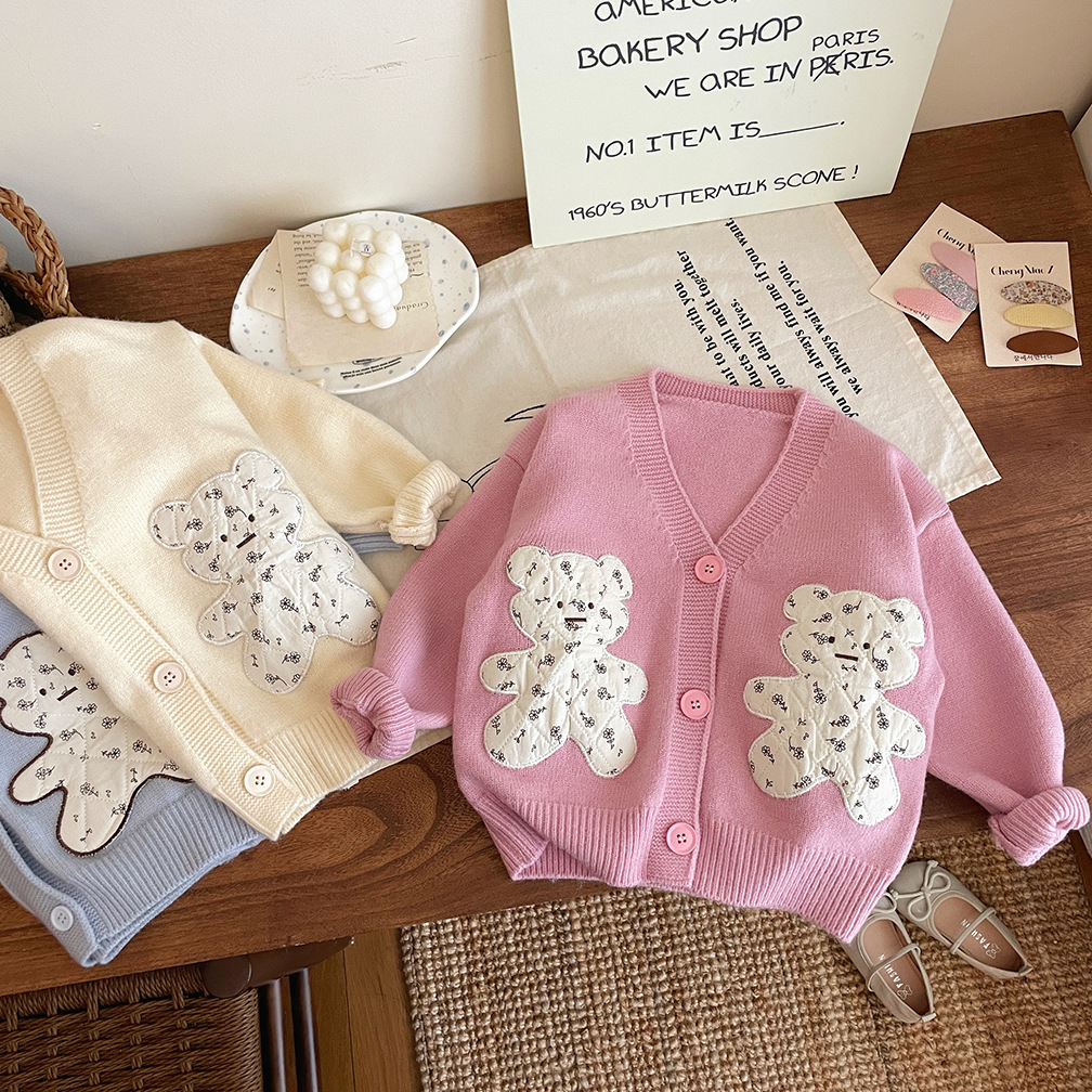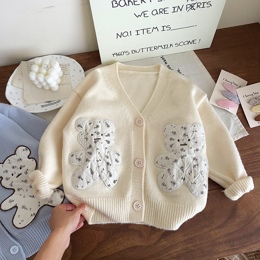 어린이 의류 24 여자 긴 소매 니트 카디건 2024 새로운 어린이 블루 스웨터 아기 소녀 유행 곰 코트스토어 가기