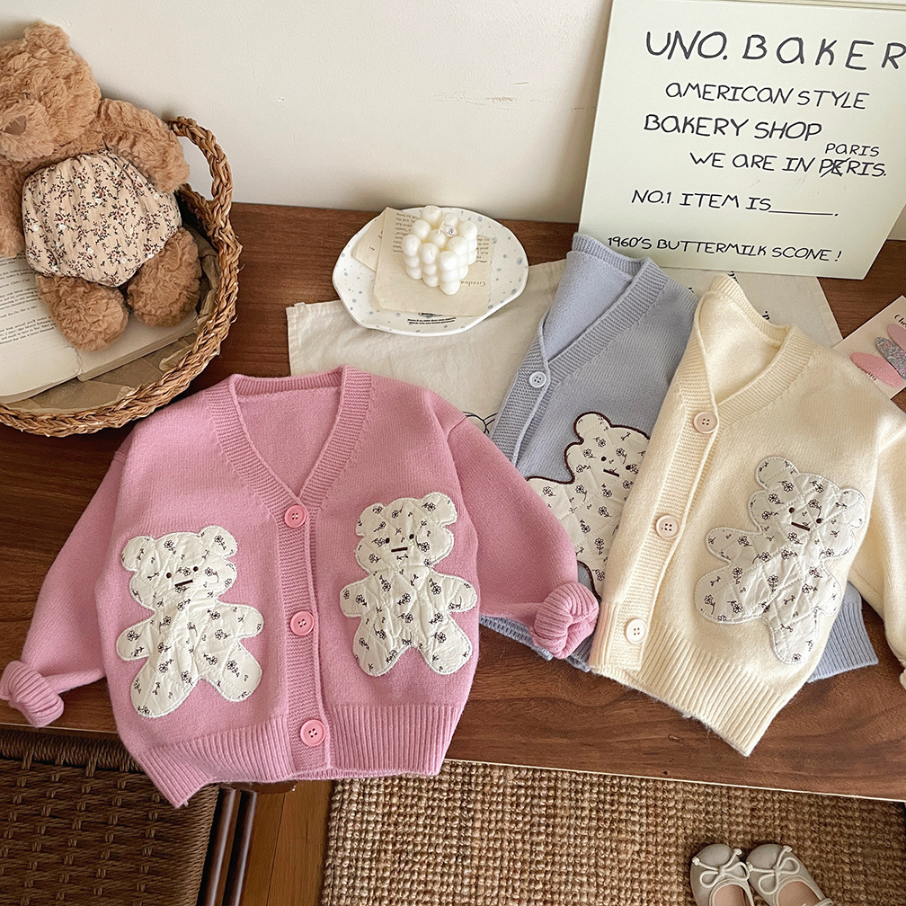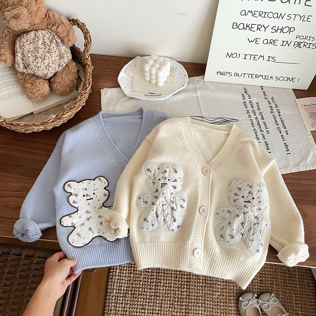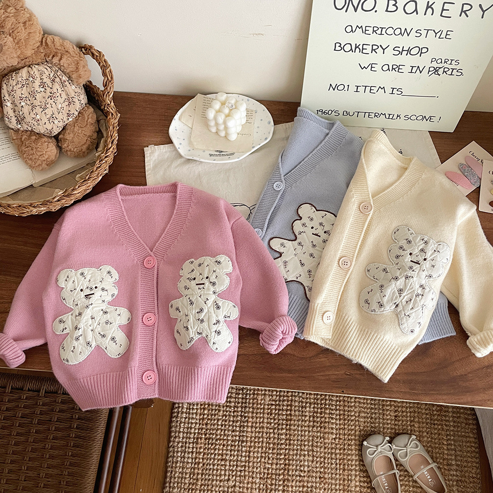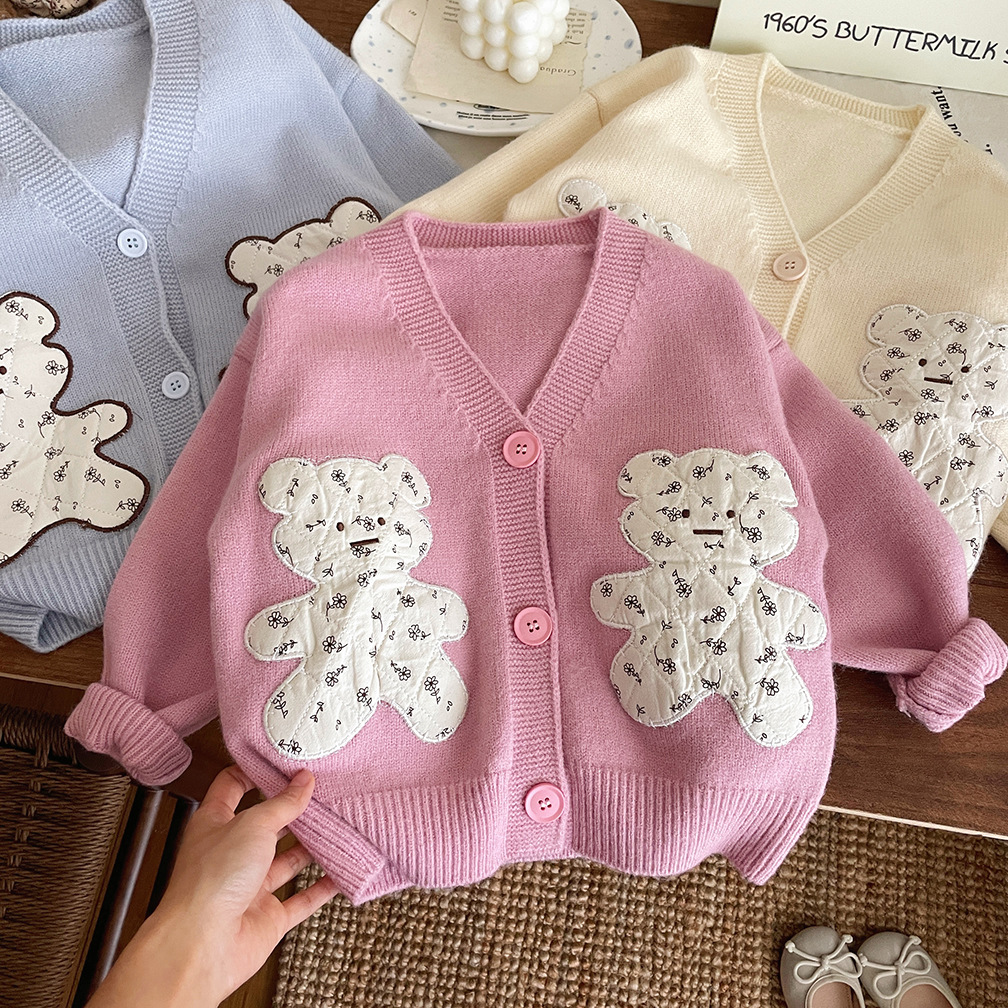 어린이 의류 24 여자 긴 소매 니트 카디건 2024 새로운 어린이 블루 스웨터 아기 소녀 유행 곰 코트스토어 가기