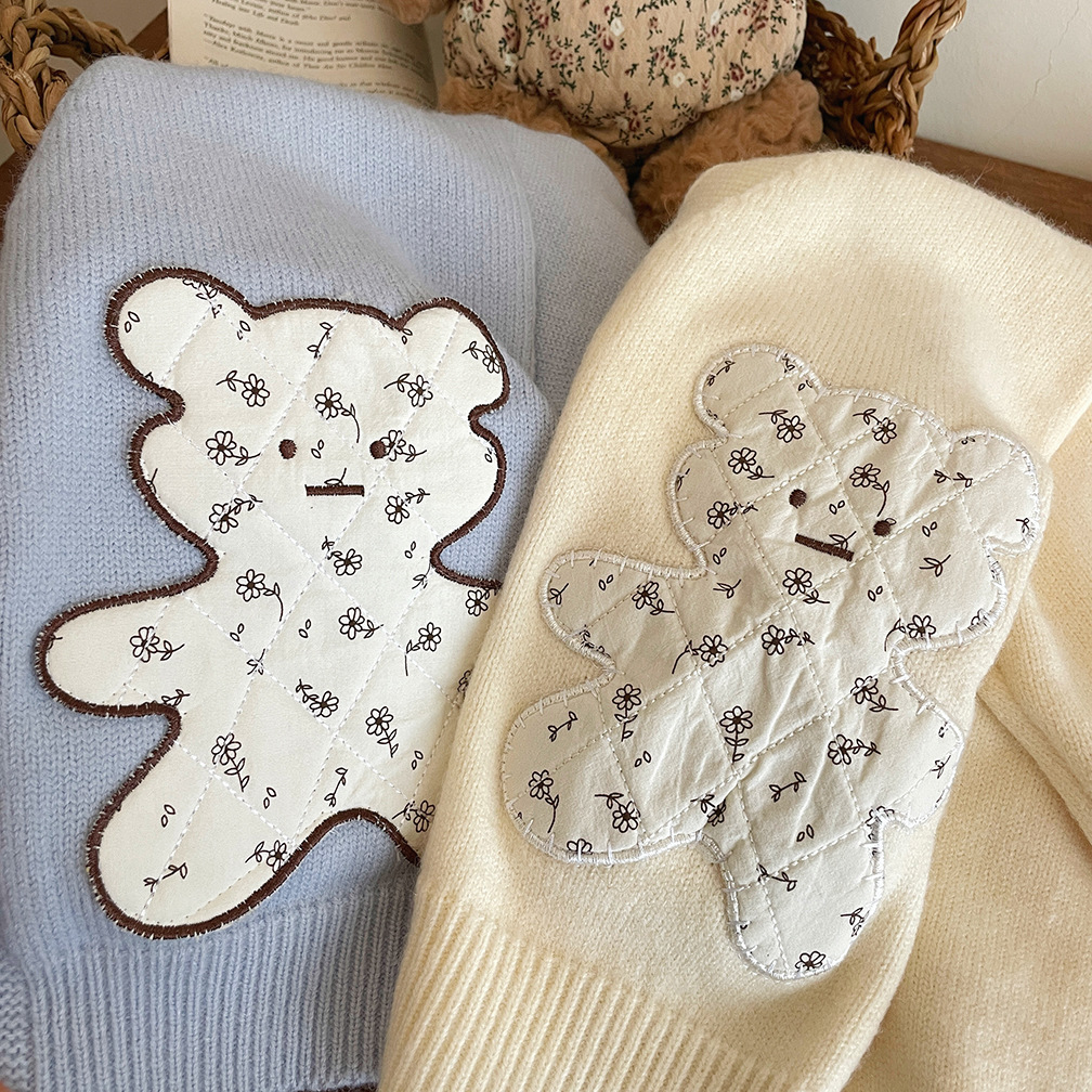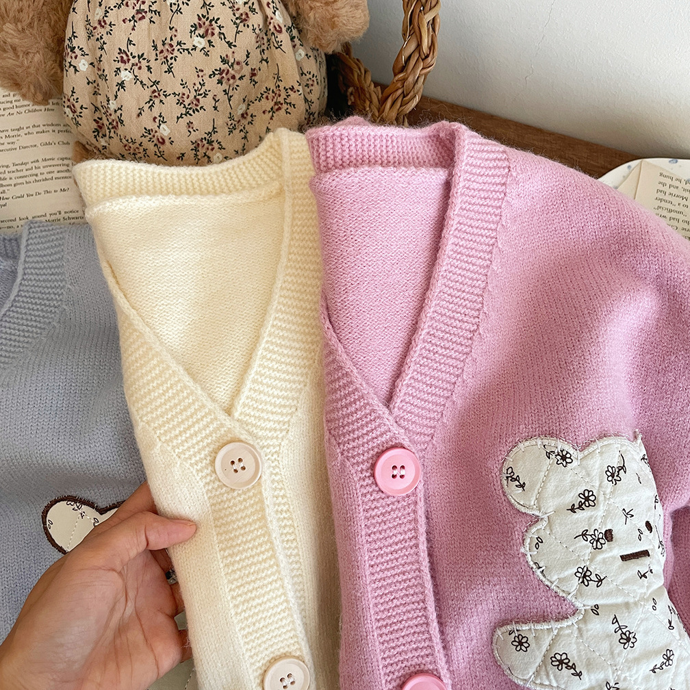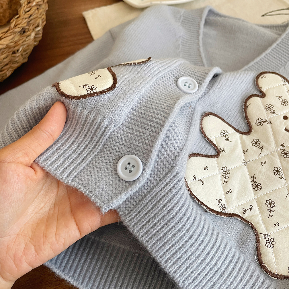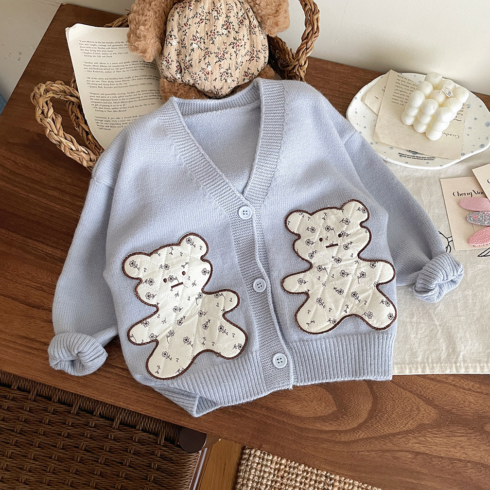 어린이 의류 24 여자 긴 소매 니트 카디건 2024 새로운 어린이 블루 스웨터 아기 소녀 유행 곰 코트