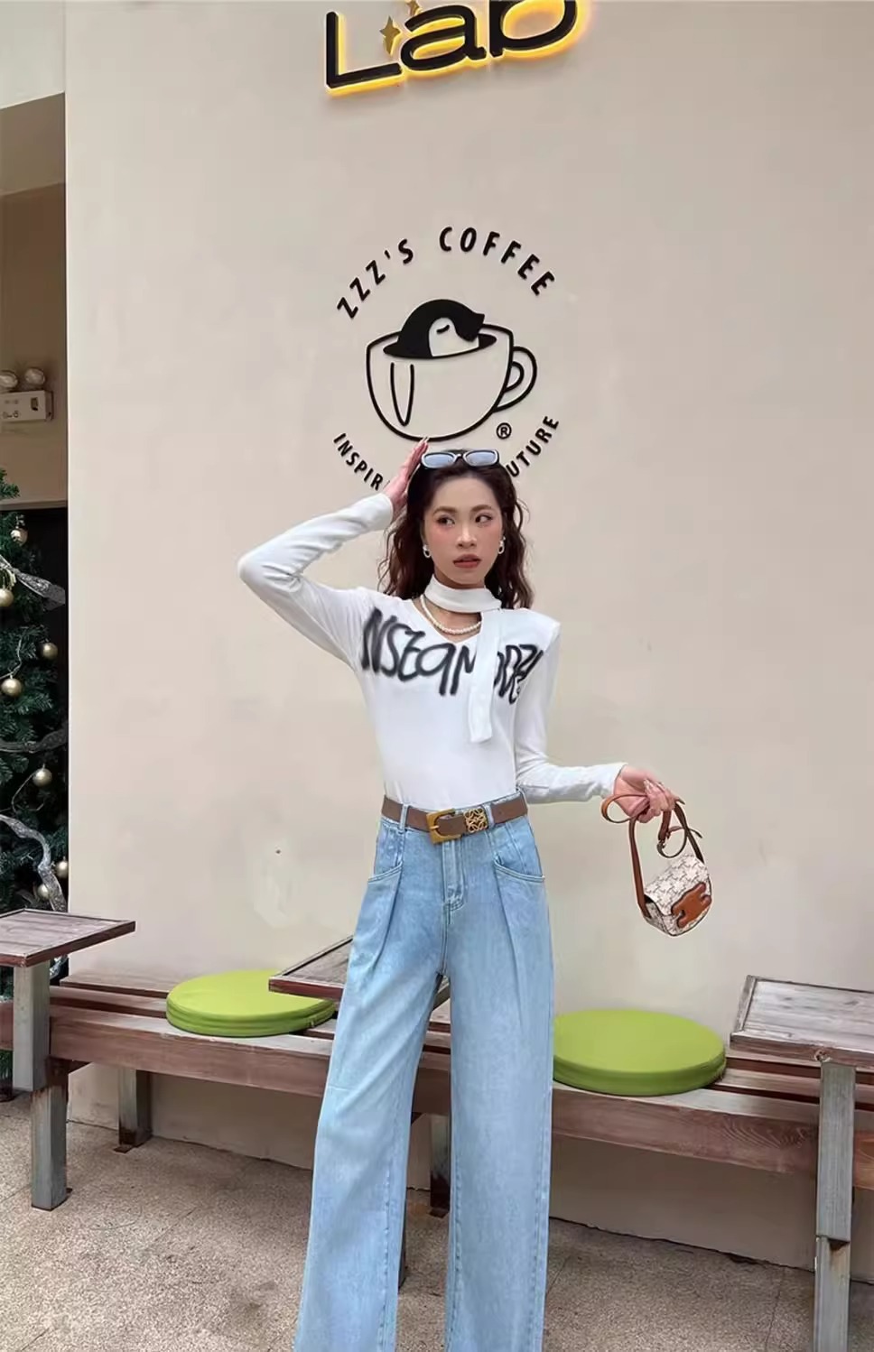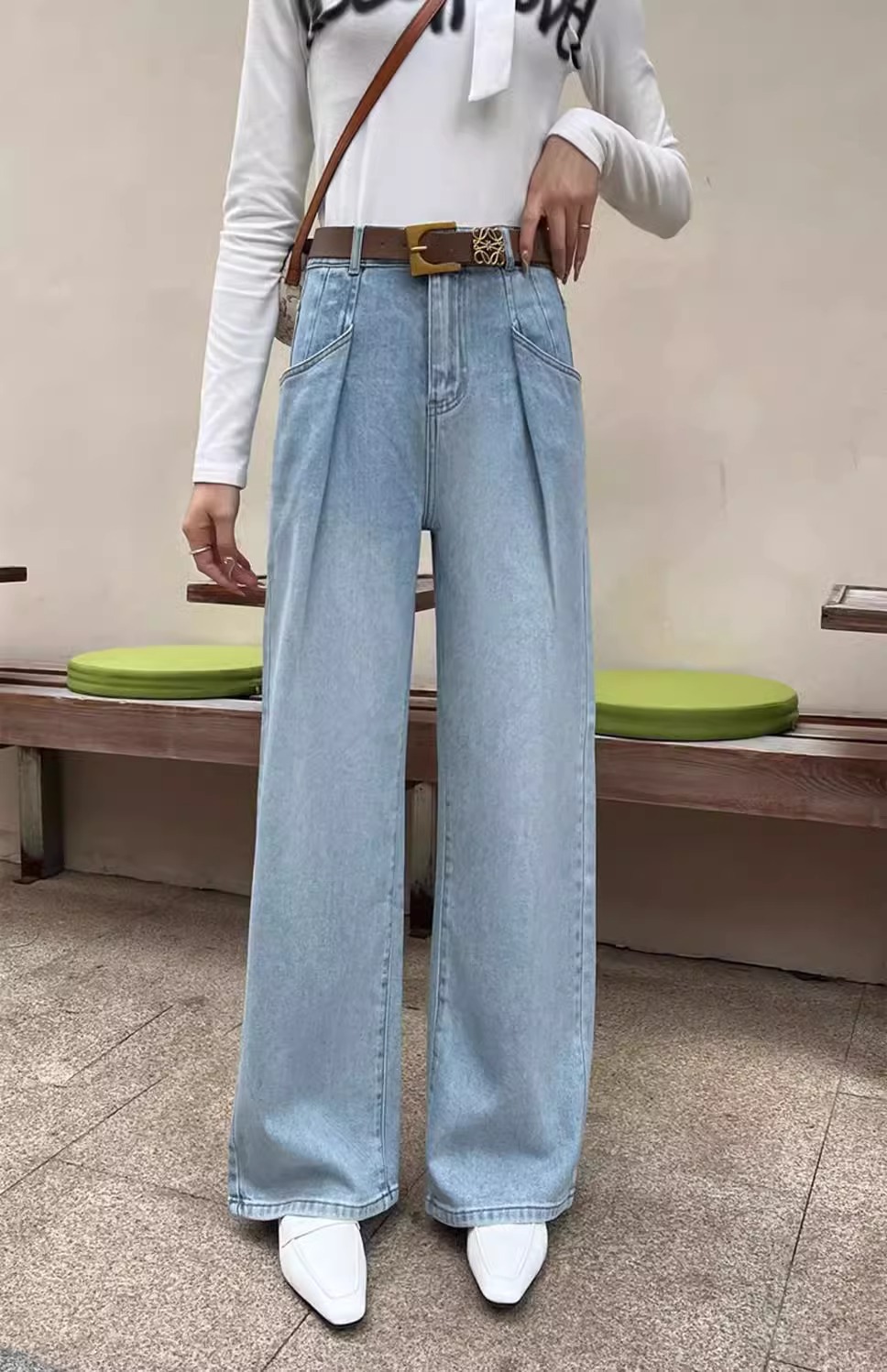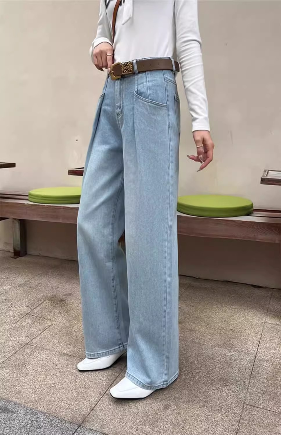 빈티지 홍콩 스타일 와이드 레그 청바지 여성 2024 봄과 가을 새로운 높은 허리 슬리밍 작은 남성 스트레이트 루즈 걸레 바지스토어 가기