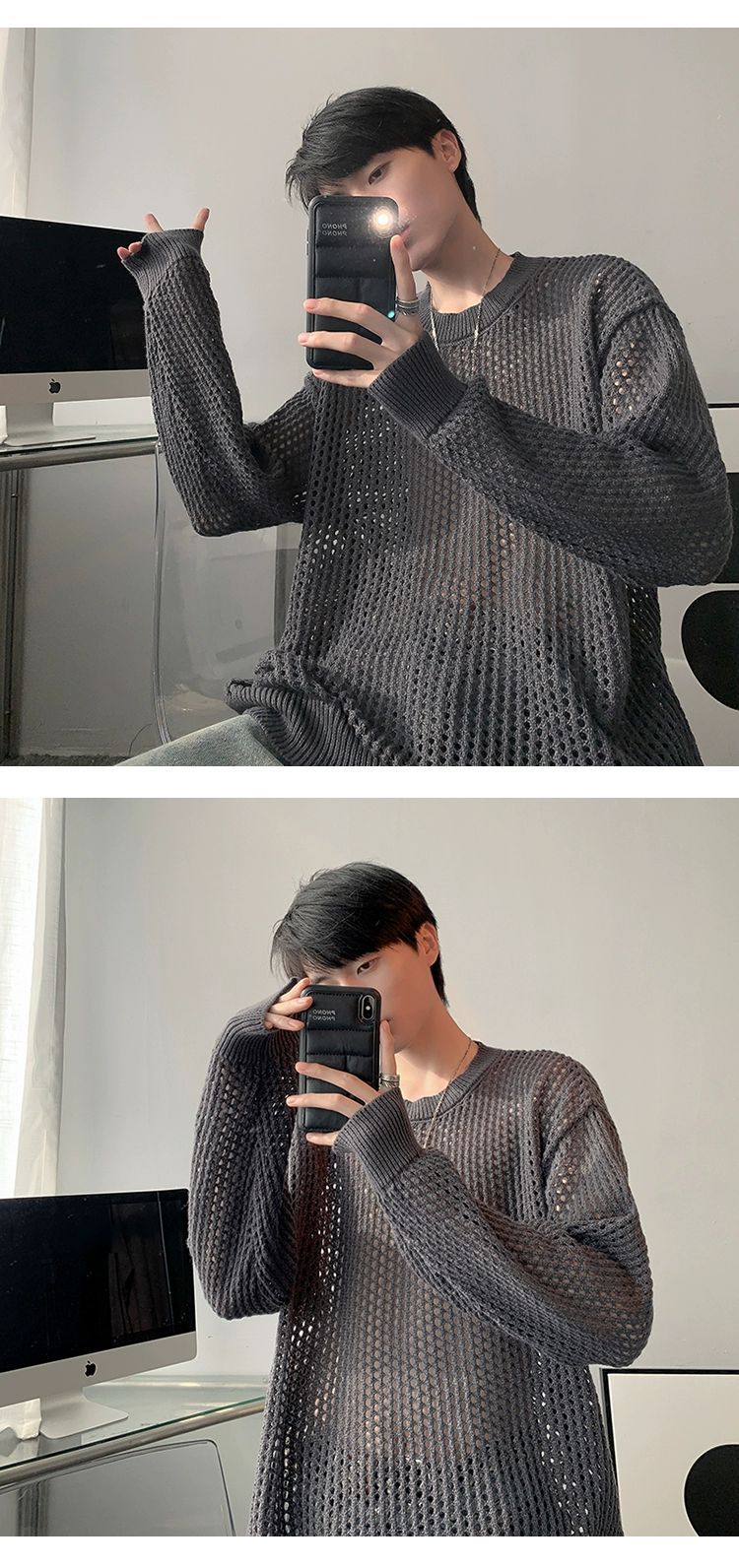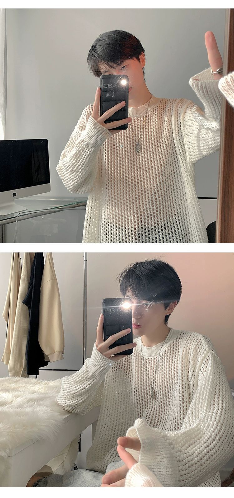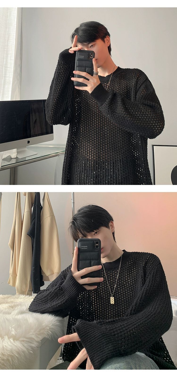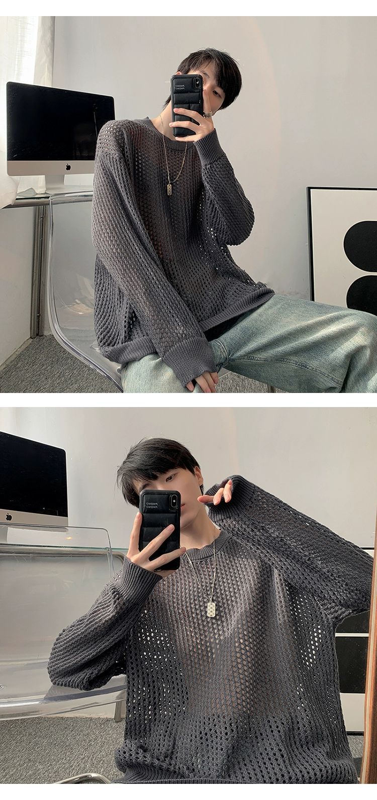중공 니트 스웨터 남자의 가을과 여름 Ins 얇은 한국 스타일 틈새 디자인 센스 게으른 스타일 루즈 탑 트렌디스토어 가기