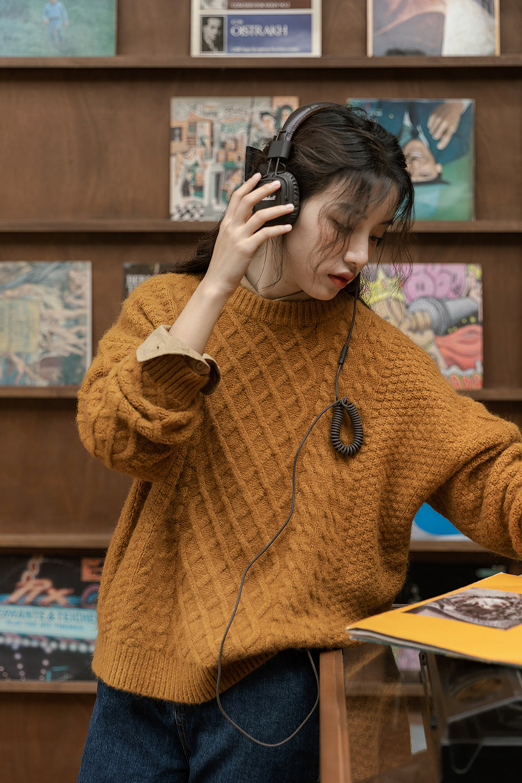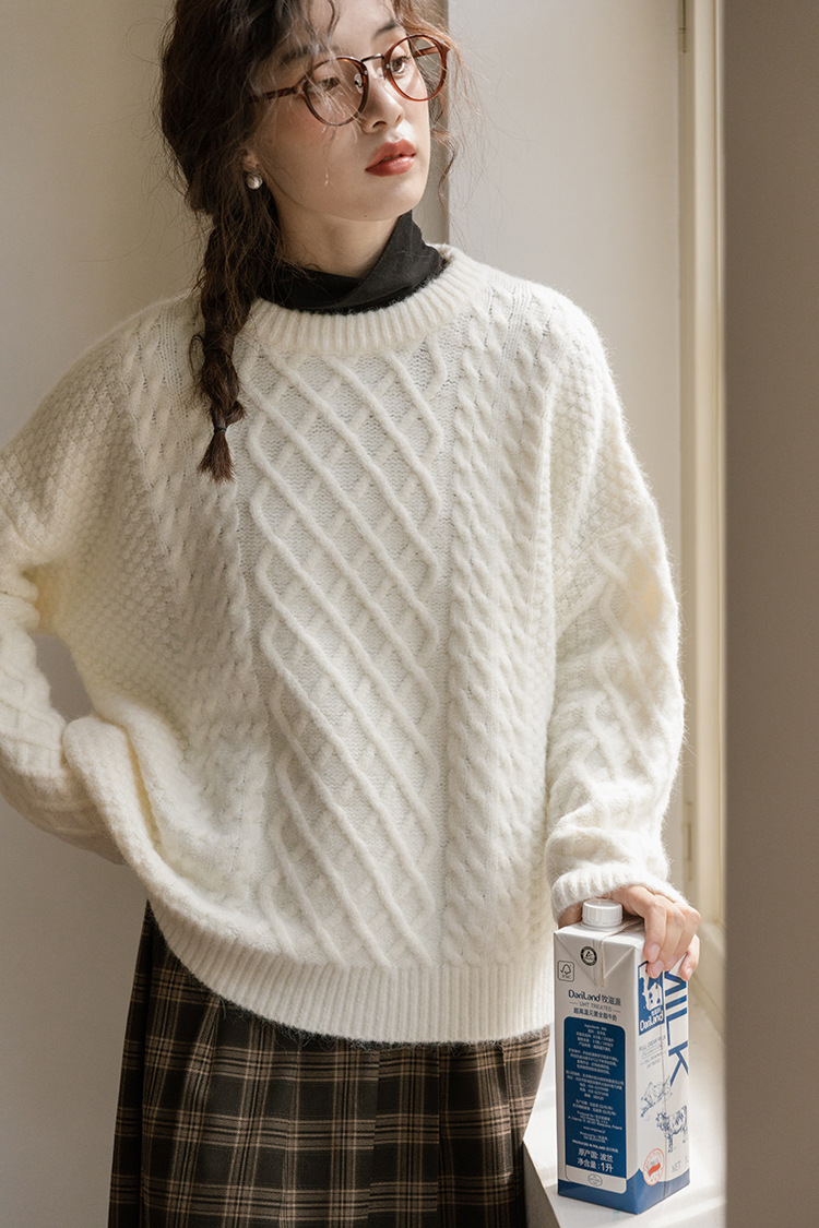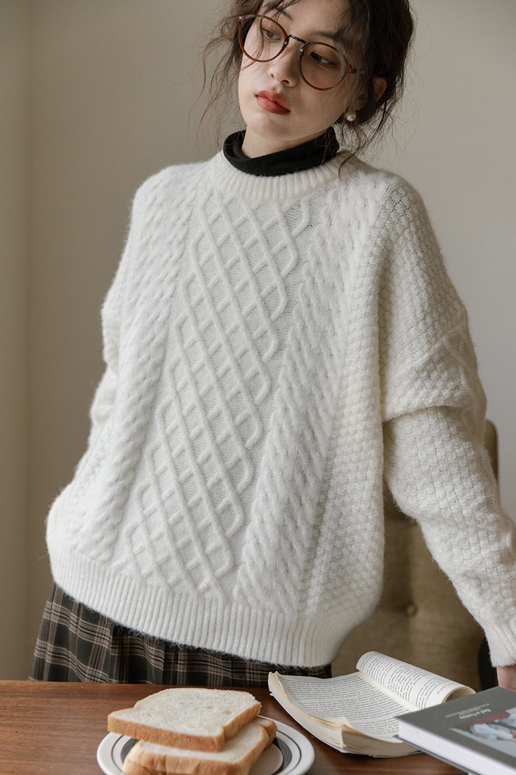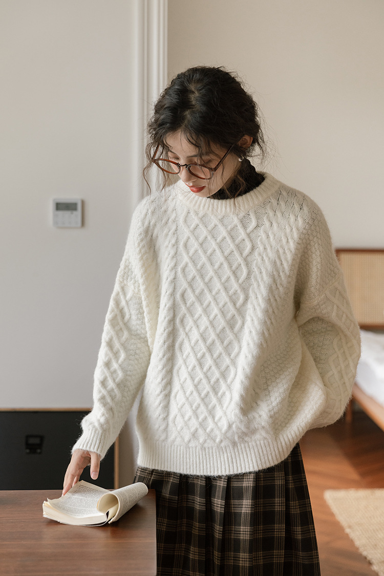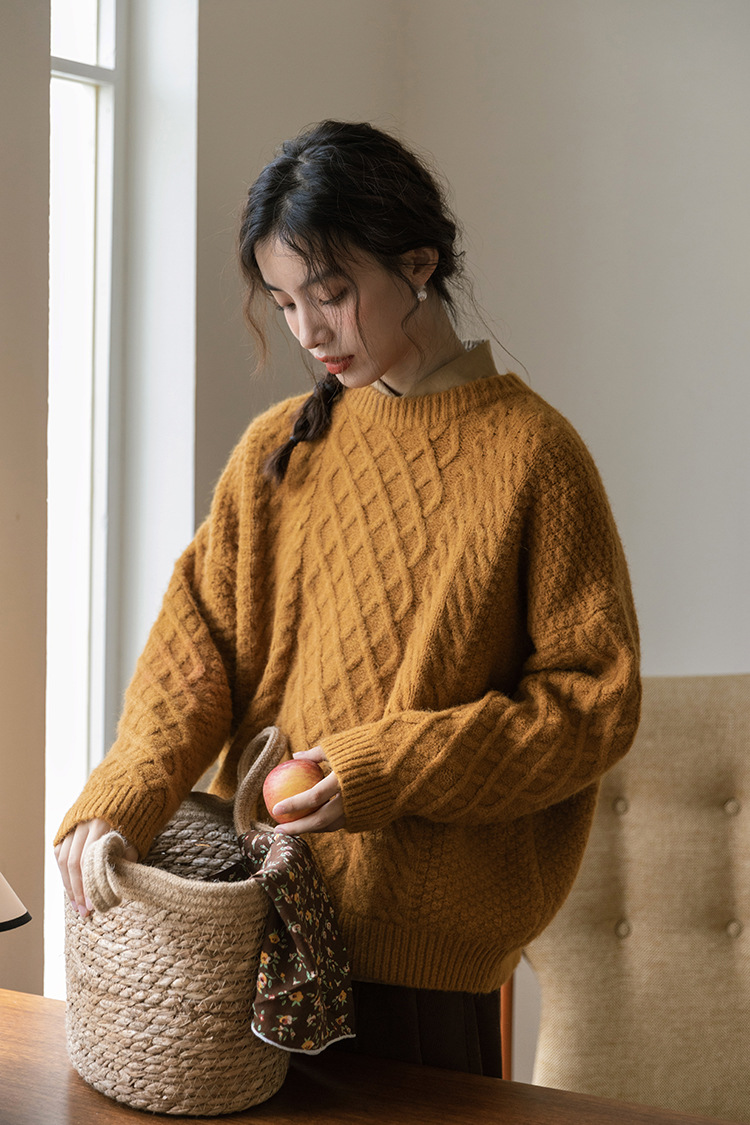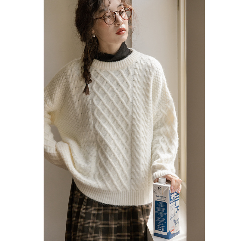 2024 가을과 겨울 새로운 한국 스타일 복고풍 둥근 목 꼬인 다이아몬드 격자 디자인 두꺼운 따뜻한 풀오버 라운드 넥 스웨터 여성용스토어 가기