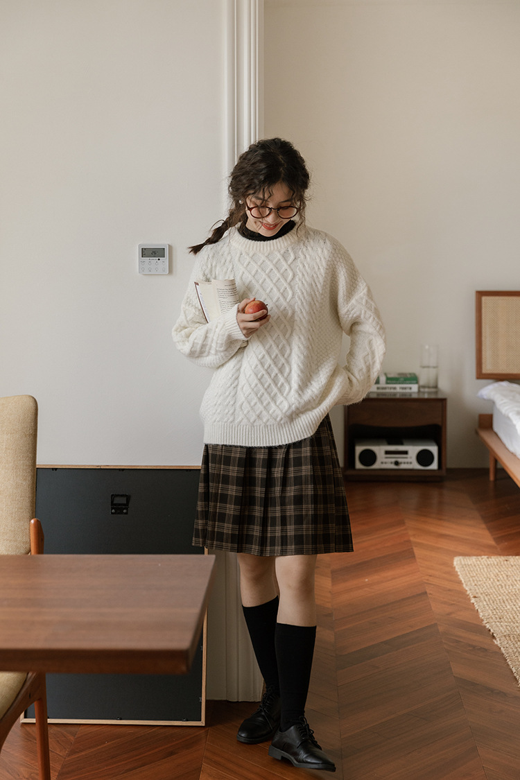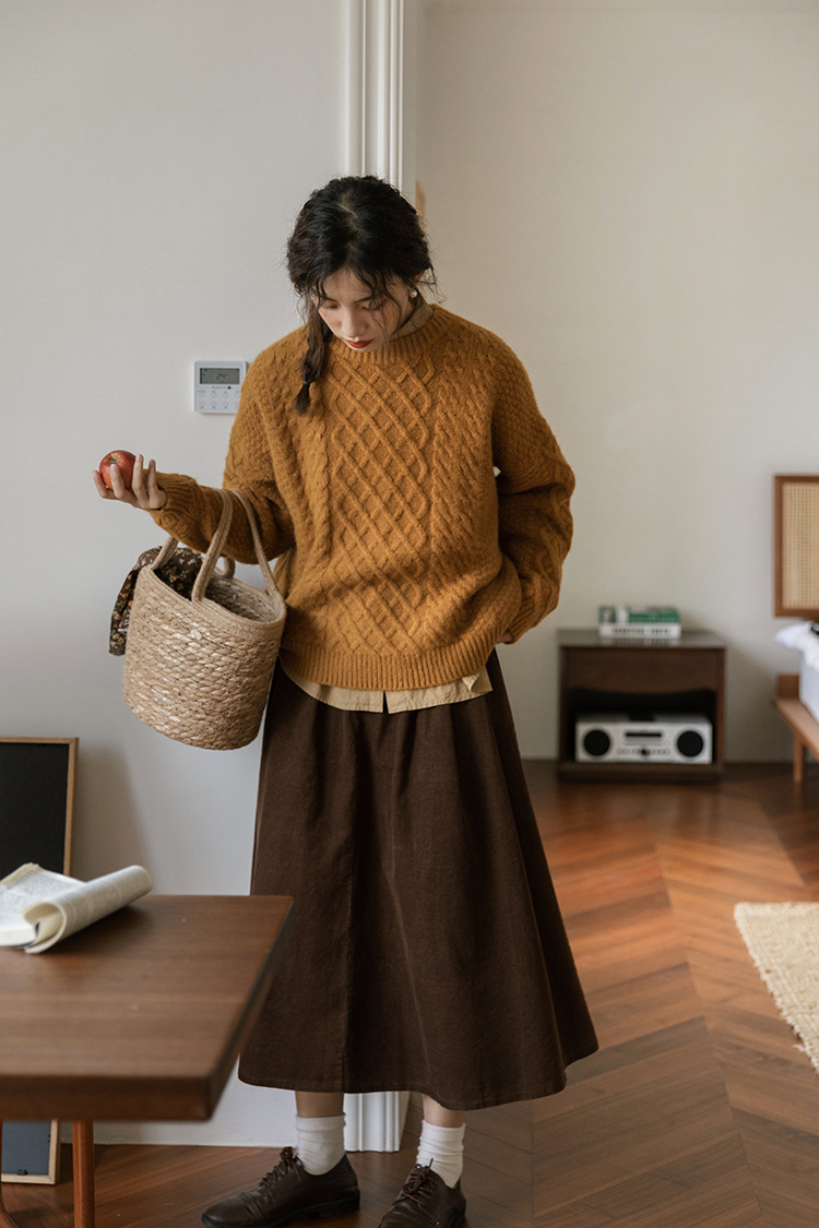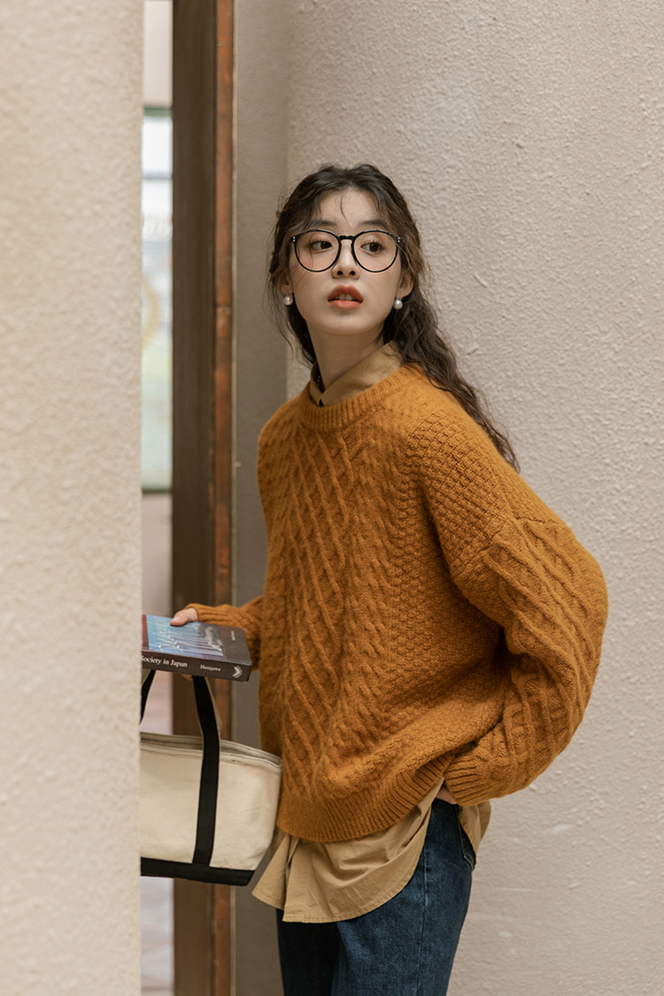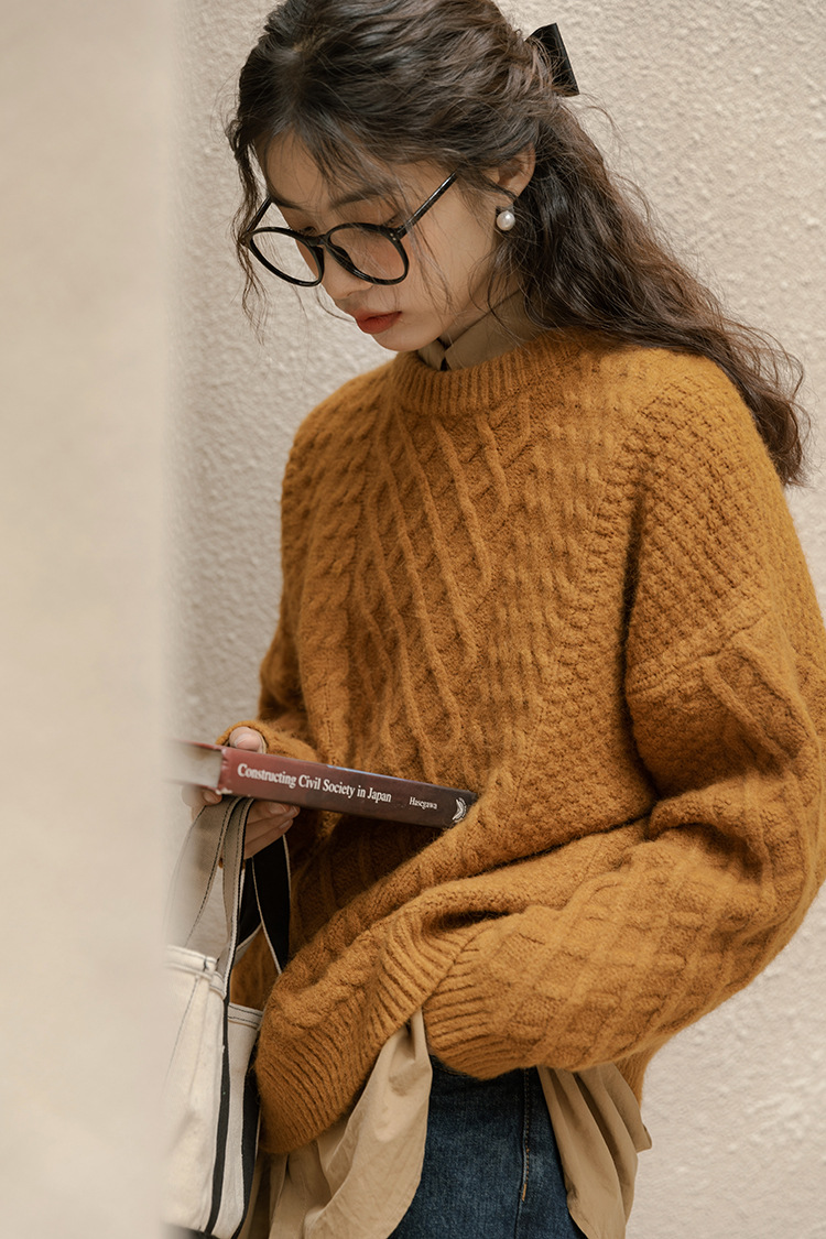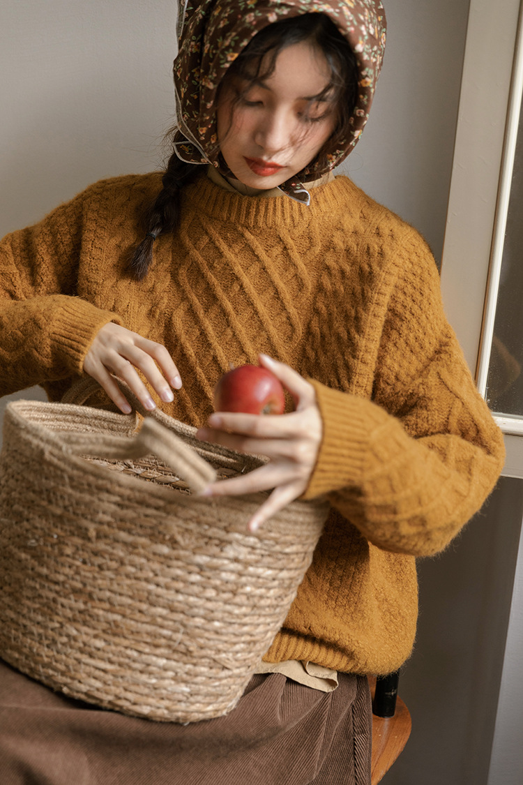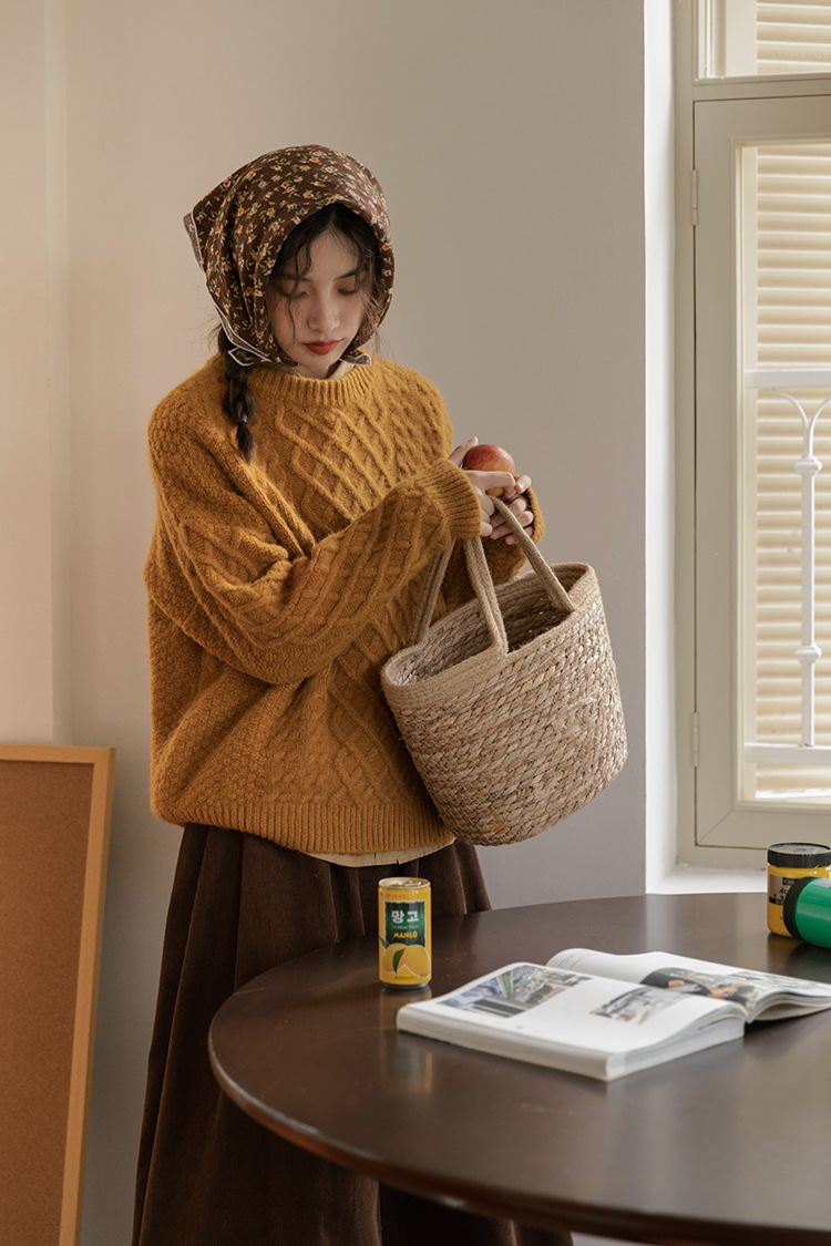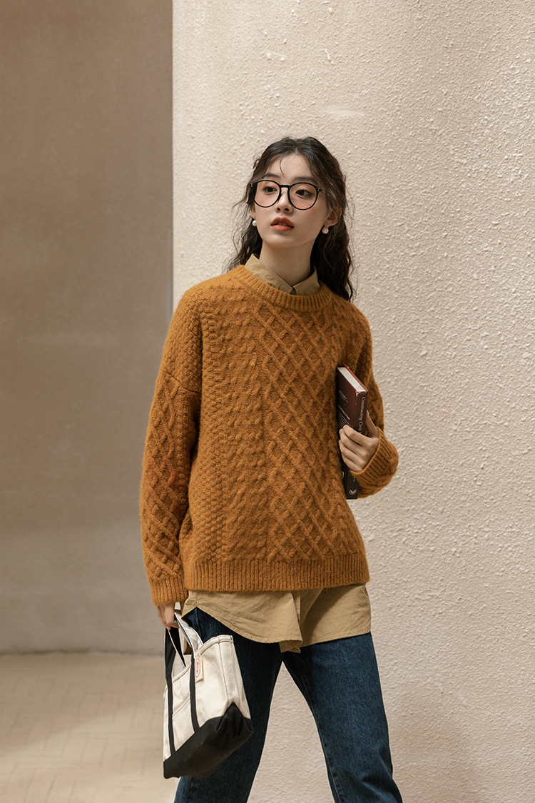 2024 가을과 겨울 새로운 한국 스타일 복고풍 둥근 목 꼬인 다이아몬드 격자 디자인 두꺼운 따뜻한 풀오버 라운드 넥 스웨터 여성용스토어 가기