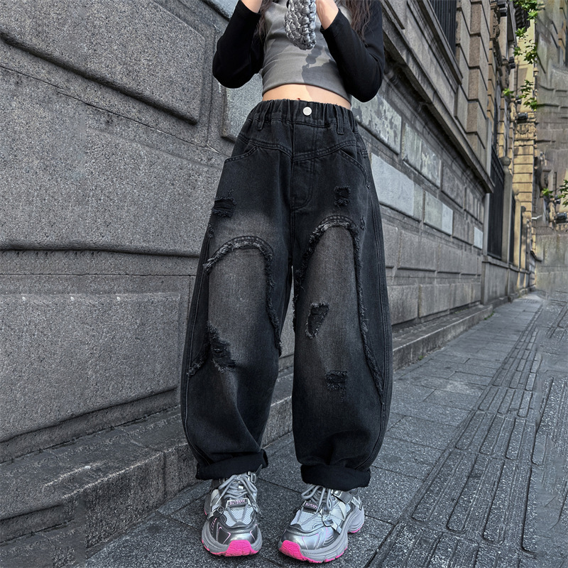 대외 무역 도매 소녀 찢어진 청바지 유행 하렘 바지 2024 새로운 봄과 가을 한국 어린이 컬러 매칭 티셔츠