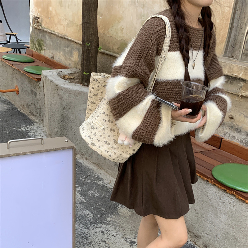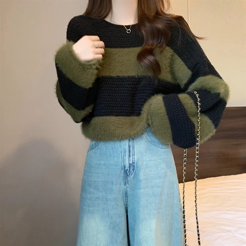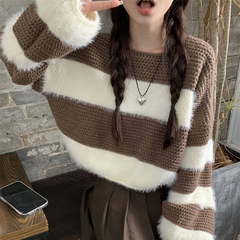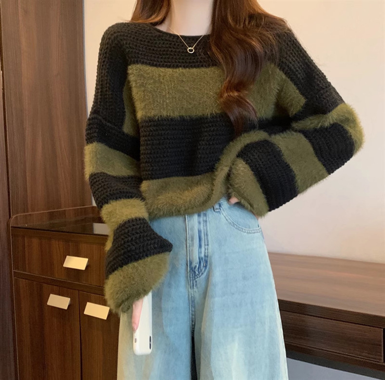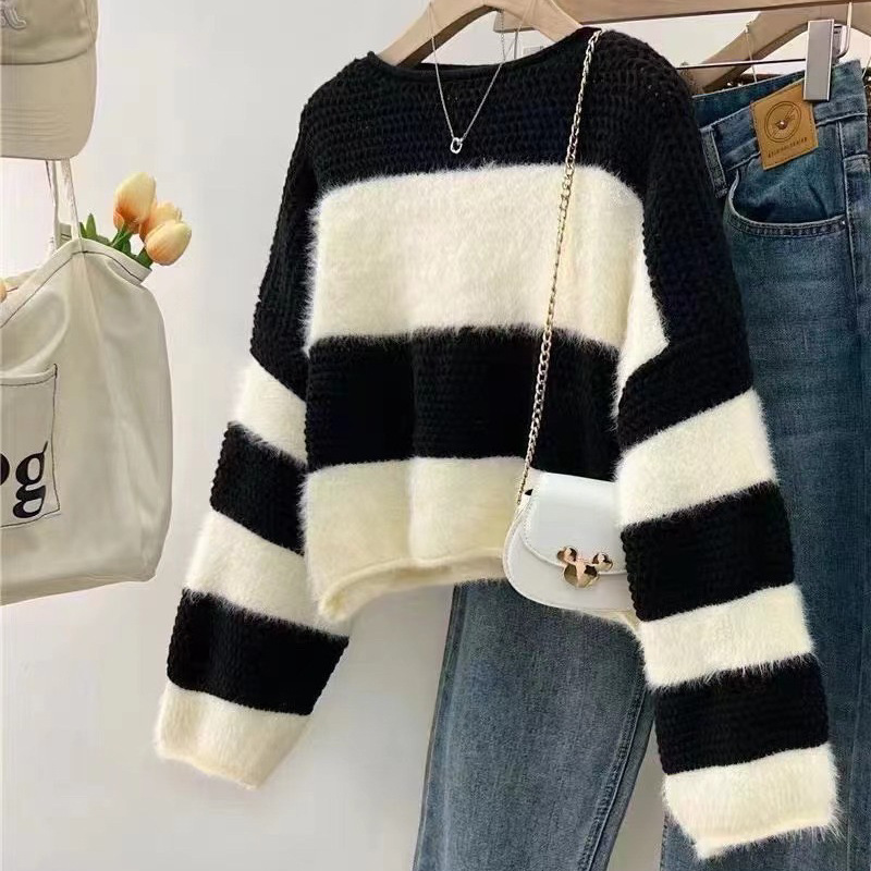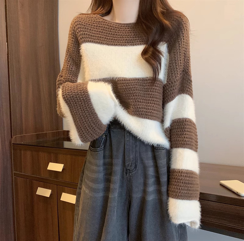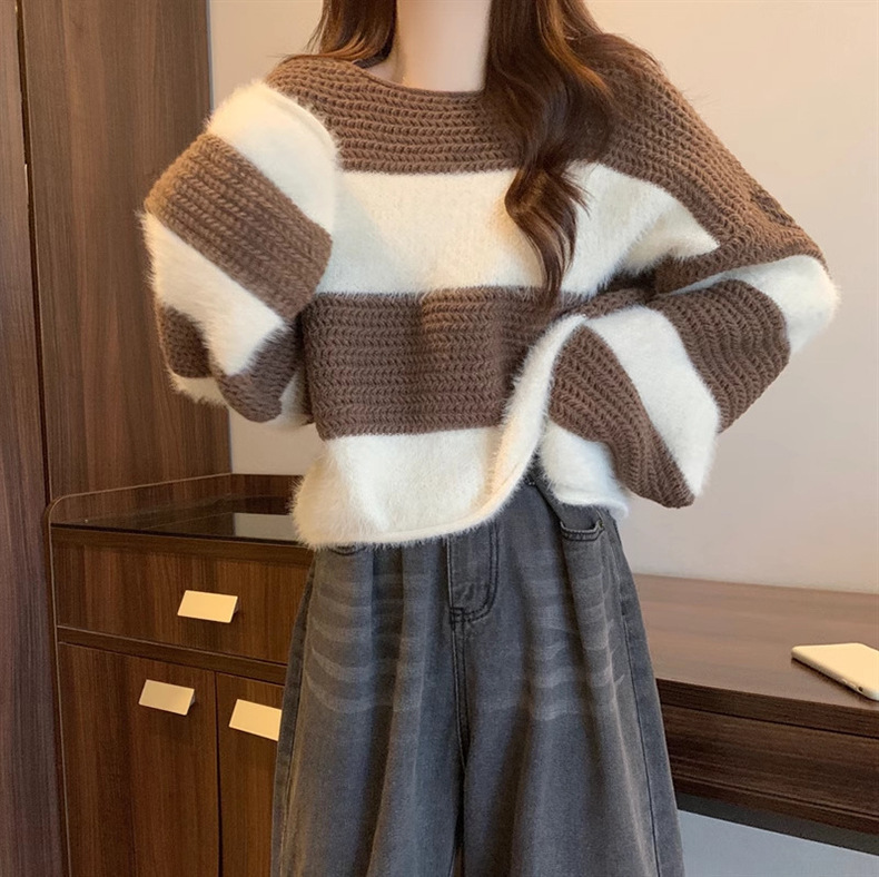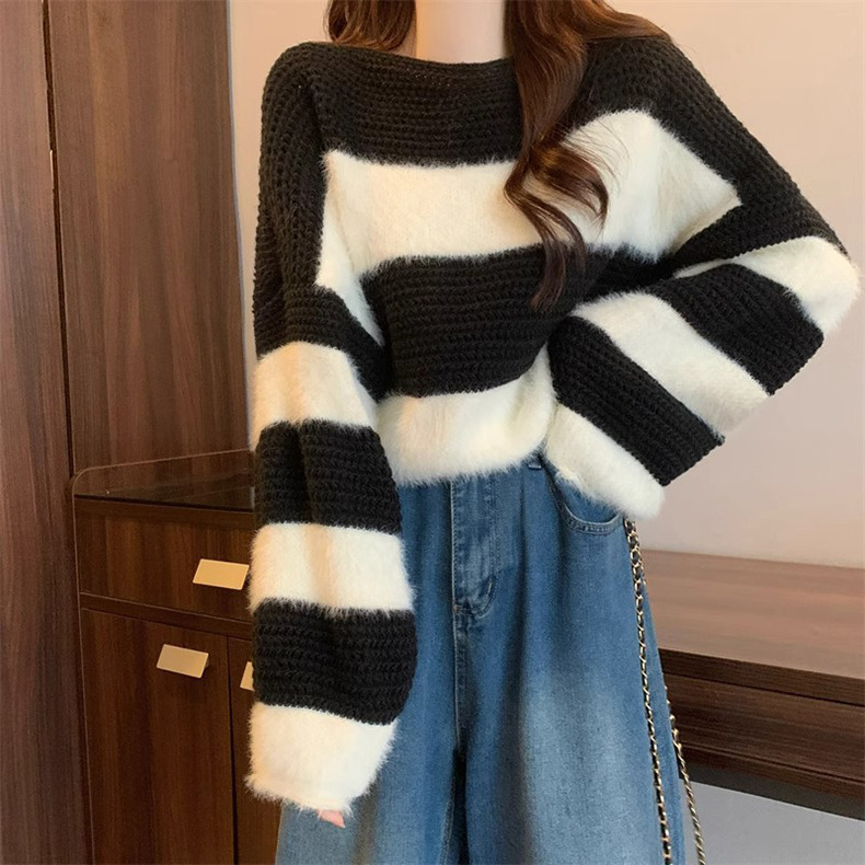 2025 가을 니트 풀오버 여성용 한국 스타일 배색 스트라이프 부드러운 신상 디자인 루즈핏 니트 상의