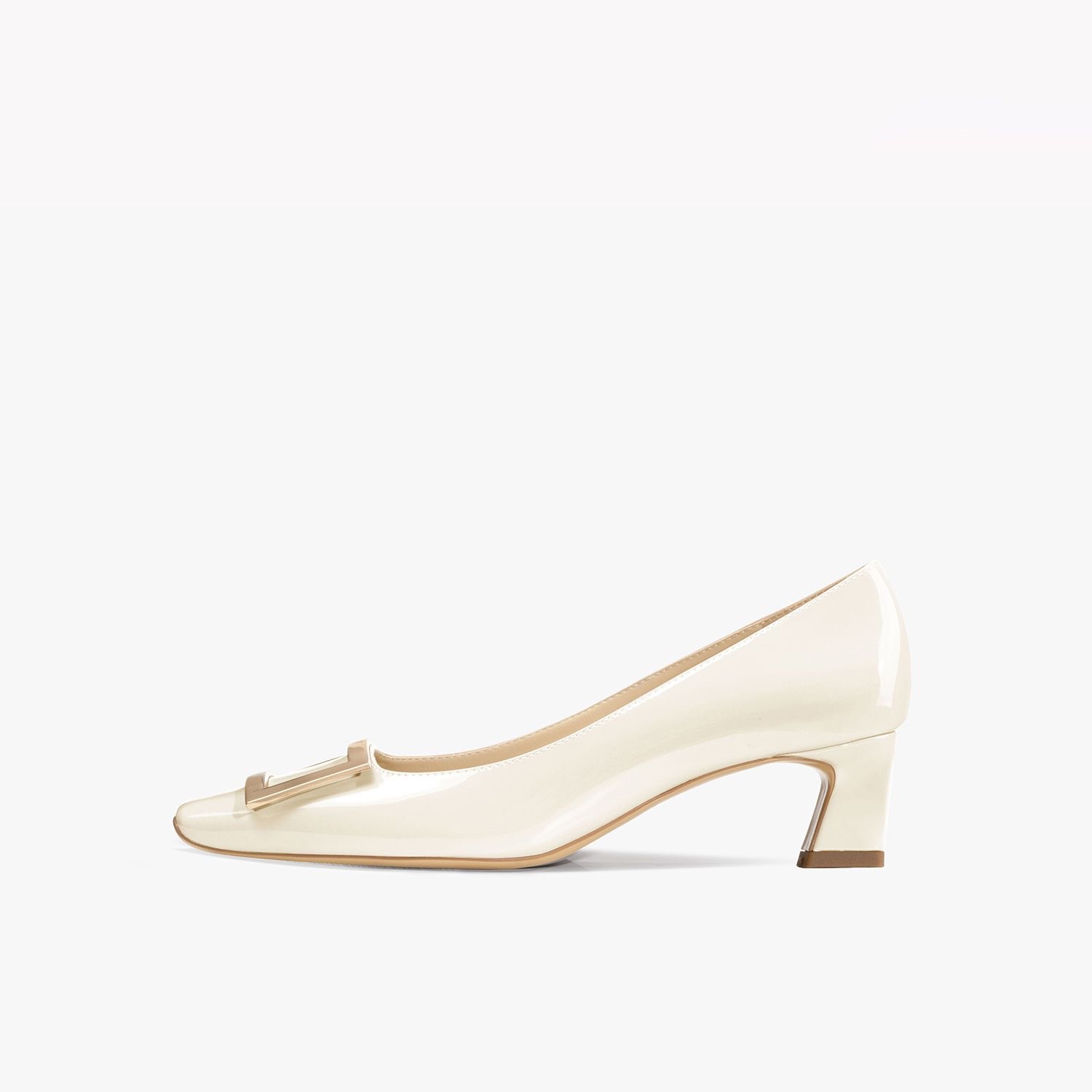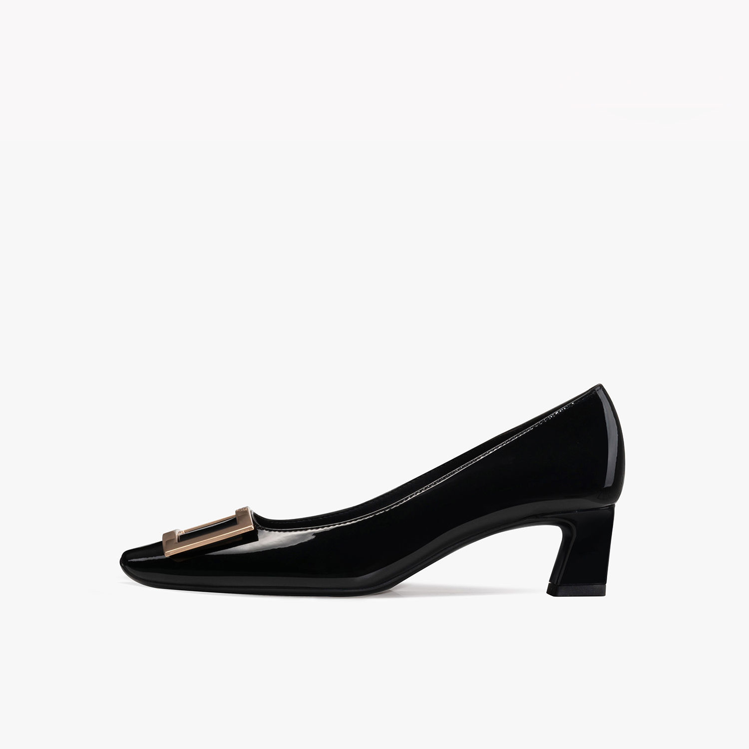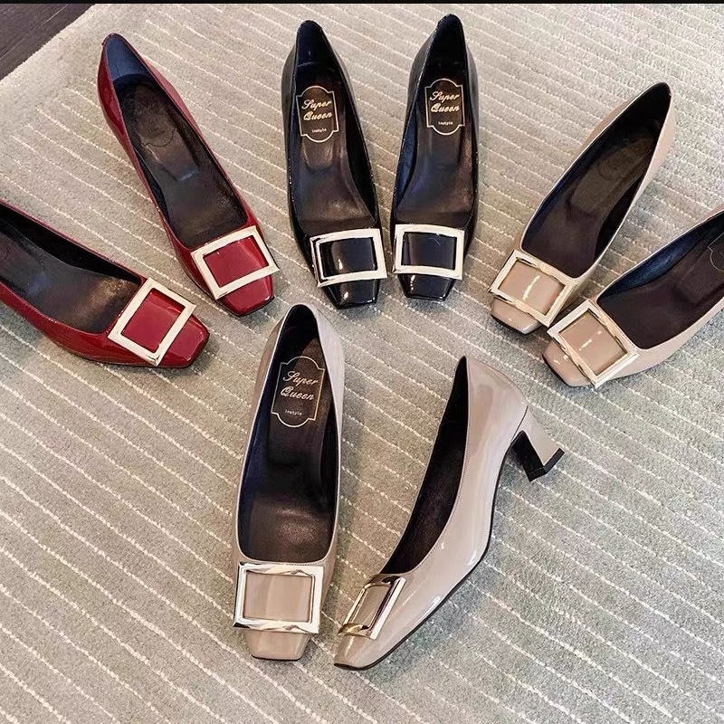 프렌치 스타일 2024 봄 코끼리 그레이 페이턴트 가죽 스퀘어 토 스퀘어 버클 플랫 슈즈 여성 플랫 힐 얕은 입구 우아한 여성 신발 심플스토어 가기