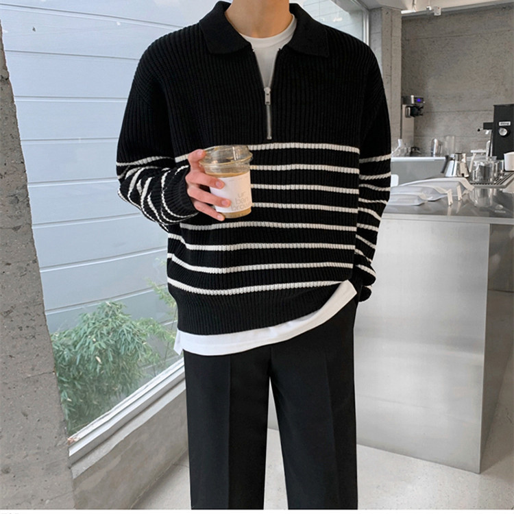 옷깃 하프 지프 폴로 스트라이프 스웨터 남성 패션 스웨터 가을베이스 느슨한 레트로 캐주얼 탑 트렌디
