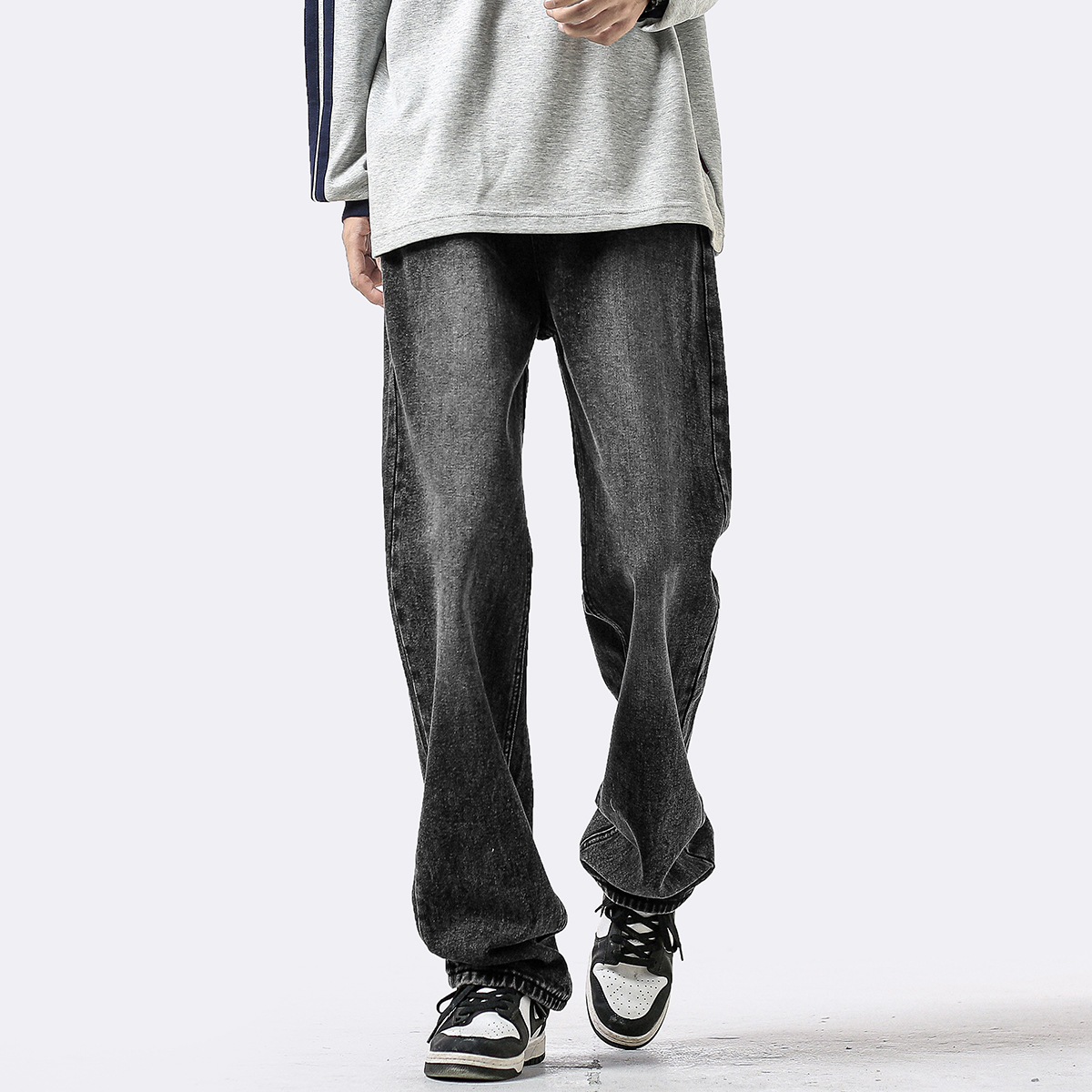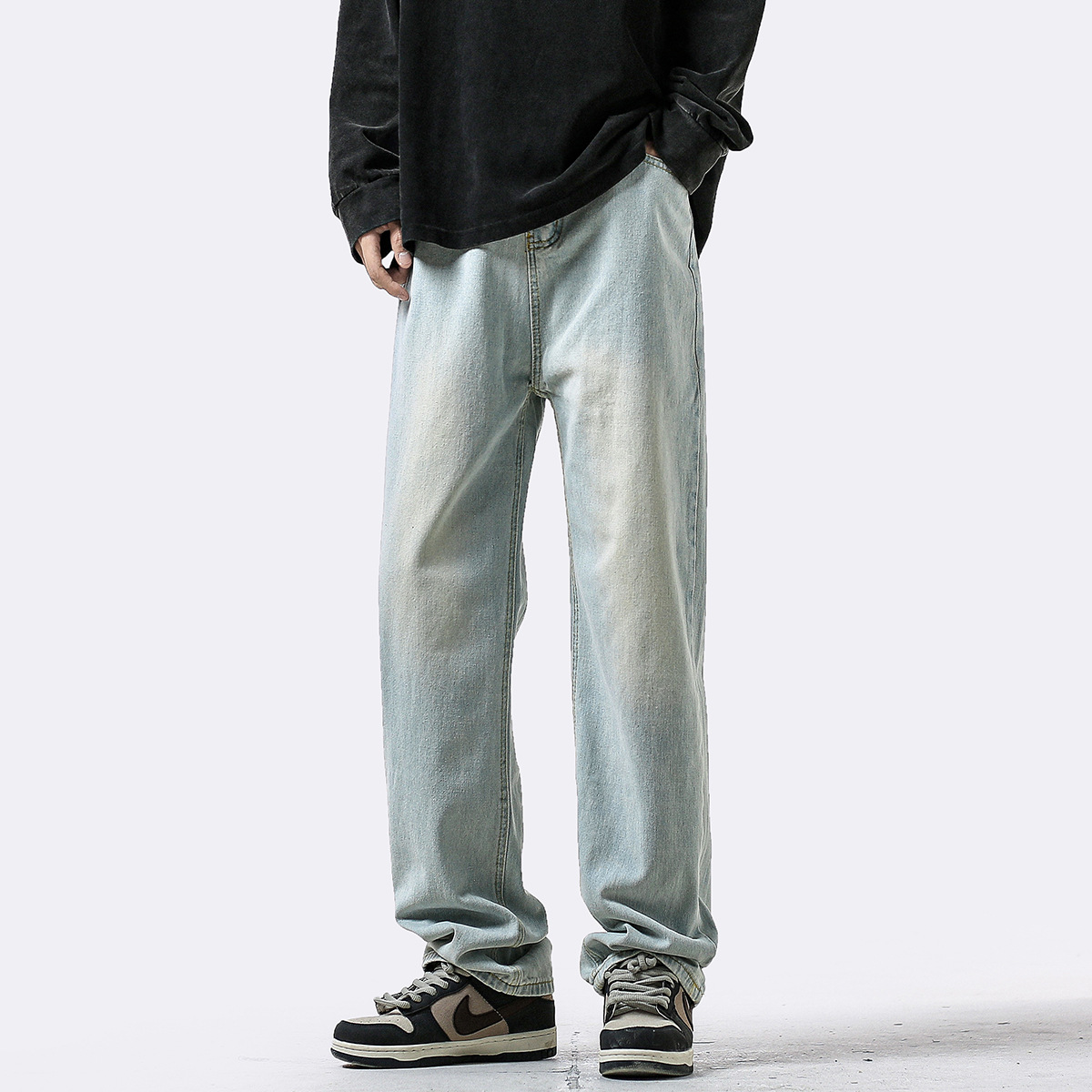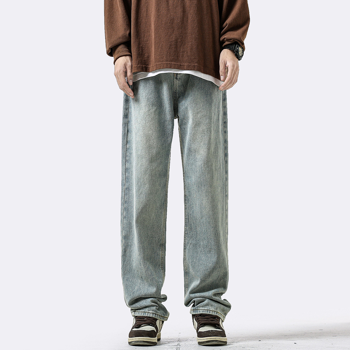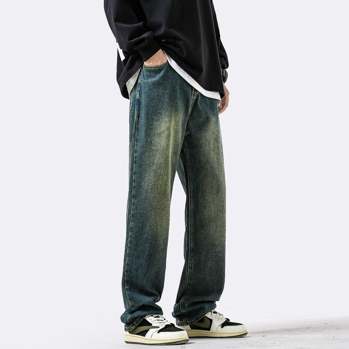 아메리칸 스타일 복고풍 허리 청바지 남자 사계절 새로운 하이 스트리트 스트레이트 바지 유행 브랜드 캐주얼 와이드 레그 바지