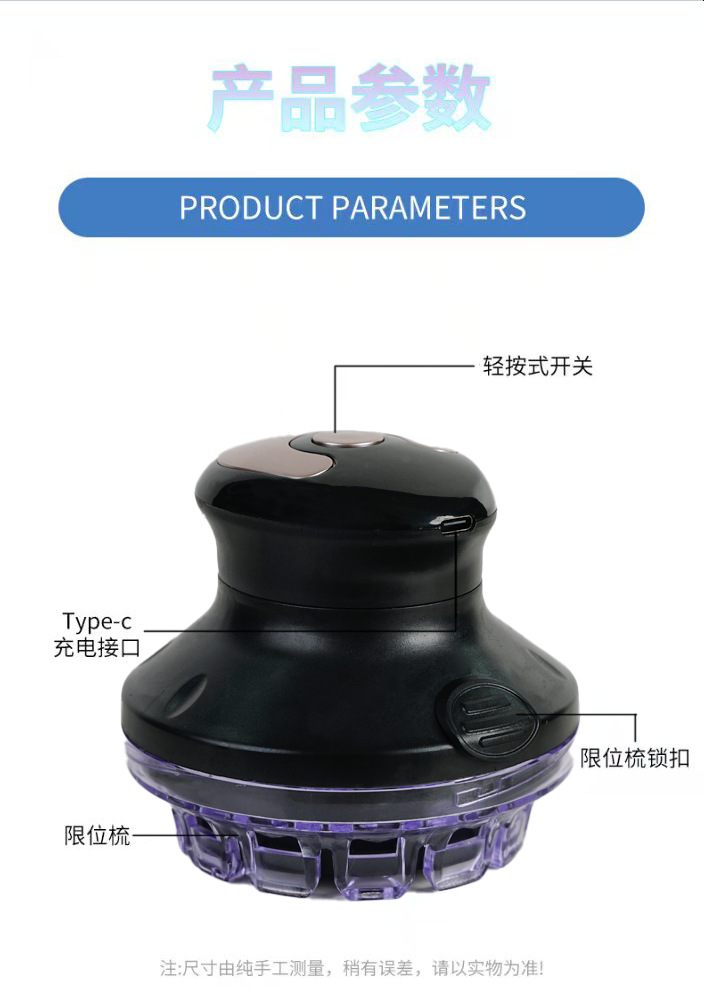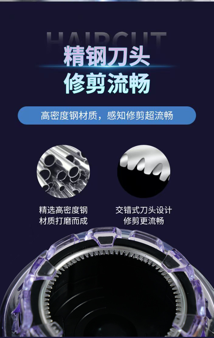 产品配件:彩盒包装+说明书(中英文)+限位梳*2(1号3/6/9.5mm,2号12mm) +USB充电线+润滑油+清洁刷