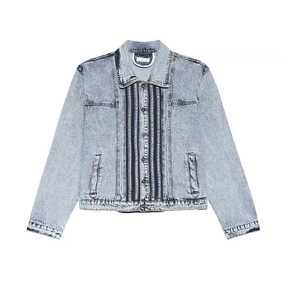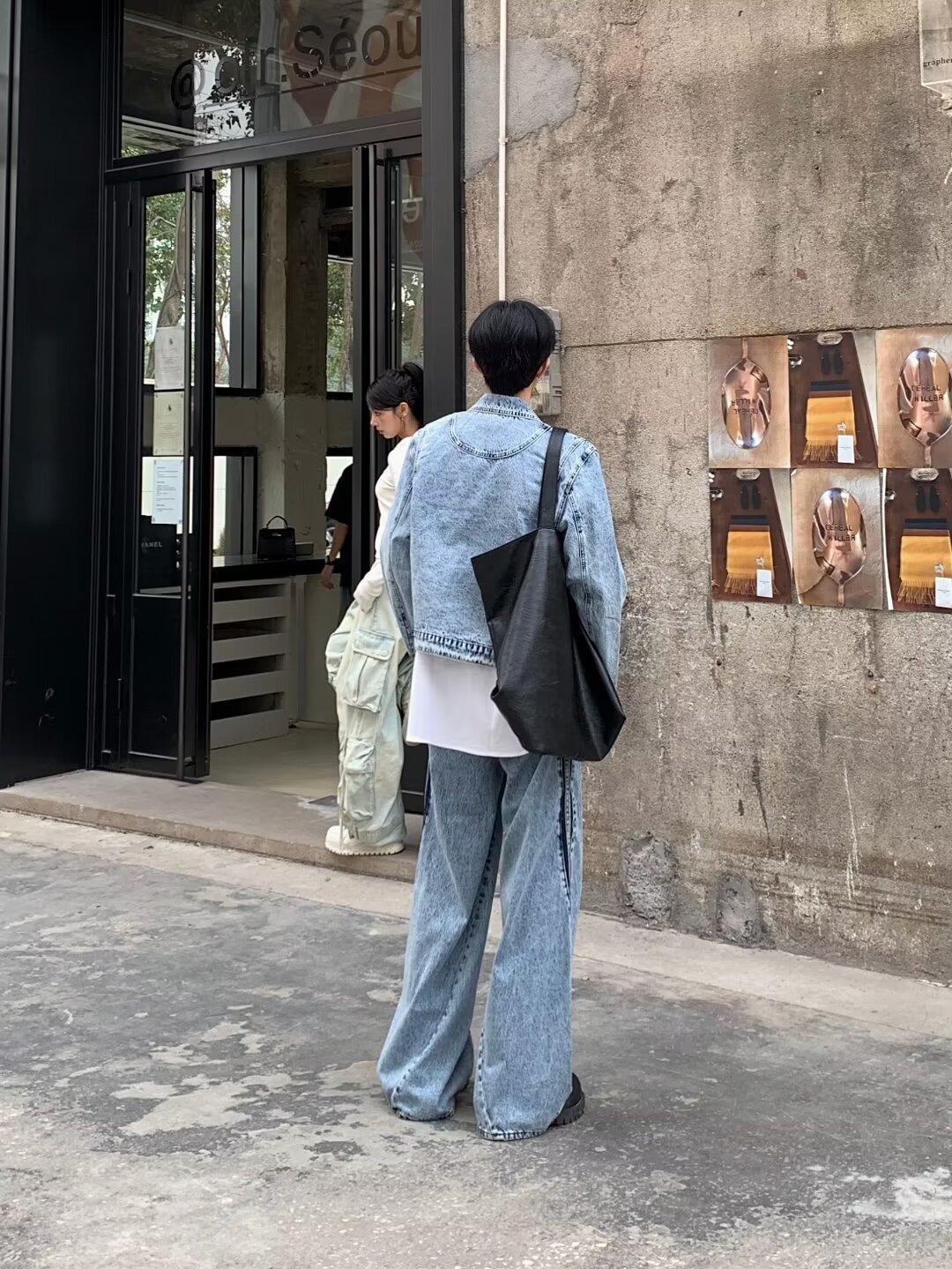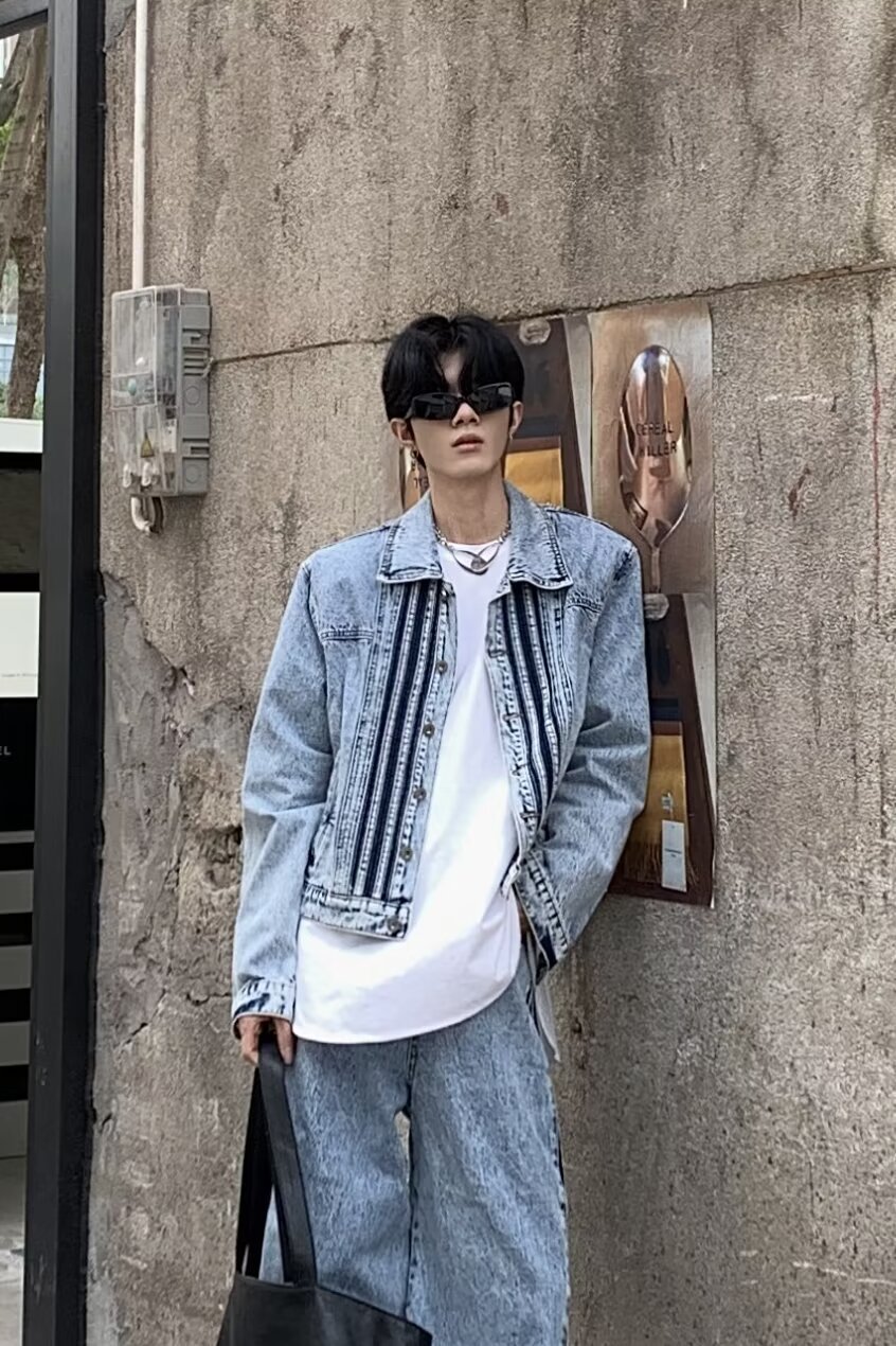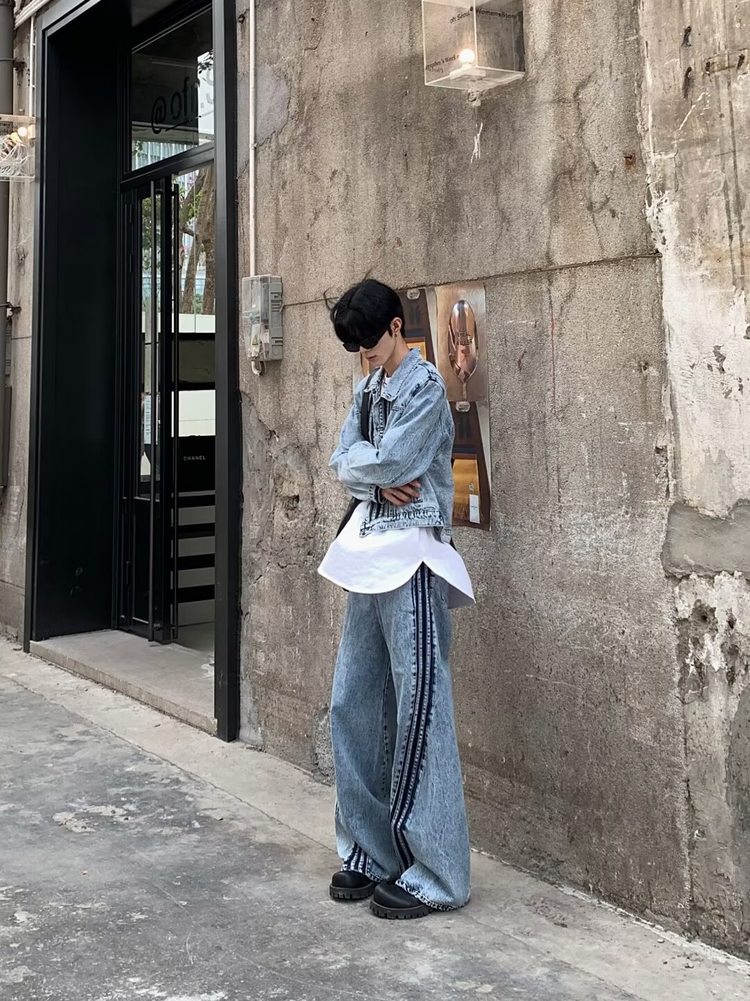 2024 봄 패치 워크 대비 데님 재킷 넓은 다리 바지 남성용 느슨한 세트 미국 복고풍 틈새 투피스 세트스토어 가기
