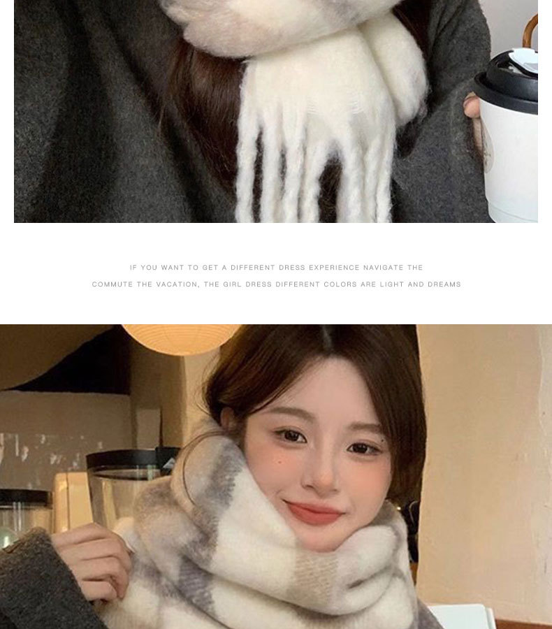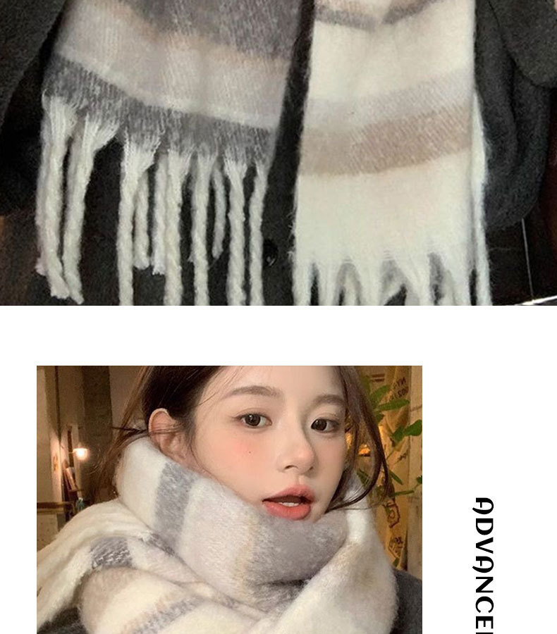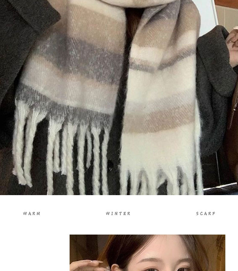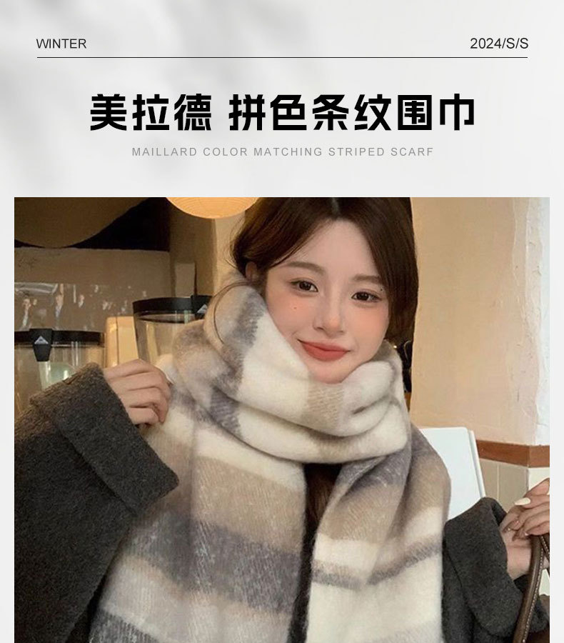 2025 새로운 Maillard 컬러 블록 스트라이프 스카프 여성 가을, 겨울 한국 스타일 다목적 패션 두꺼운 술 스카프 트렌드스토어 가기