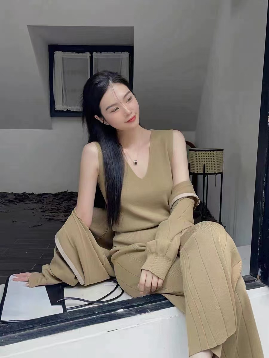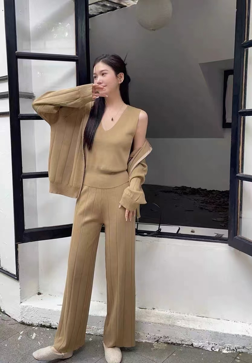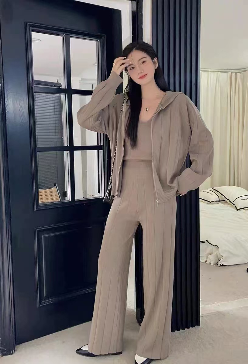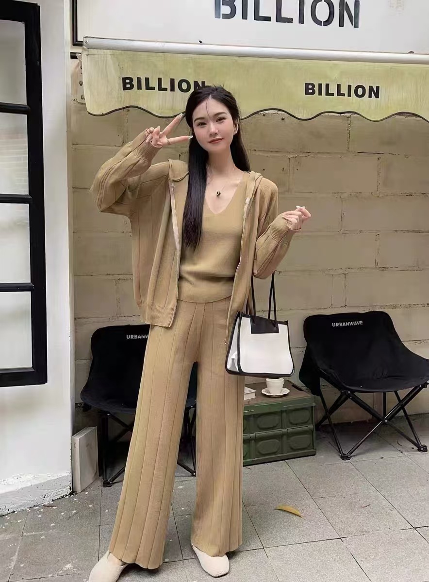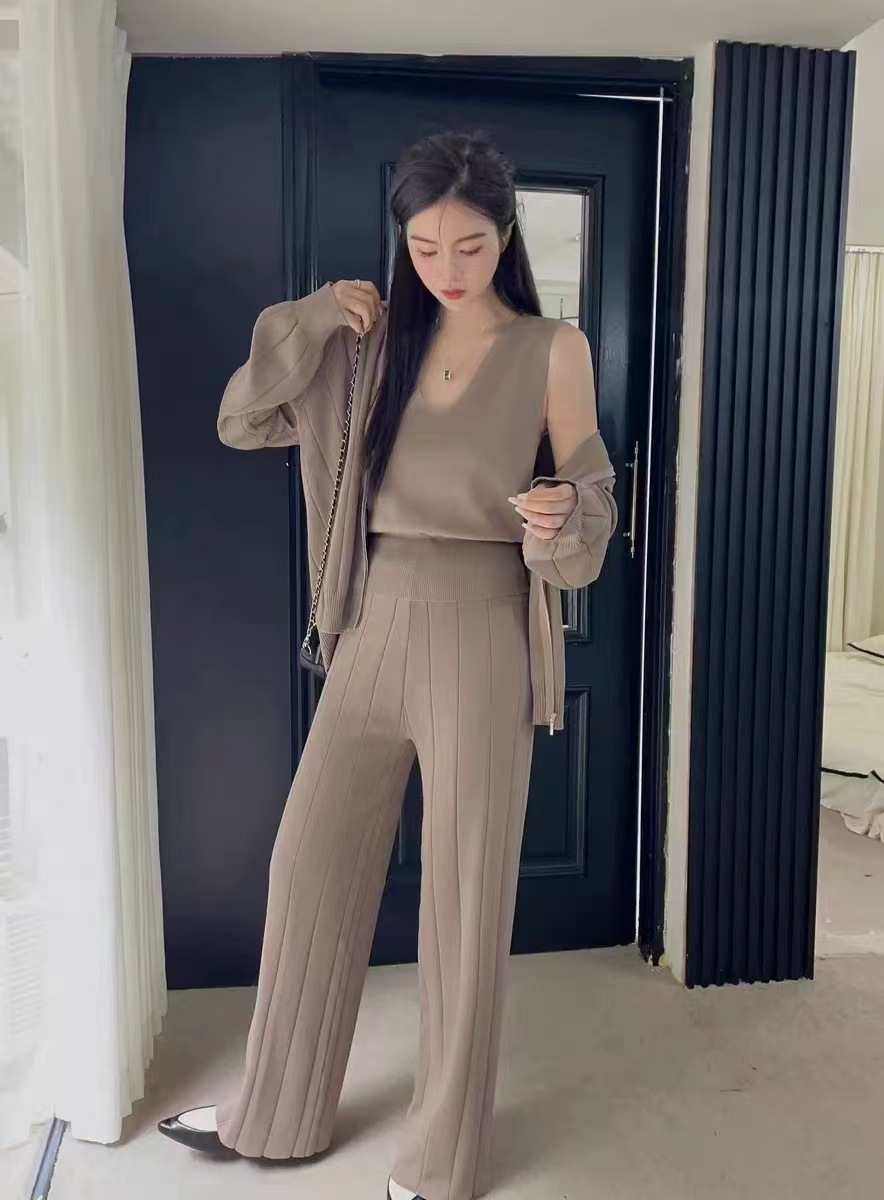 국경 간 패션 니트 세트 여성 2024 가을과 겨울 새 코트 캐미솔 + 높은 허리 넓은 다리 바지 3 피스 세트스토어 가기