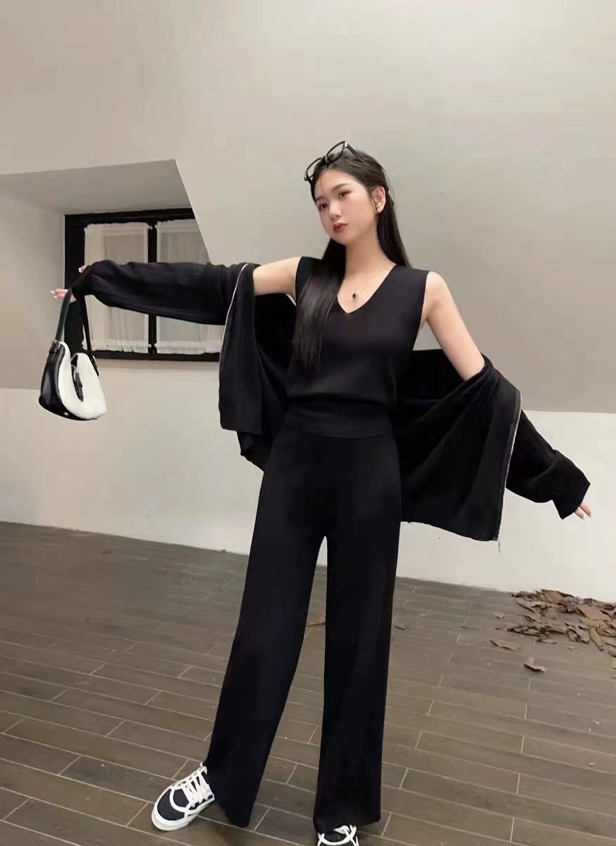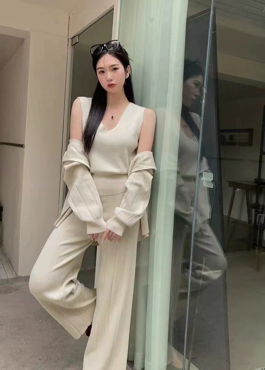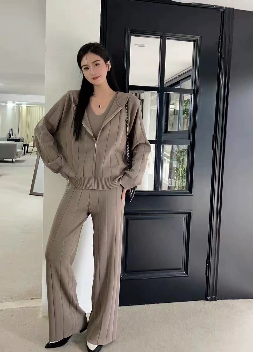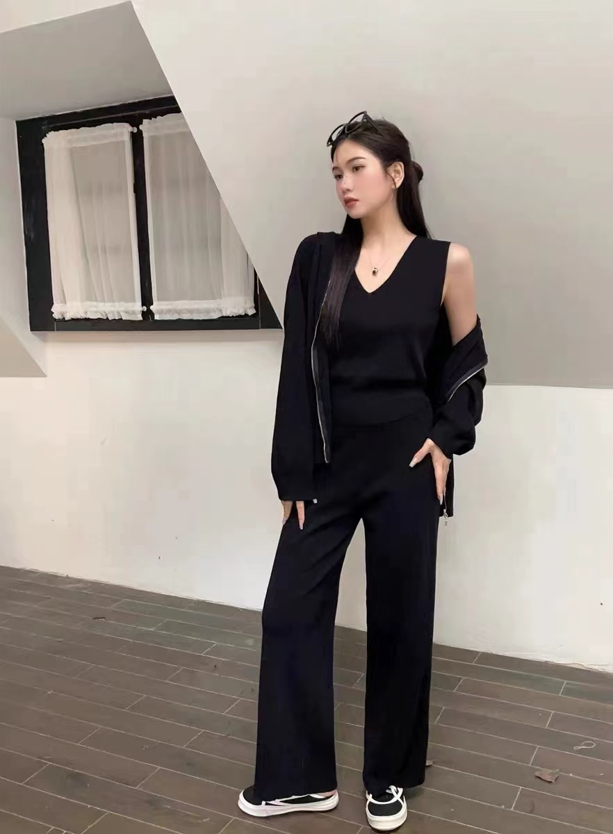 국경 간 패션 니트 세트 여성 2024 가을과 겨울 새 코트 캐미솔 + 높은 허리 넓은 다리 바지 3 피스 세트스토어 가기