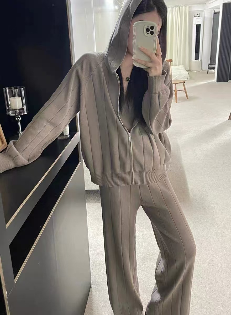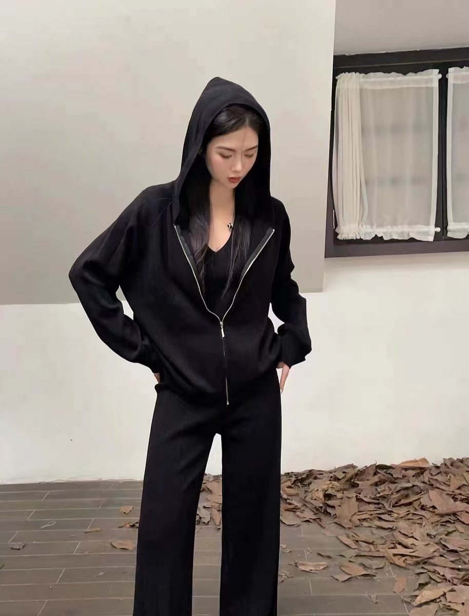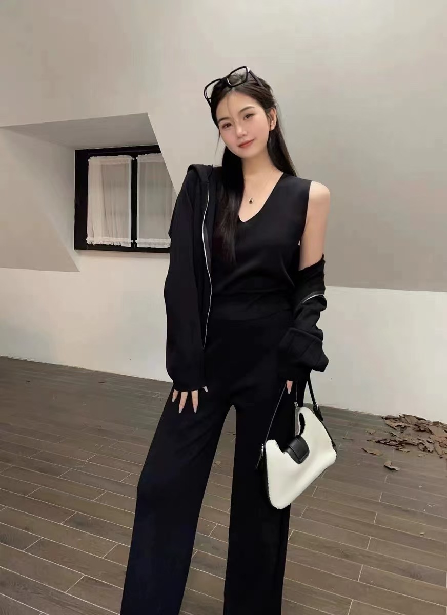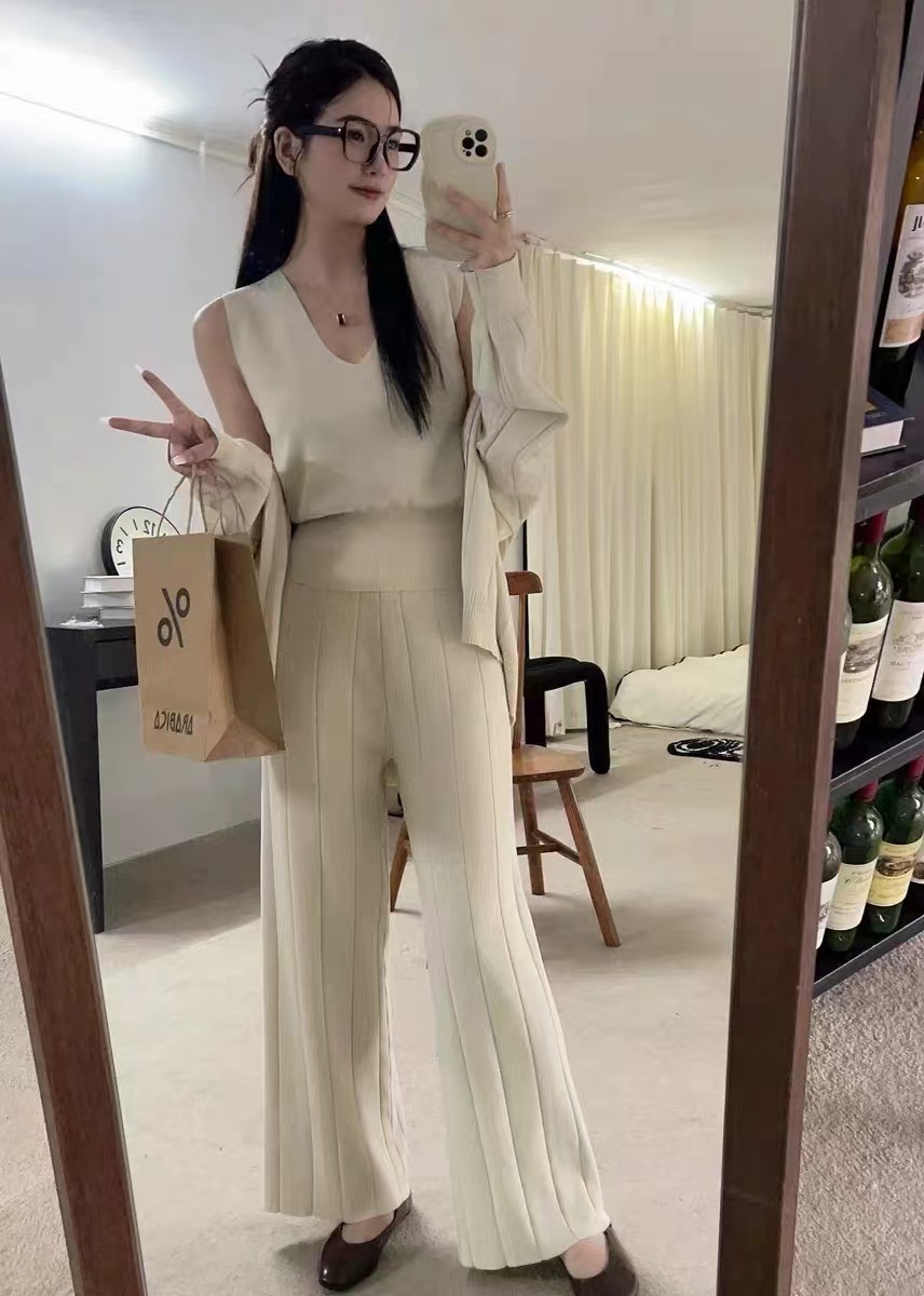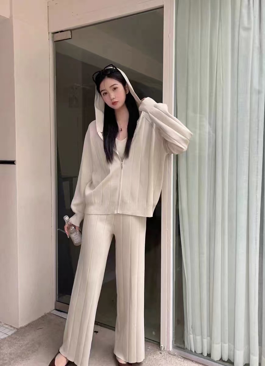 국경 간 패션 니트 세트 여성 2024 가을과 겨울 새 코트 캐미솔 + 높은 허리 넓은 다리 바지 3 피스 세트스토어 가기