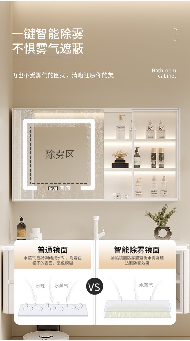 • 세라믹 일체형 세면대 + 완전 밀폐형 스마트 거울 캐비닛 상하 조명 -90CM(설치 포함)