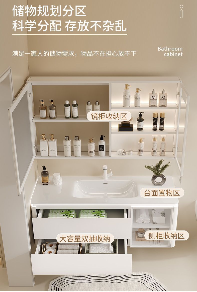 • 세라믹 일체형 세면대 + 완전 밀폐형 스마트 거울장 - 80CM (설치 포함)