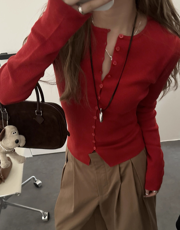 2025 신제품은 부드럽고 편안하며 멀티 버튼 디자인이 특징입니다! 여성용 라운드넥 니트 가디건 가을 슬리밍 탑