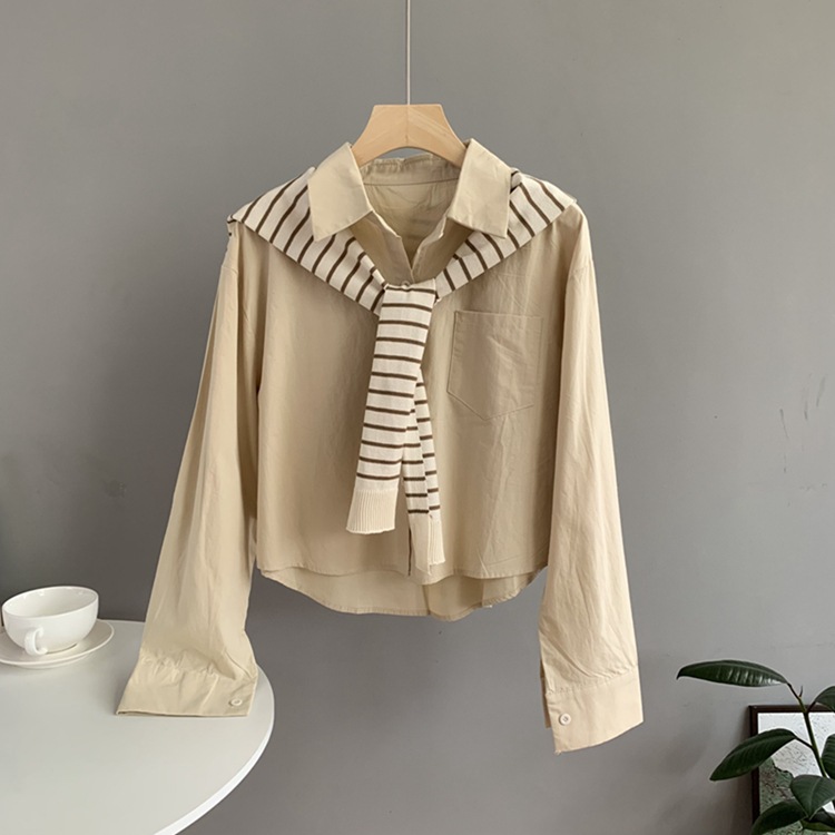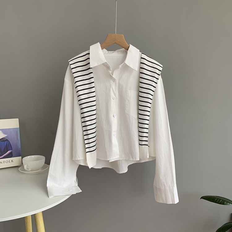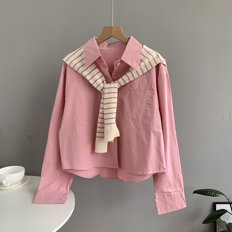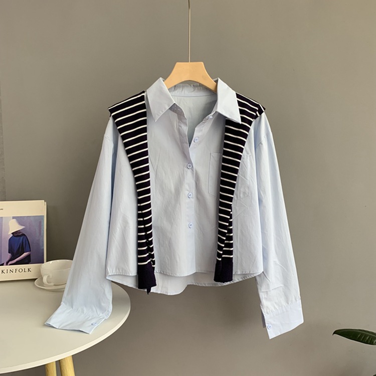 메이이시에 2024 가을 신상 한국 스타일 문예풍 심플 투피스 스트라이프 숄 여성 셔츠 세트