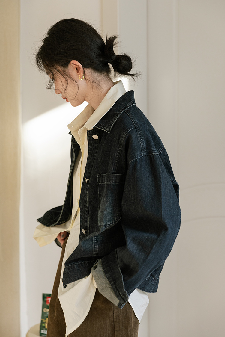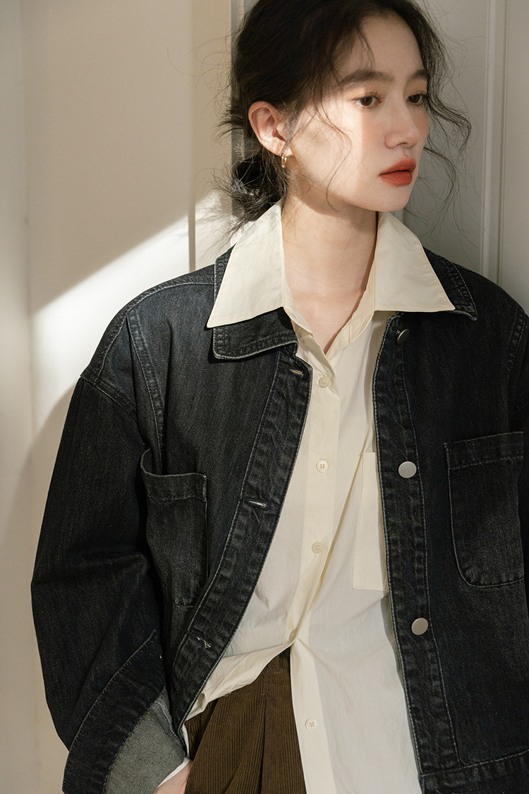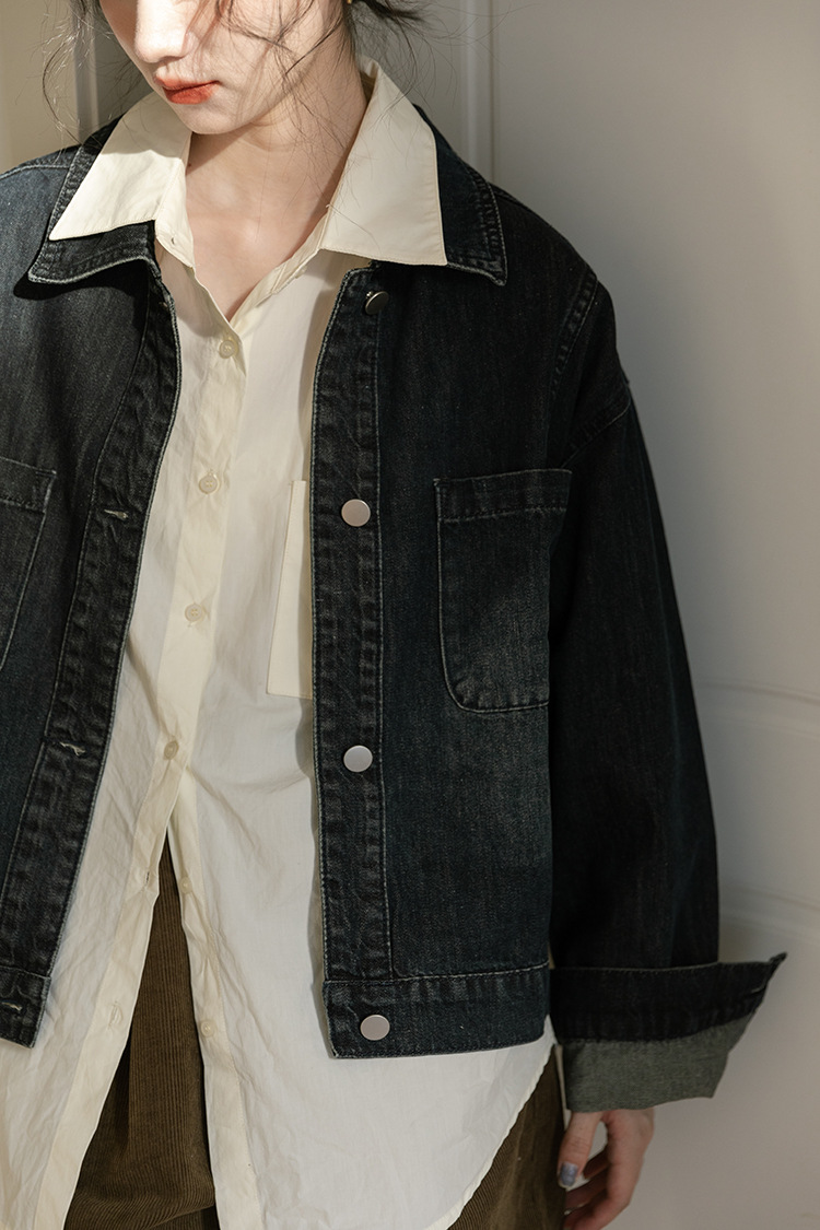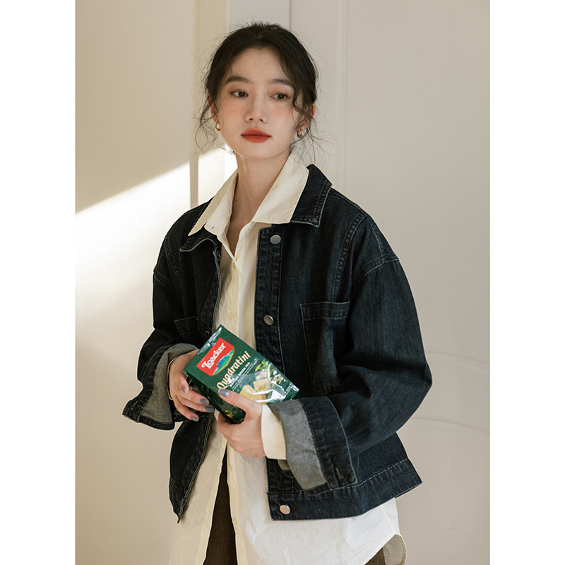 가을 2024 새로운 Ins 홍콩 스타일 세련된 맞춤형 디자인 블랙 데님 재킷 짧은 재킷스토어 가기
