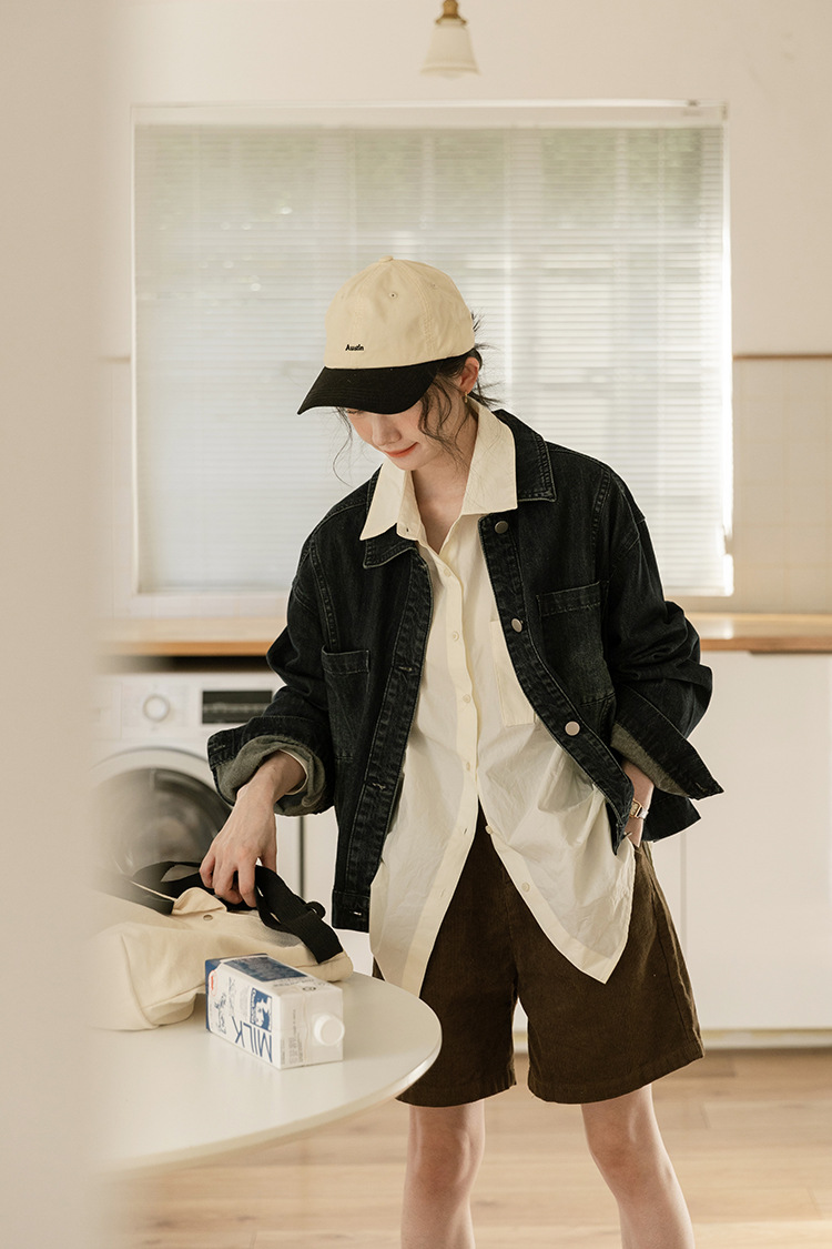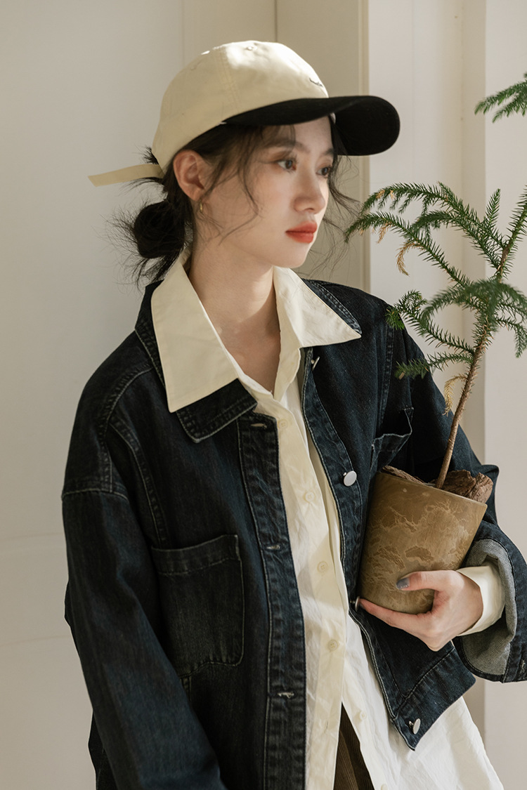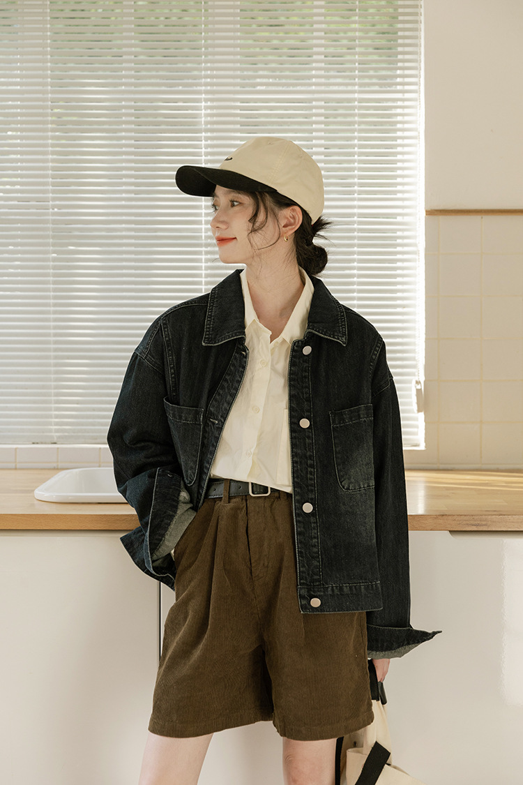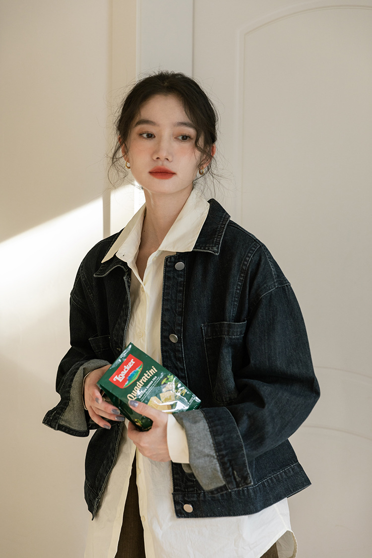 가을 2024 새로운 Ins 홍콩 스타일 세련된 맞춤형 디자인 블랙 데님 재킷 짧은 재킷스토어 가기