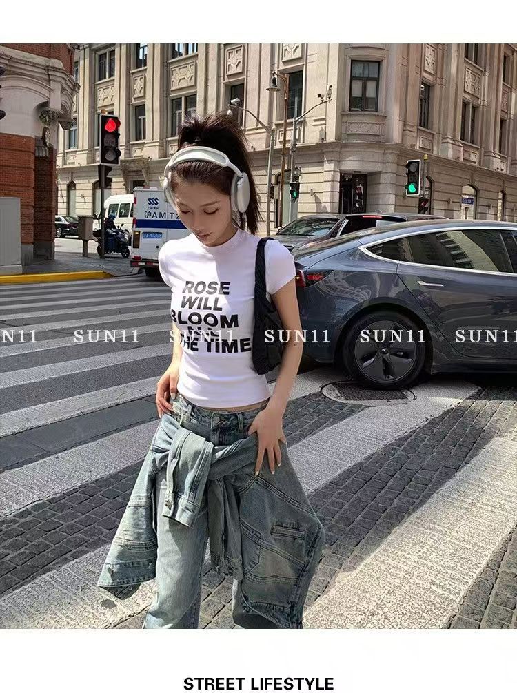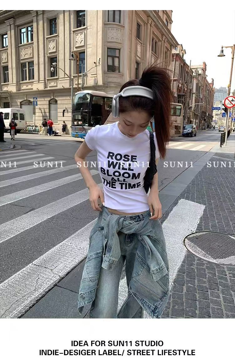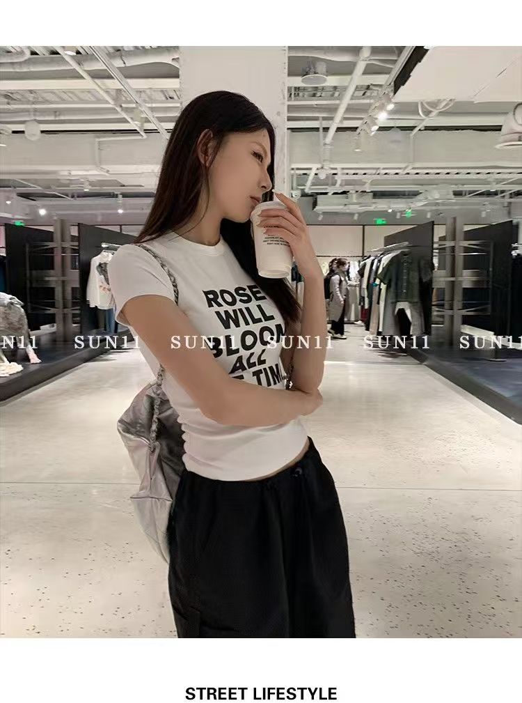 여름 여성을 위한 아메리칸 레트로 레터 프린트 반팔 티셔츠 새로운 디자인 틈새 화이트 슬림핏 탑