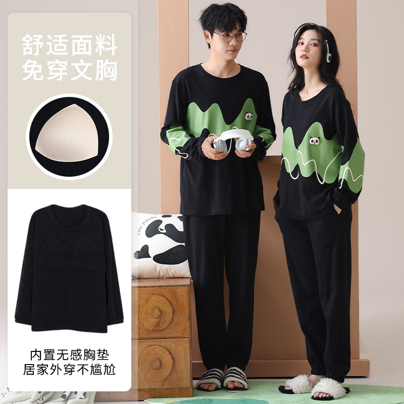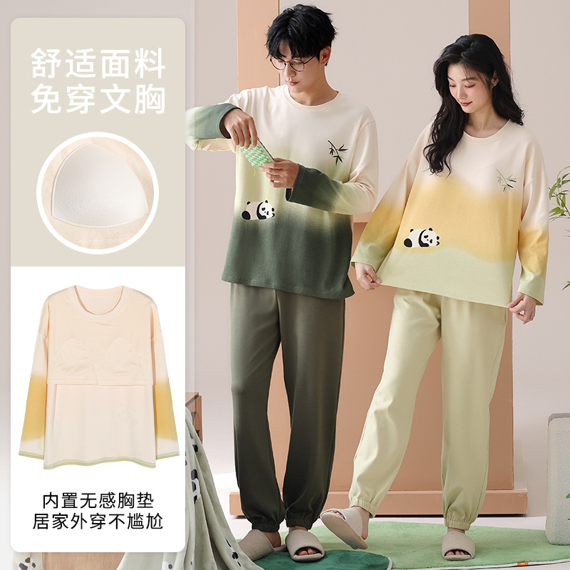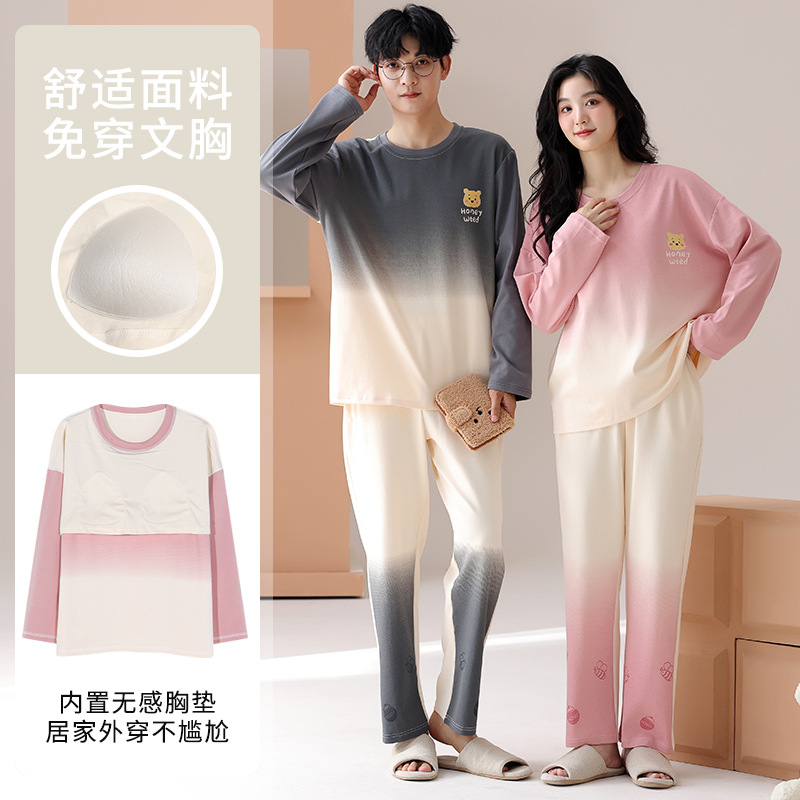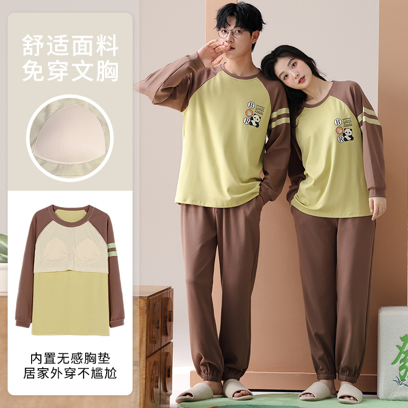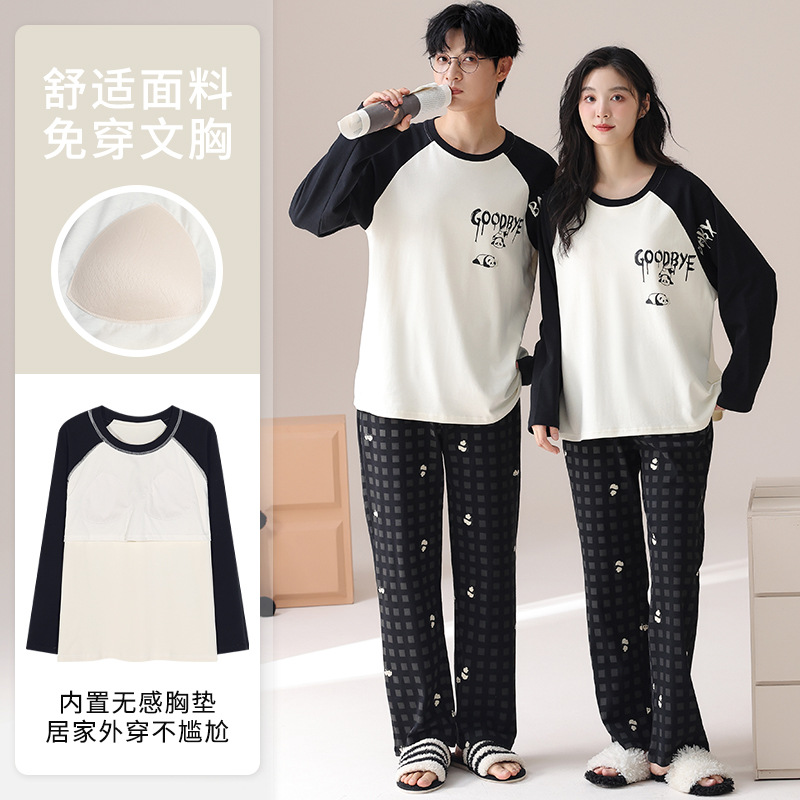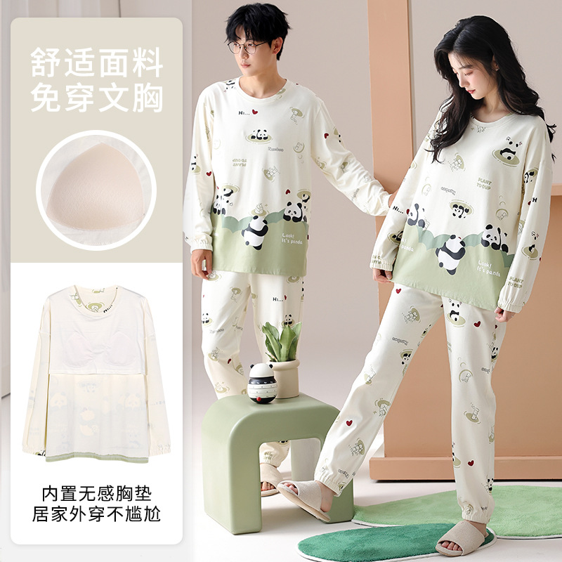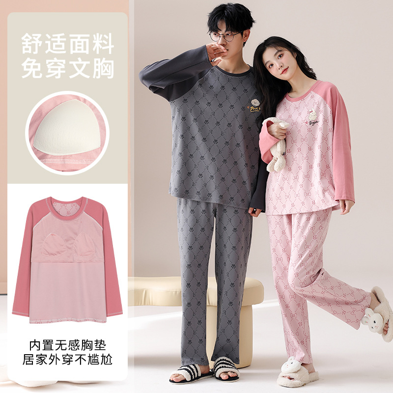 봄과 가을 순면 커플 잠옷 여자 봄 긴 소매 바지 세트 가슴 패드와 함께 캐주얼 만화 잠옷을 입을 수 있습니다스토어 가기