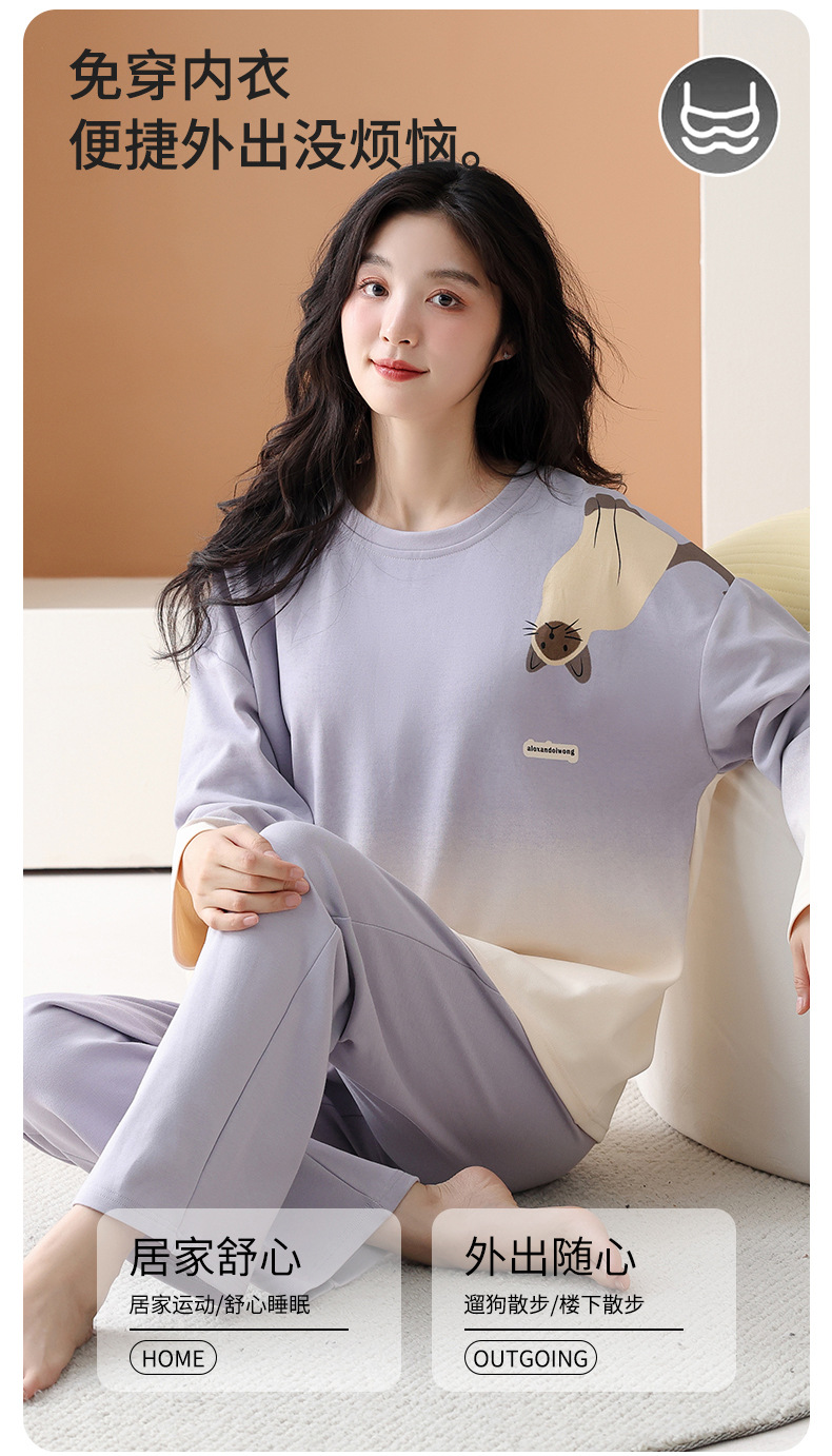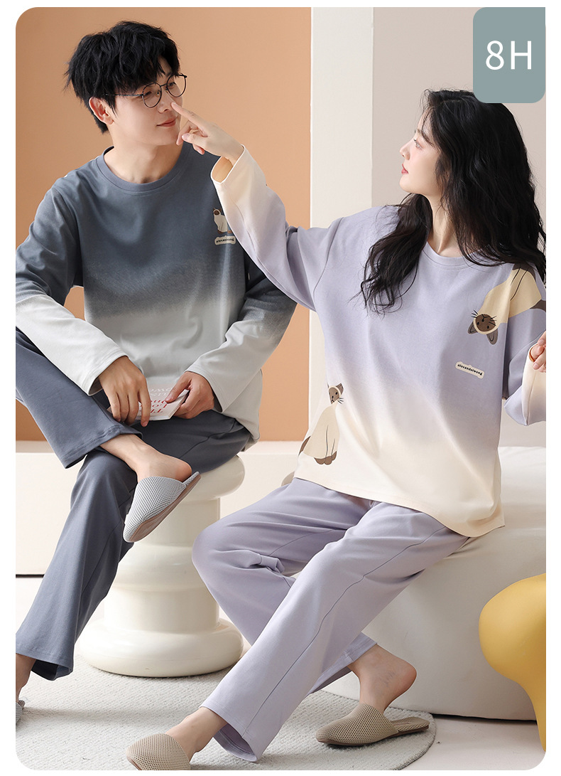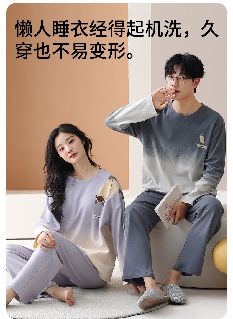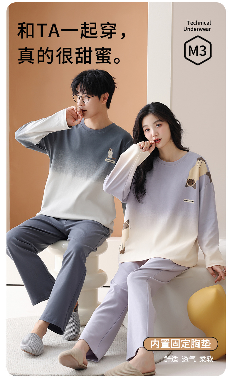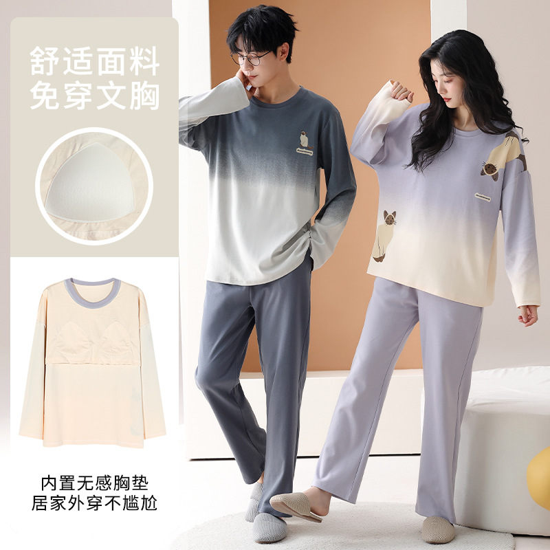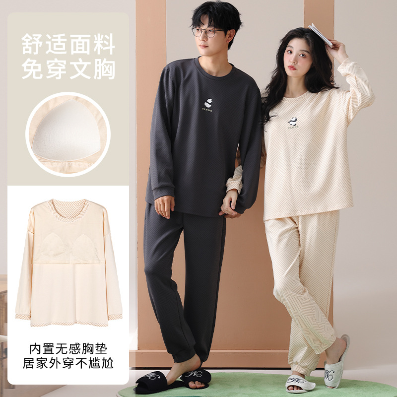 봄과 가을 순면 커플 잠옷 여자 봄 긴 소매 바지 세트 가슴 패드와 함께 캐주얼 만화 잠옷을 입을 수 있습니다스토어 가기