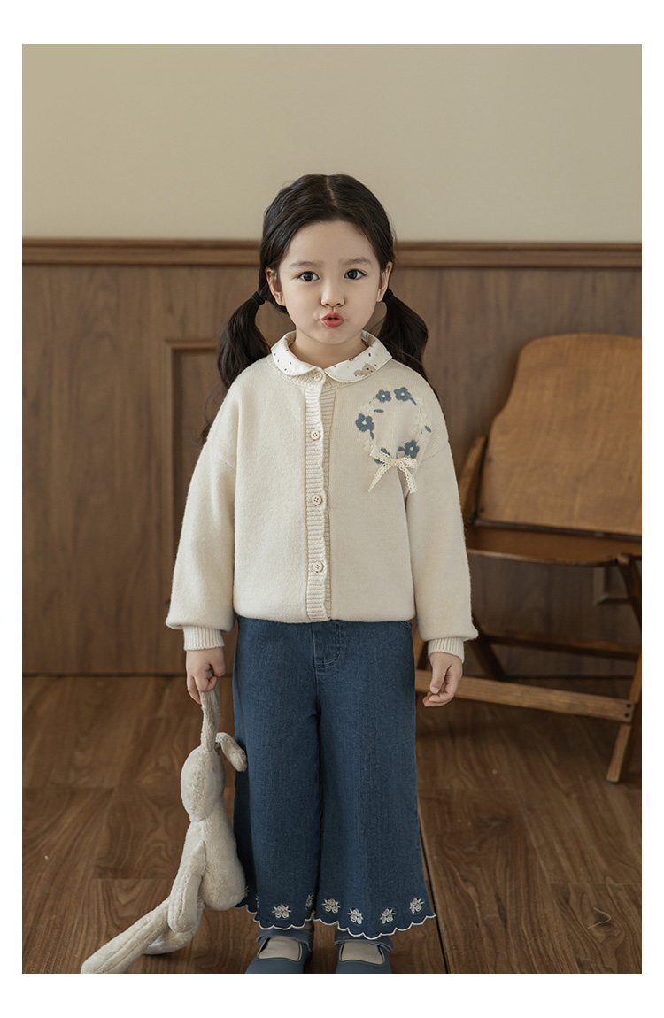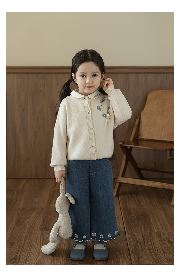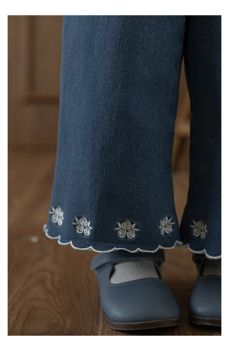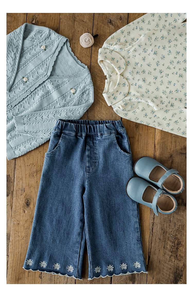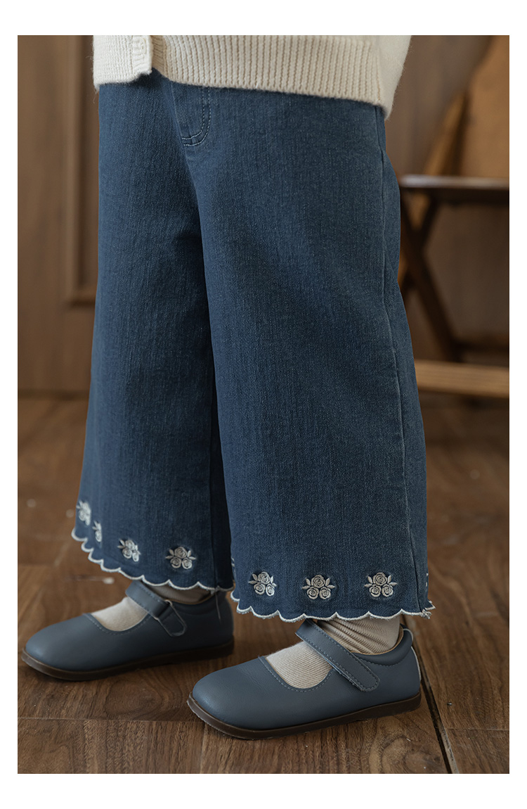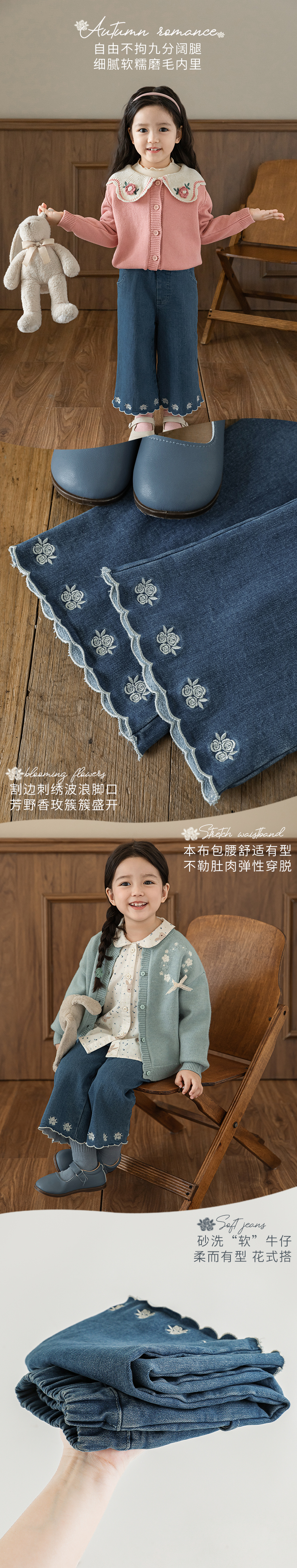 Wulibu 여아용 자수 레이스 청바지 2025 가을 어린이용 생기 넘치는 귀여운 9부 와이드 팬츠스토어 가기