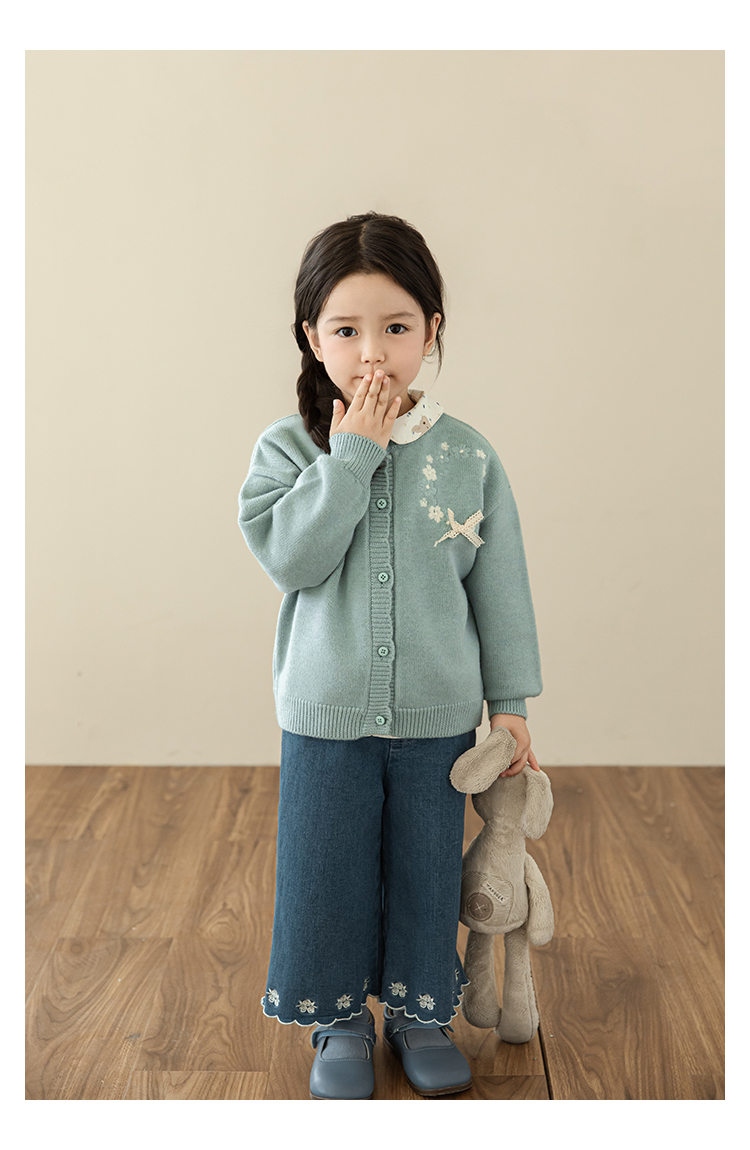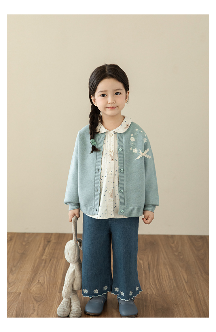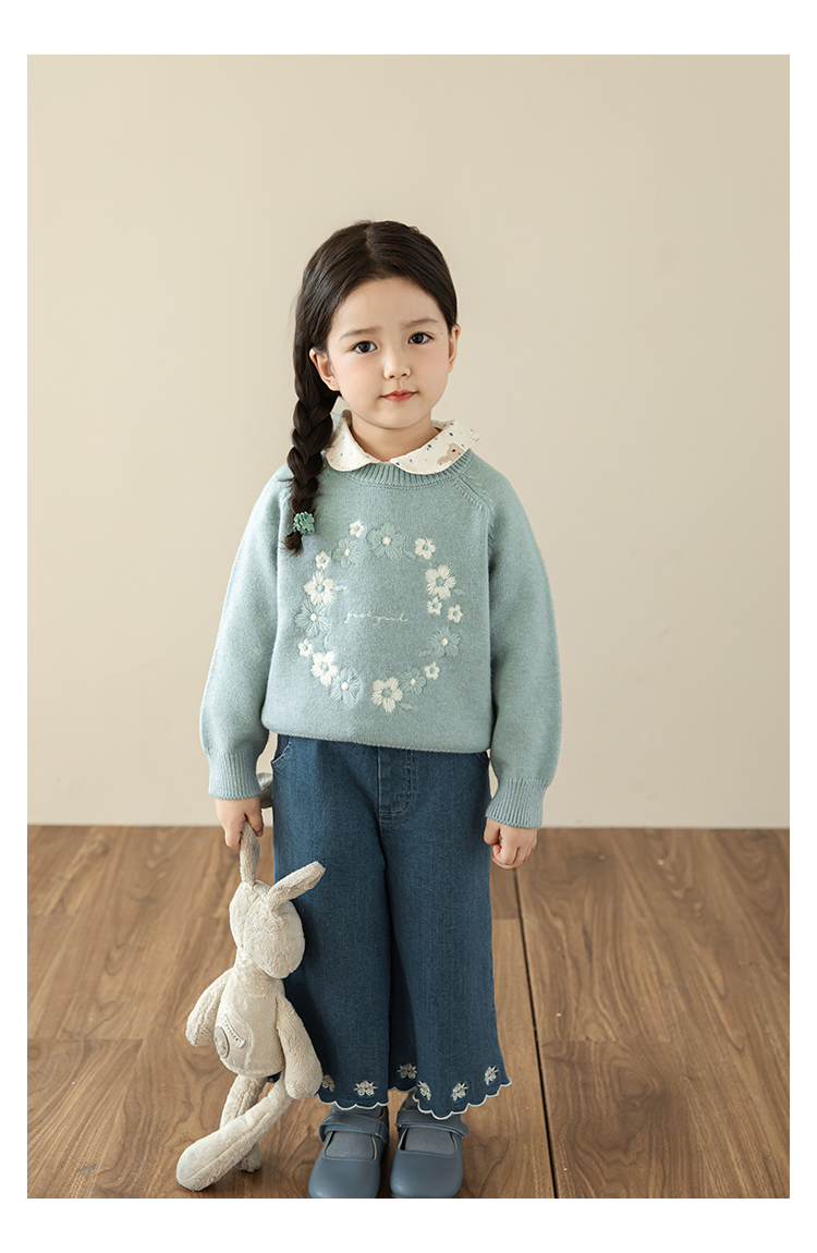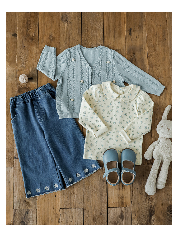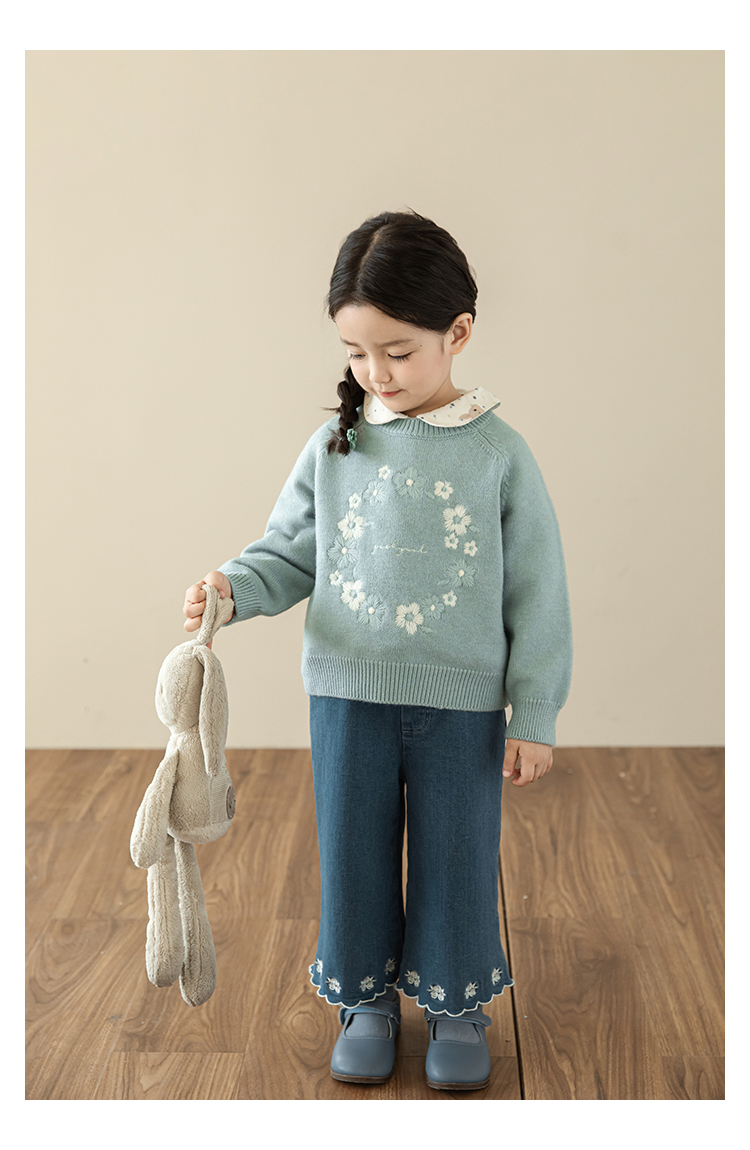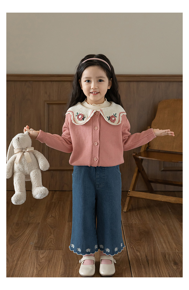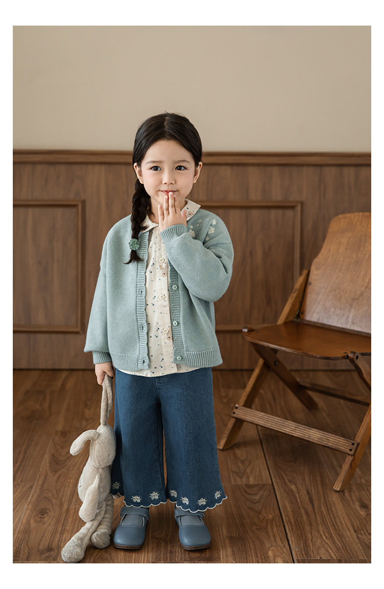 Wulibu 여아용 자수 레이스 청바지 2025 가을 어린이용 생기 넘치는 귀여운 9부 와이드 팬츠스토어 가기