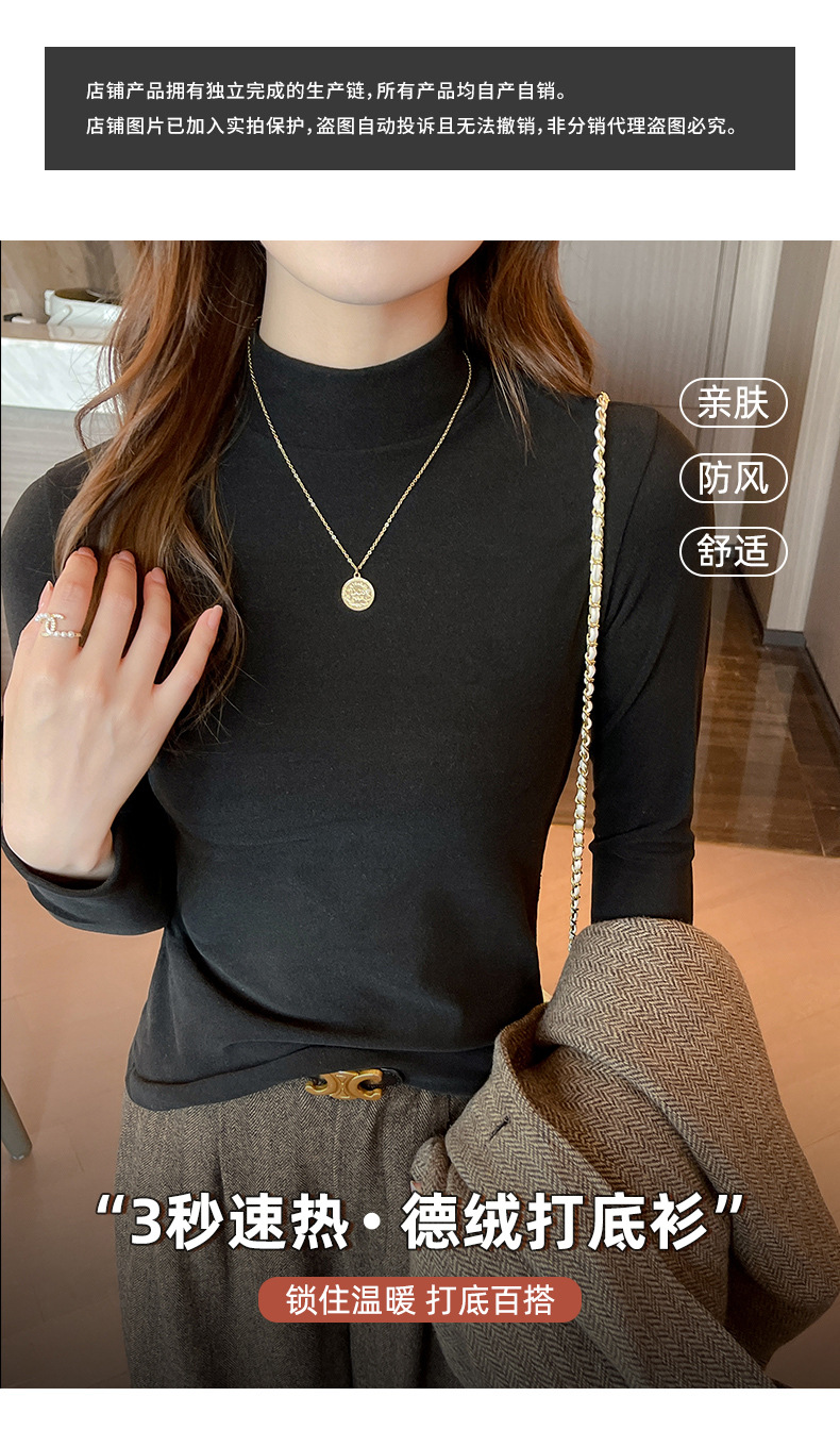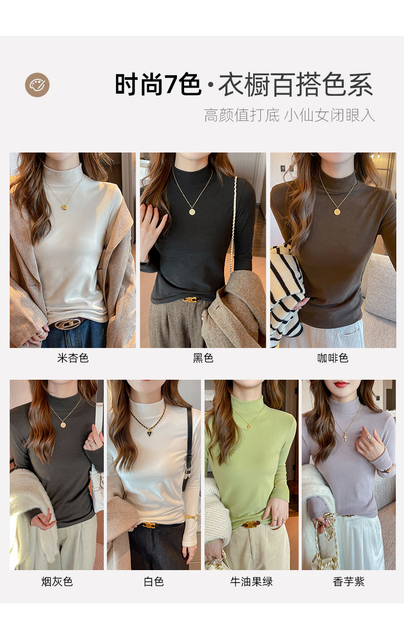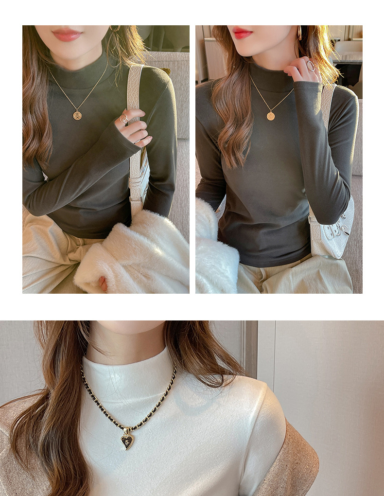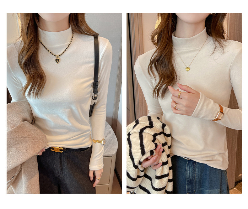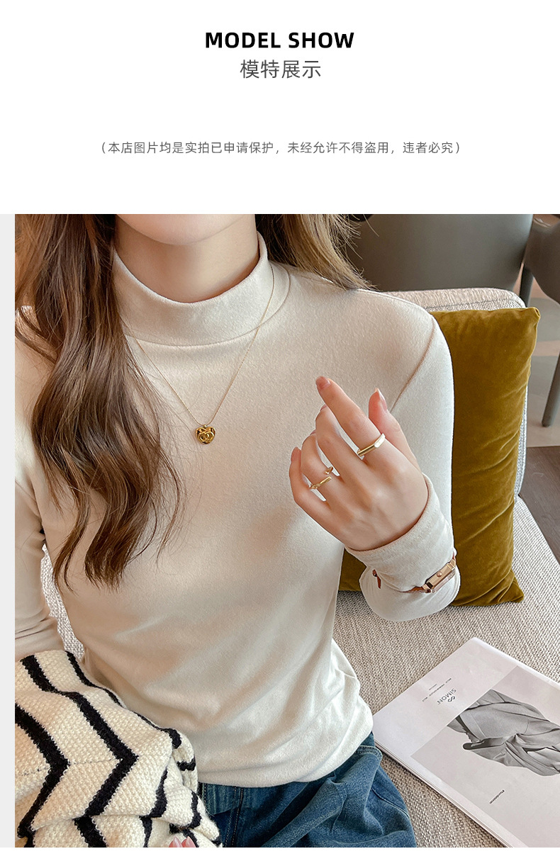 가을과 겨울 마이크로 미디 벨벳 세미 하이 칼라 바닥 셔츠 여성 인테리어, 미드 칼라 긴 소매 새 외형 어깨 티셔츠