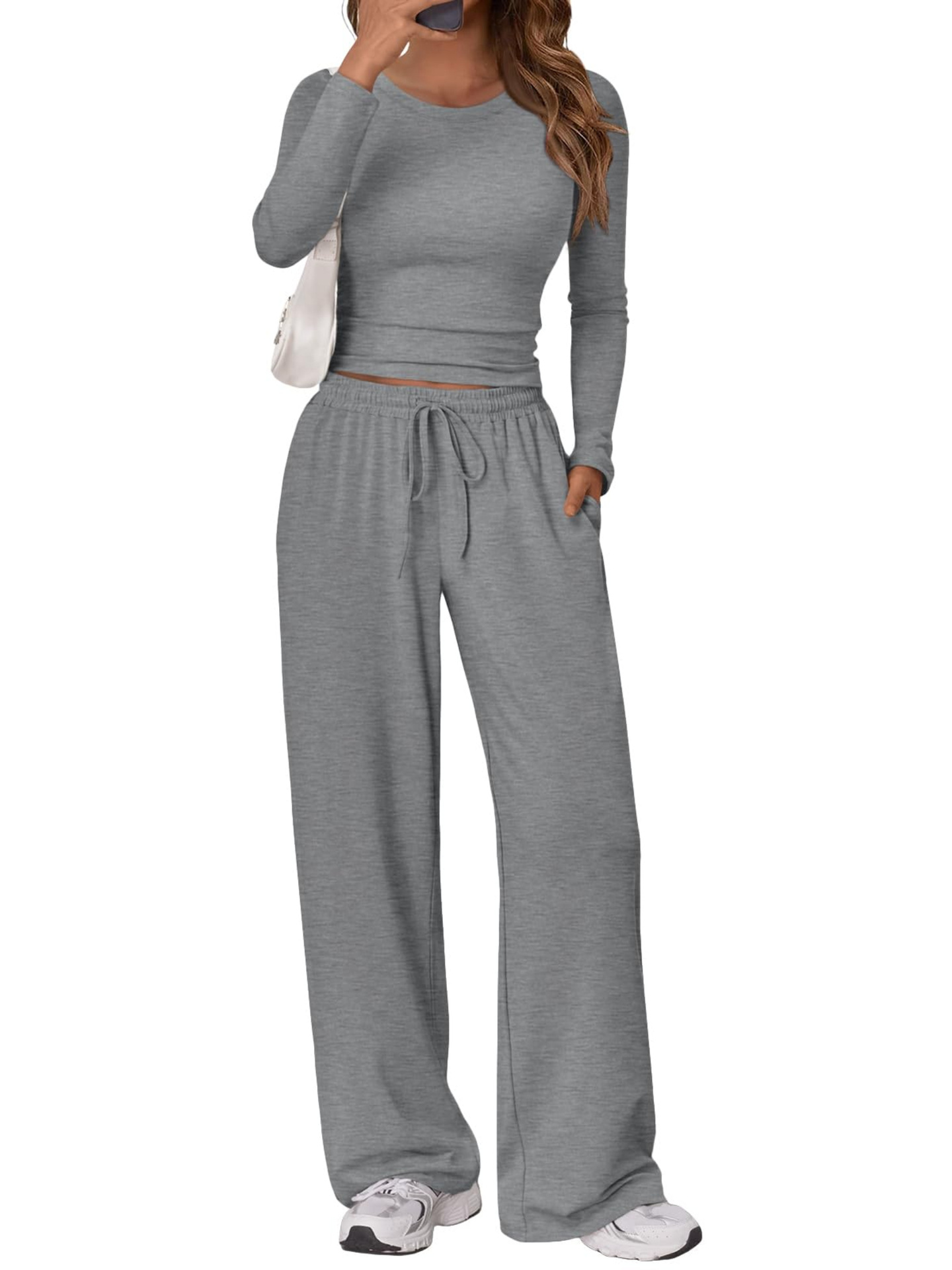 2024 국경 유럽과 미국의 아마존 새로운 솔리드 컬러 캐주얼 긴팔 정장 탑 하이 웨이스트 와이드 레그 팬츠 스포츠웨어
