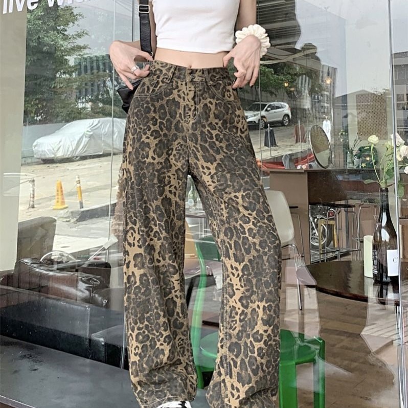 2024 봄과 가을 새로운 미국 스타일 빈티지 세탁 레오파드 무늬 스트레이트 레그 청바지 여성용 하이 스트리트 힙 루프 와이드 레그 팬츠스토어 가기