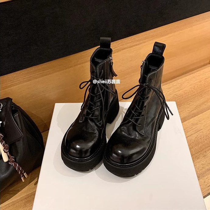 포도엄마와 같은 스타일~ 레그프리미엄 섹시걸~ 워싱 가죽 끈 묶는 굽 높은 오토바이 야외 숏부츠 여성용 가을 겨울 마틴부츠