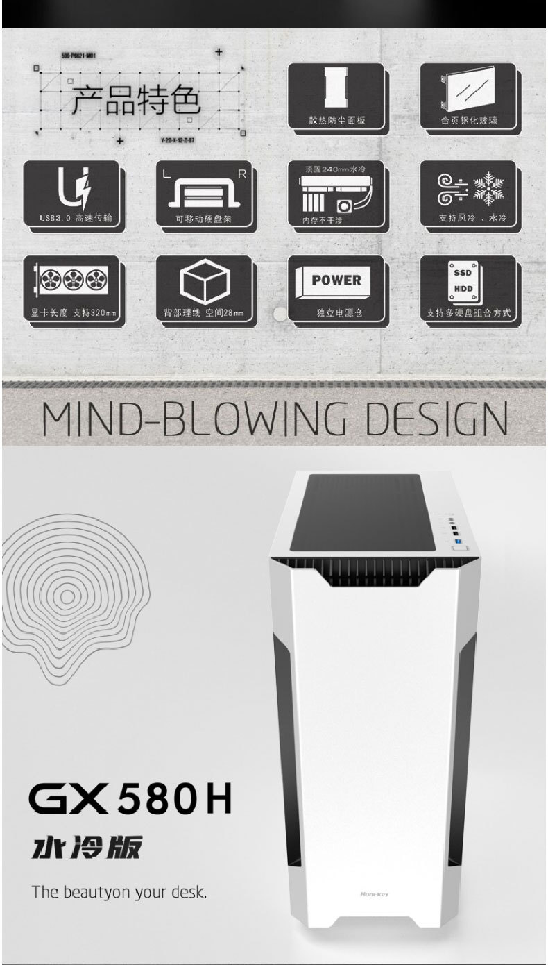 HuntkeyGX580H 데스크탑 섀시 ATX 중간 타워 수냉식 강화 유리 측면 게임 방진