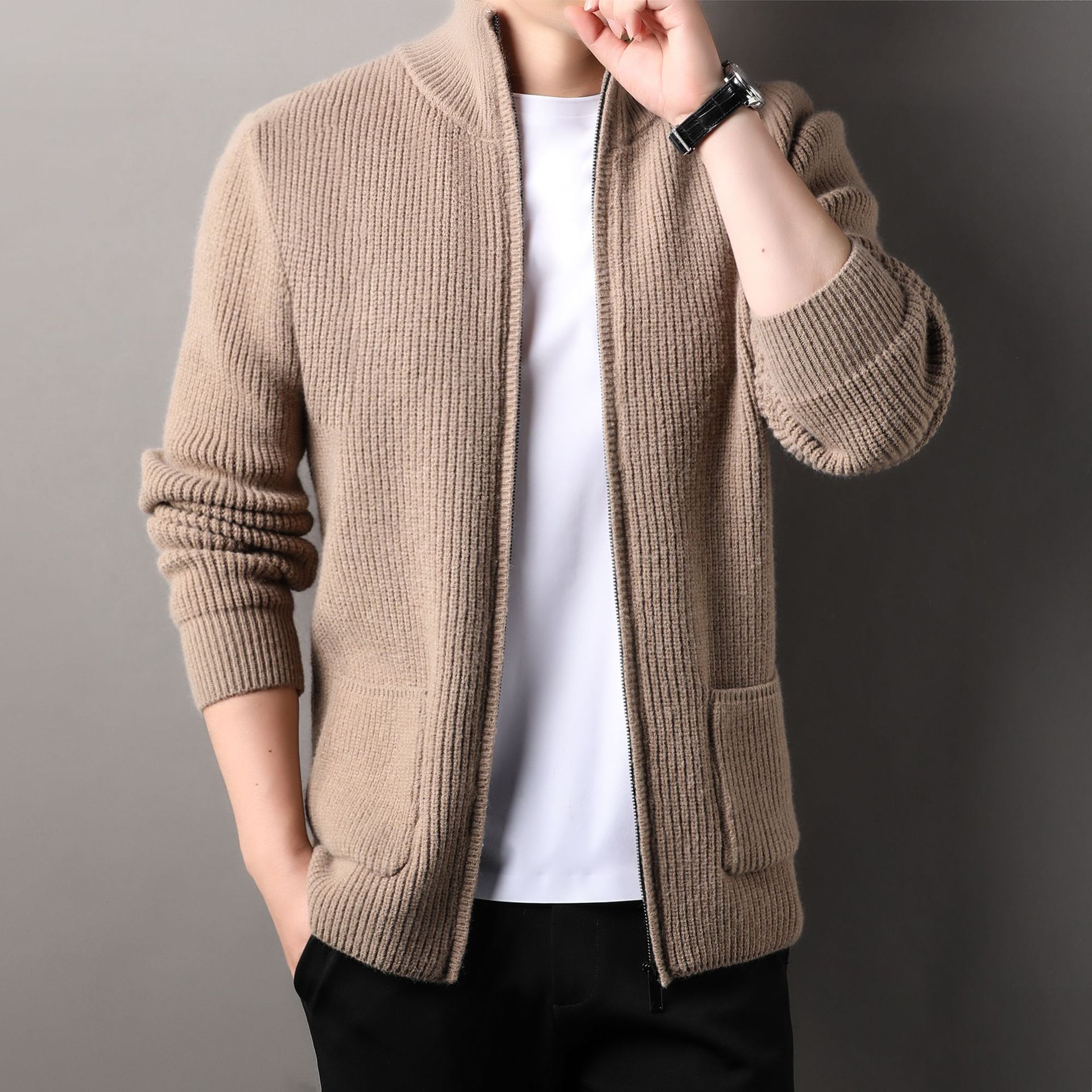 남자 대외 무역 가을과 겨울 리얼 포켓 지퍼 수직 스트립 니트 캐주얼 카디건 재킷, 수직 칼라 두꺼운 올 매치 스웨터 트렌디스토어 가기