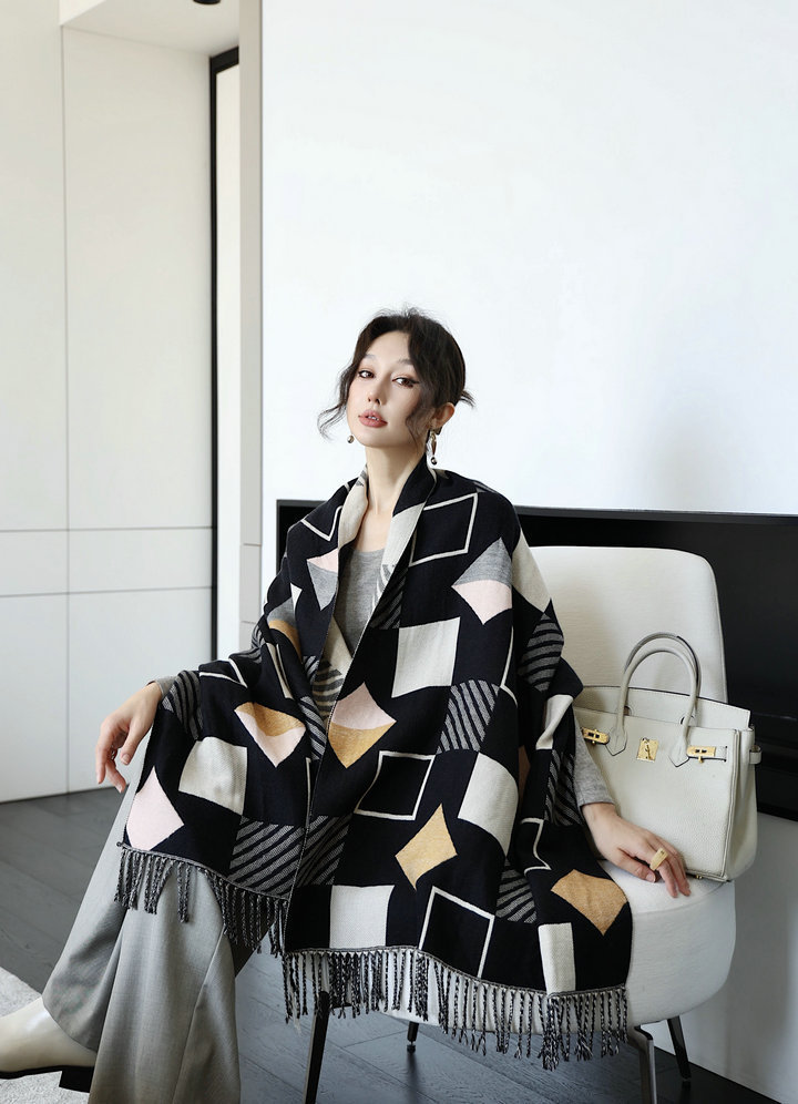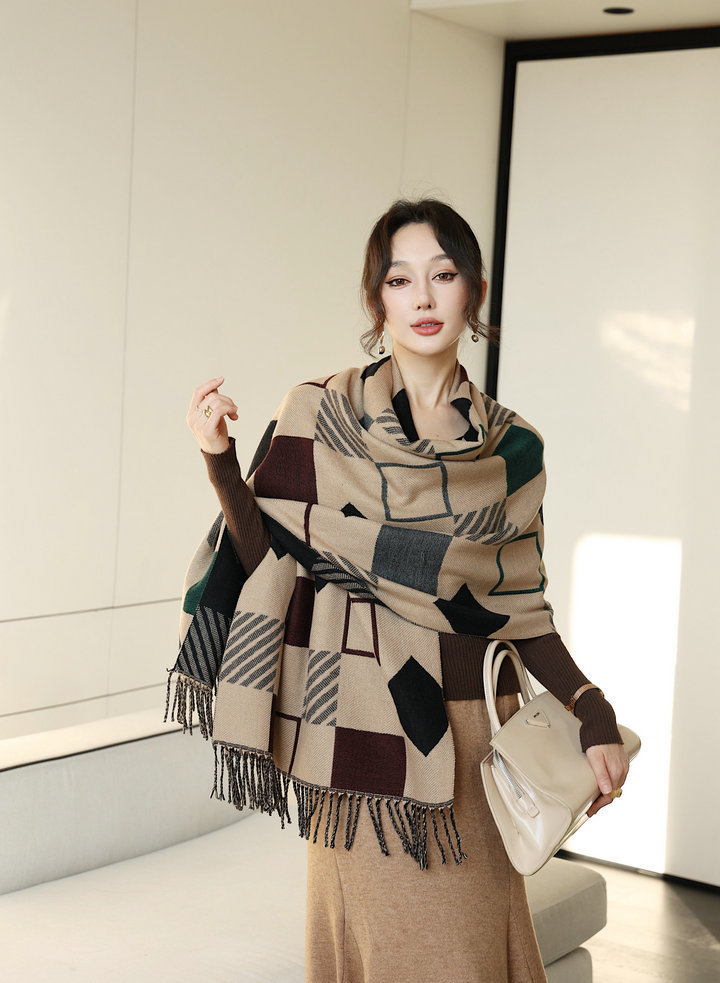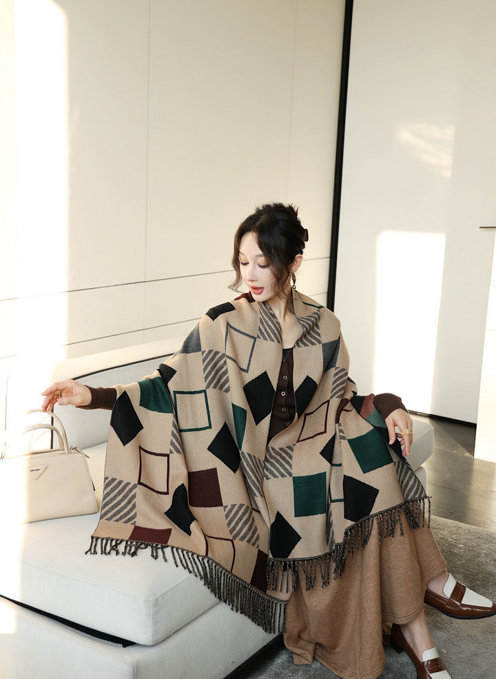 秋冬新款仿羊绒格子围巾女加厚保暖旅游外搭披风长款流苏披肩斗篷