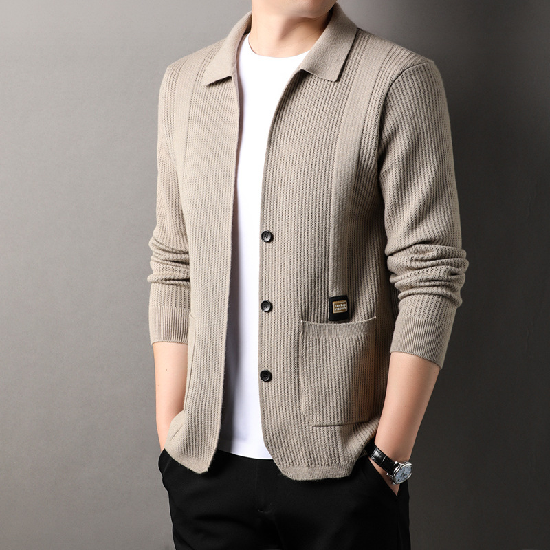 라이브 폭발 니트웨어 카디건 스웨터 남자 봄과 가을 옷깃 자카드 최고 중년 아빠 가을 코트