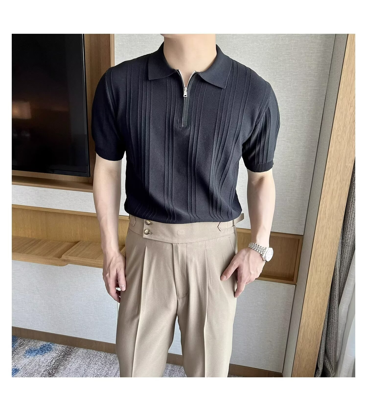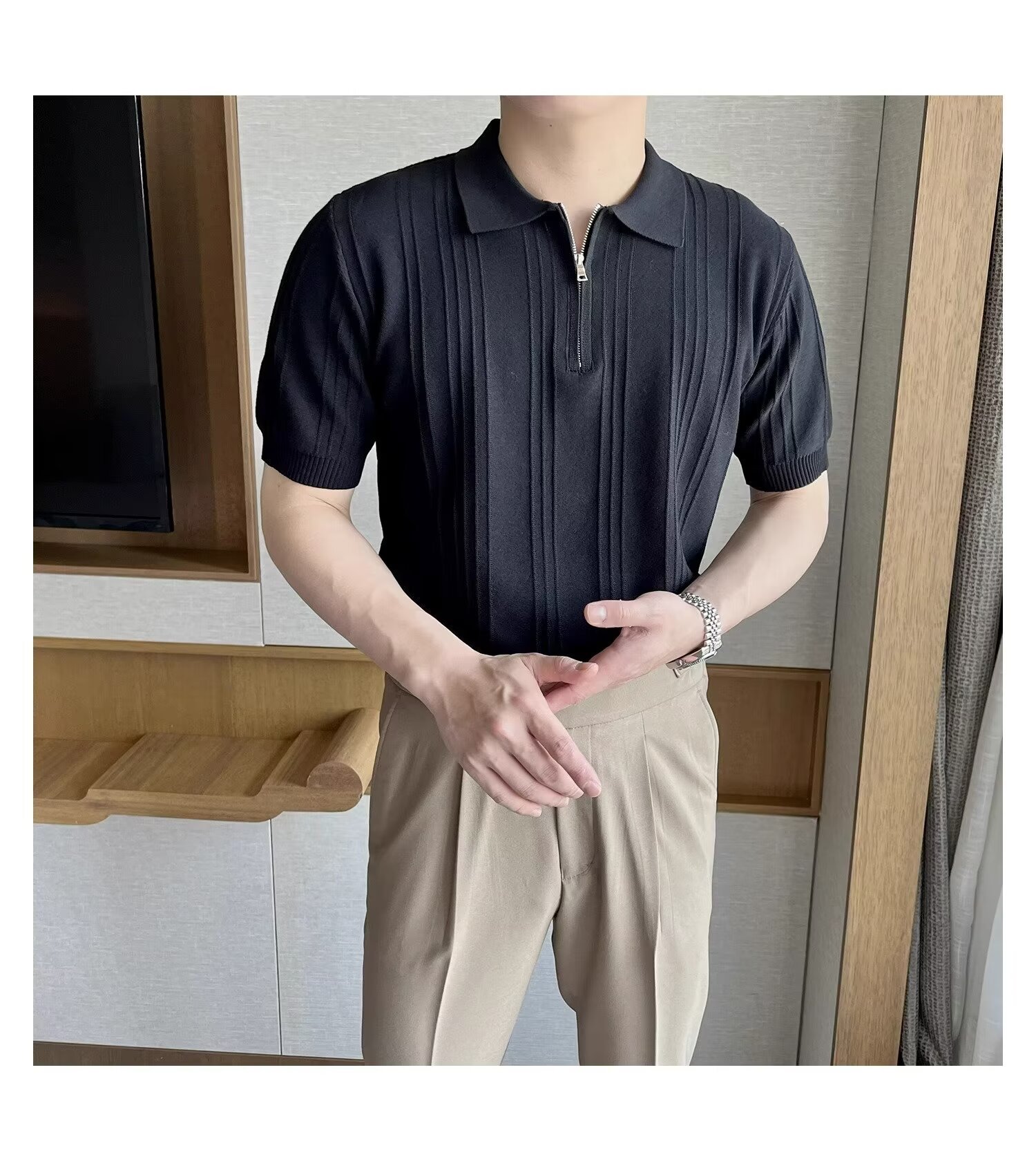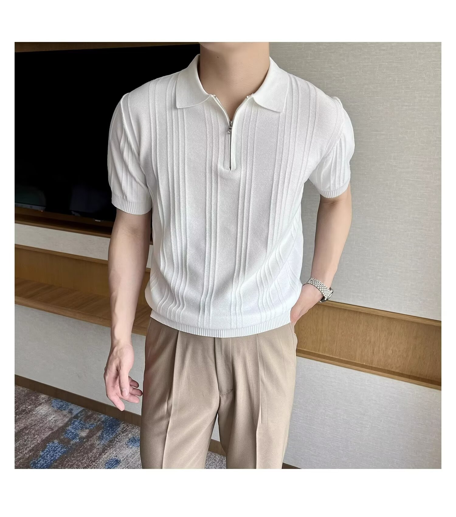 스트라이프 이탈리아 지퍼 반팔 폴로 셔츠 남자 영국 복고풍 우아한 자카드 옷깃 니트 반팔 여름스토어 가기