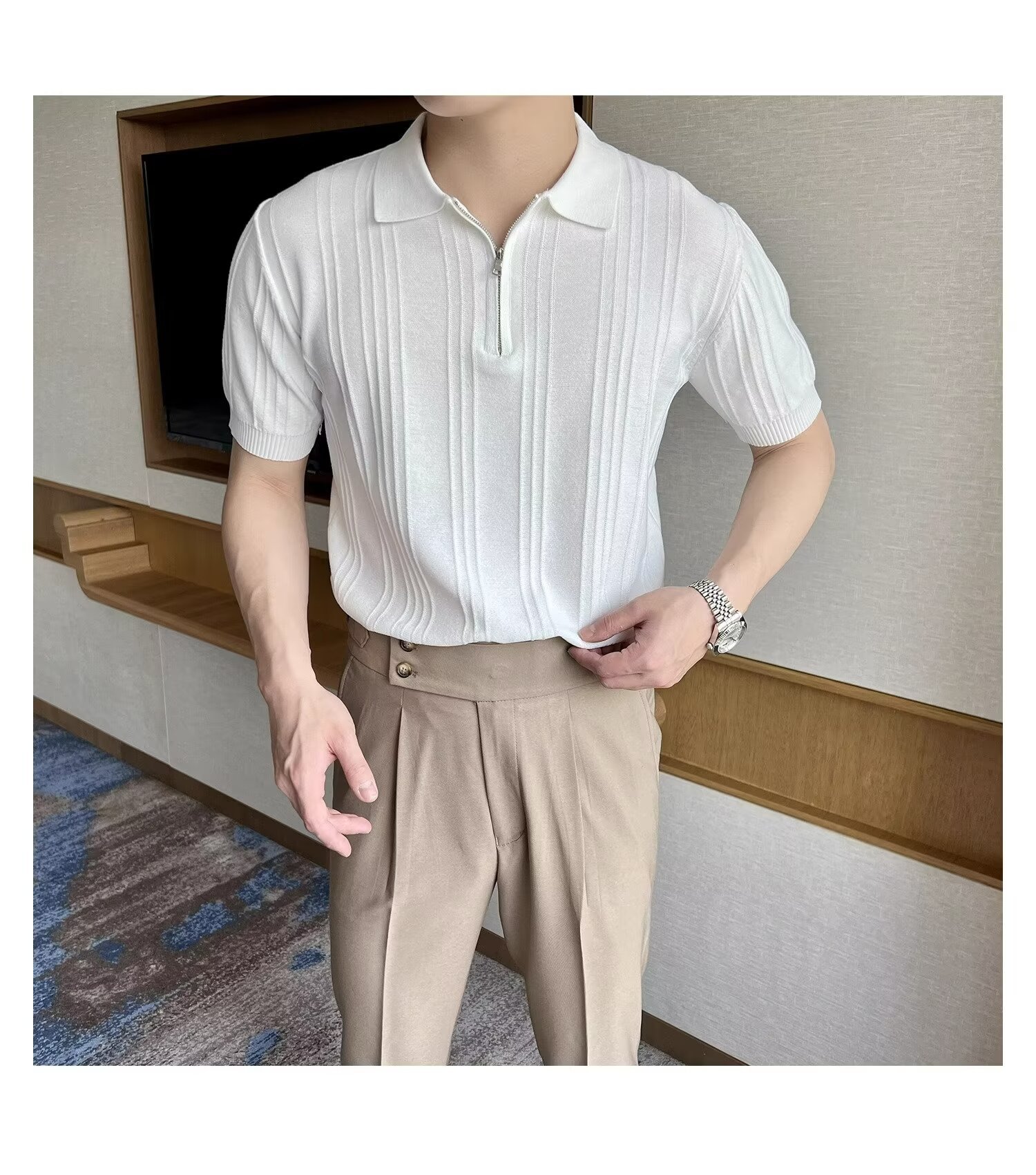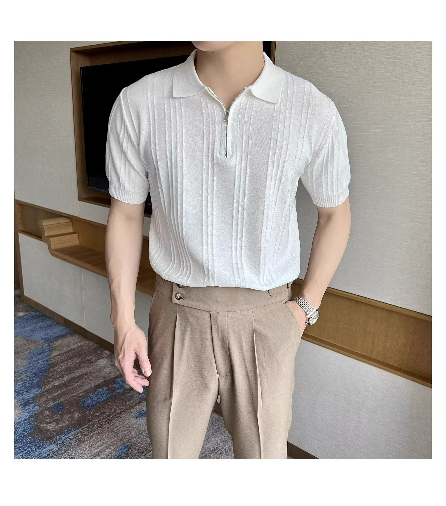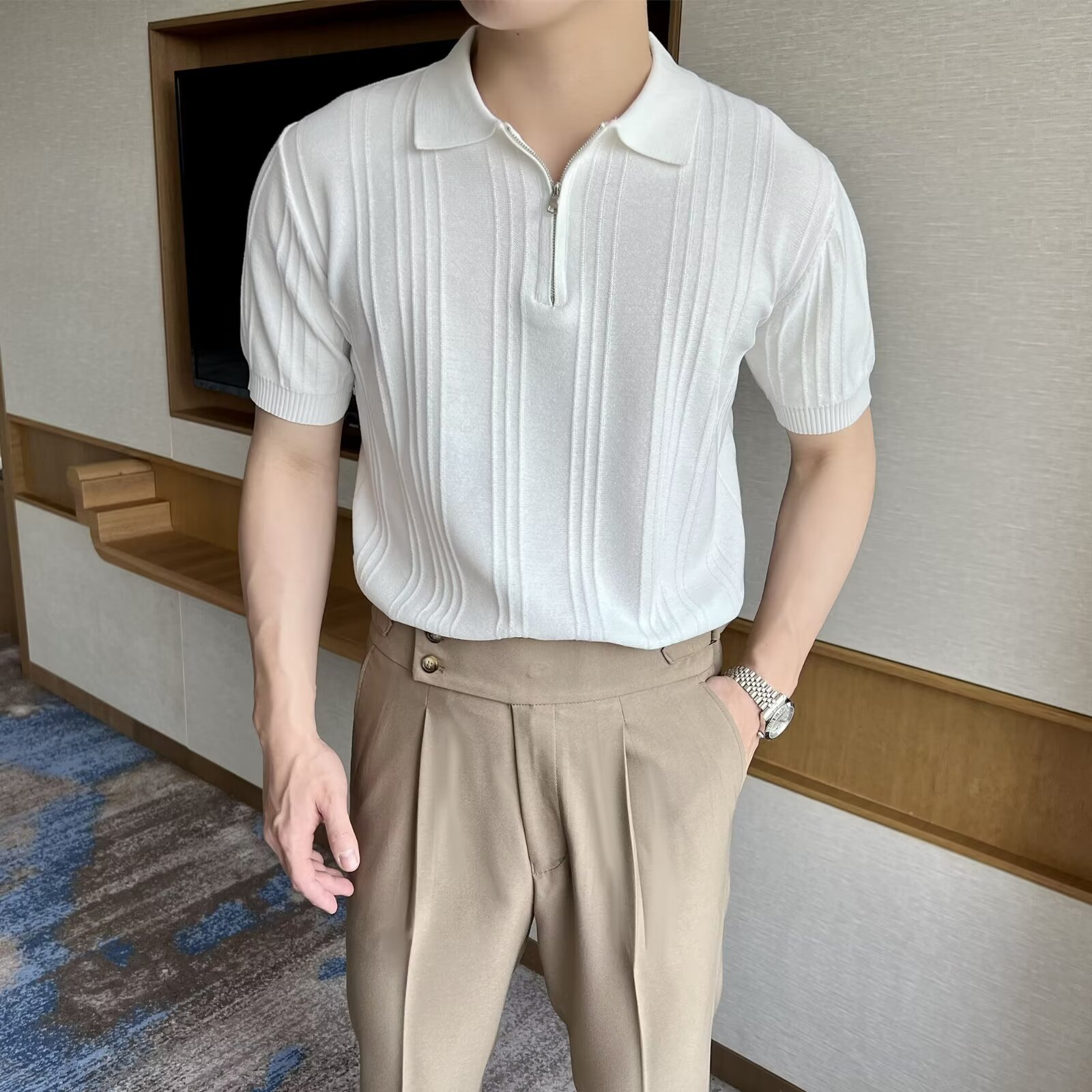 스트라이프 이탈리아 지퍼 반팔 폴로 셔츠 남자 영국 복고풍 우아한 자카드 옷깃 니트 반팔 여름스토어 가기