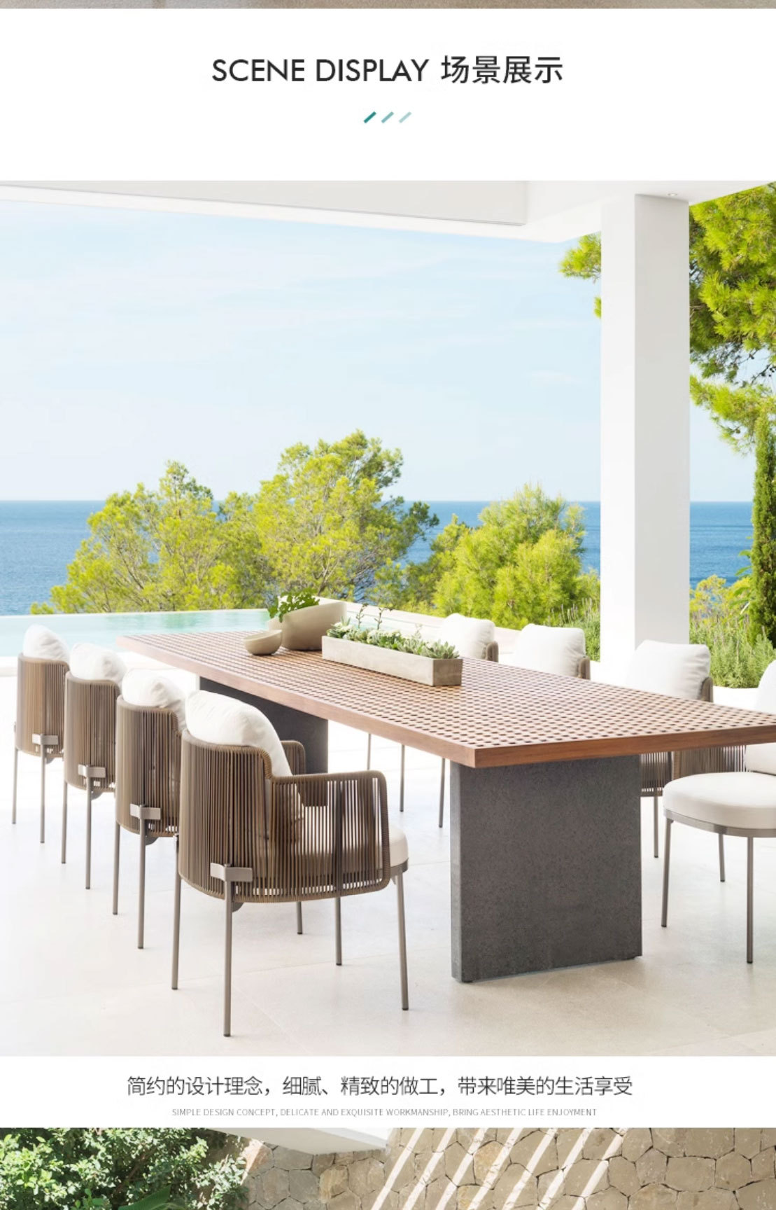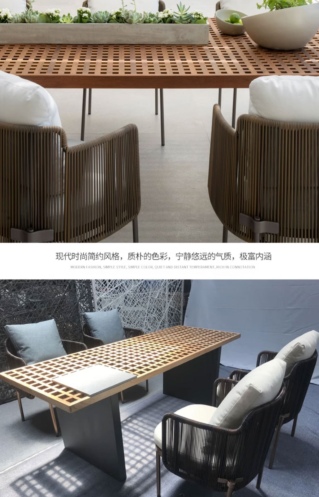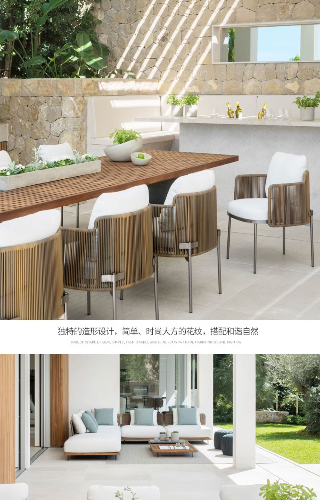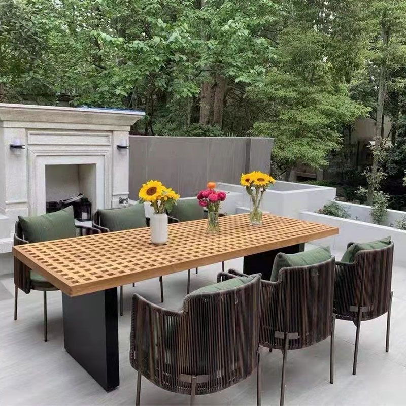 티크 야외 테이블과 의자 코트야드 등나무 의자 호텔 테라스 등나무 의자 빌라 정원 야외 레저 솔리드 우드 다이닝 테이블 및 의자