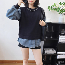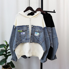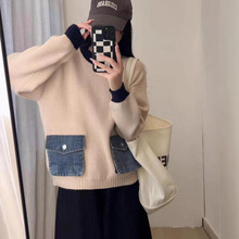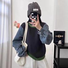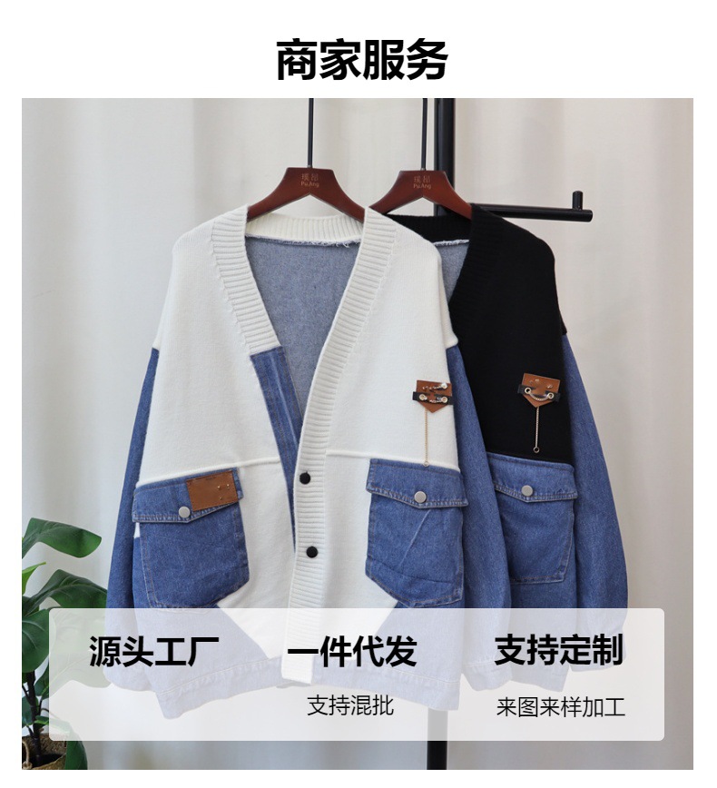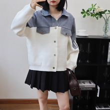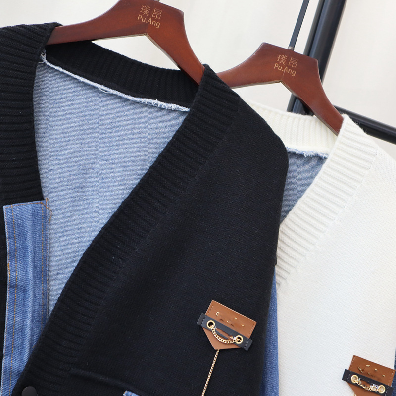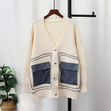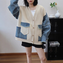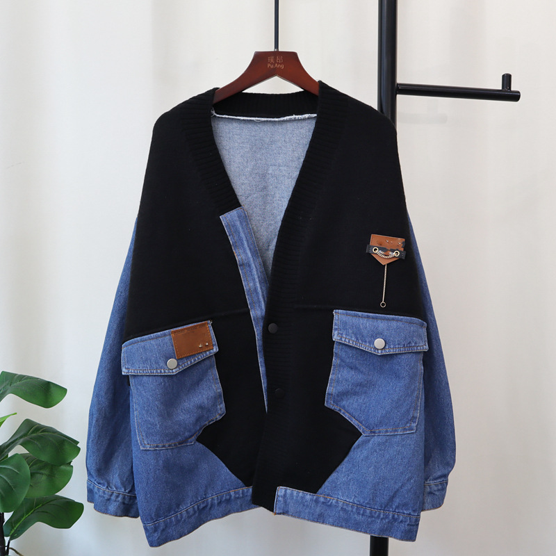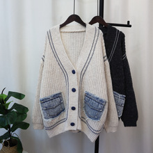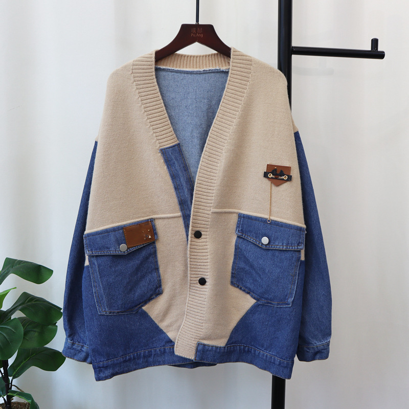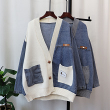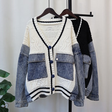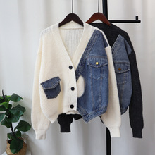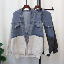 데님 스플 라이스 니트 카디건 가을, 겨울 새로운 스타일 루즈 캐주얼 패션 다목적 게으른 스타일 스웨터 자켓 여성용스토어 가기