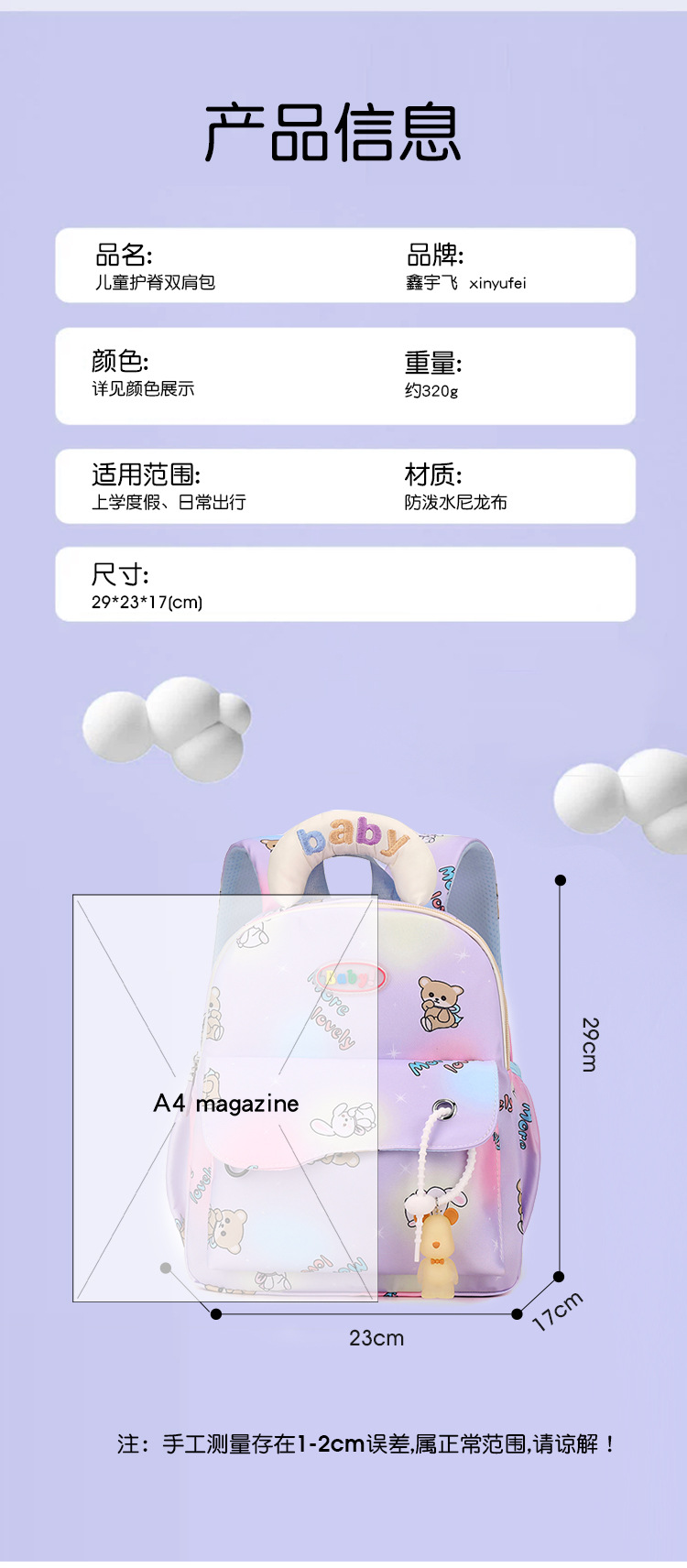 유치원 Schoolbag 소녀의 중산층 배낭 귀여운 경량 만화 곰 튀는 물 소년 토끼 배낭스토어 가기