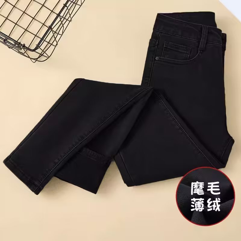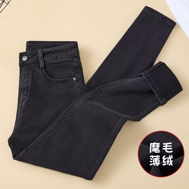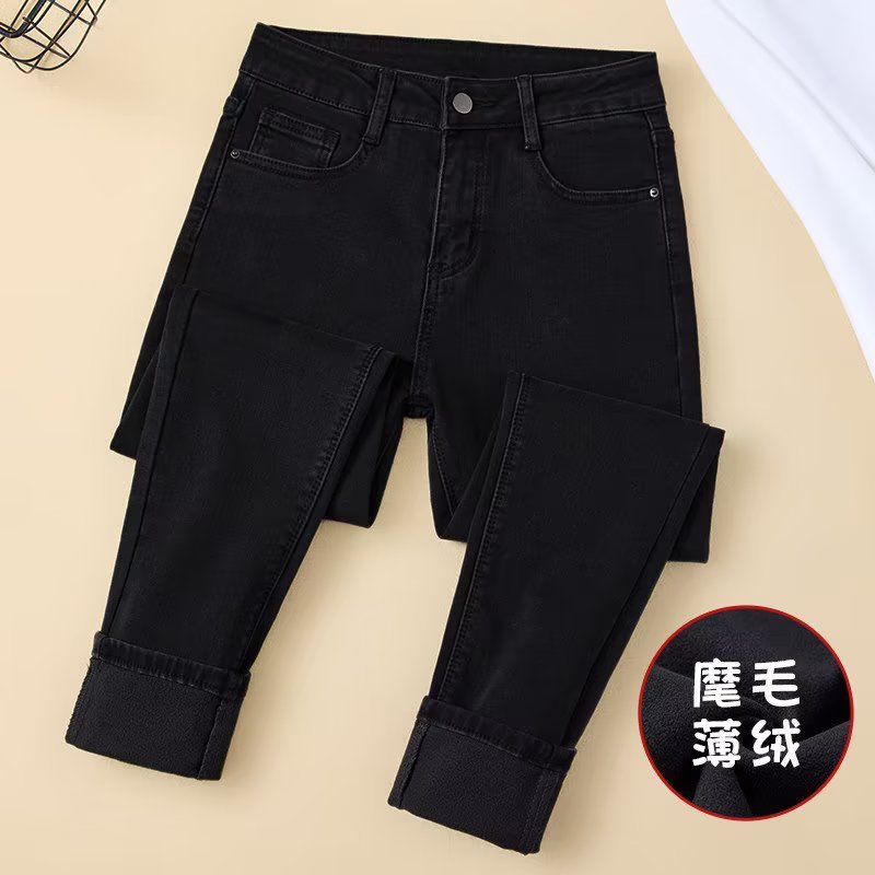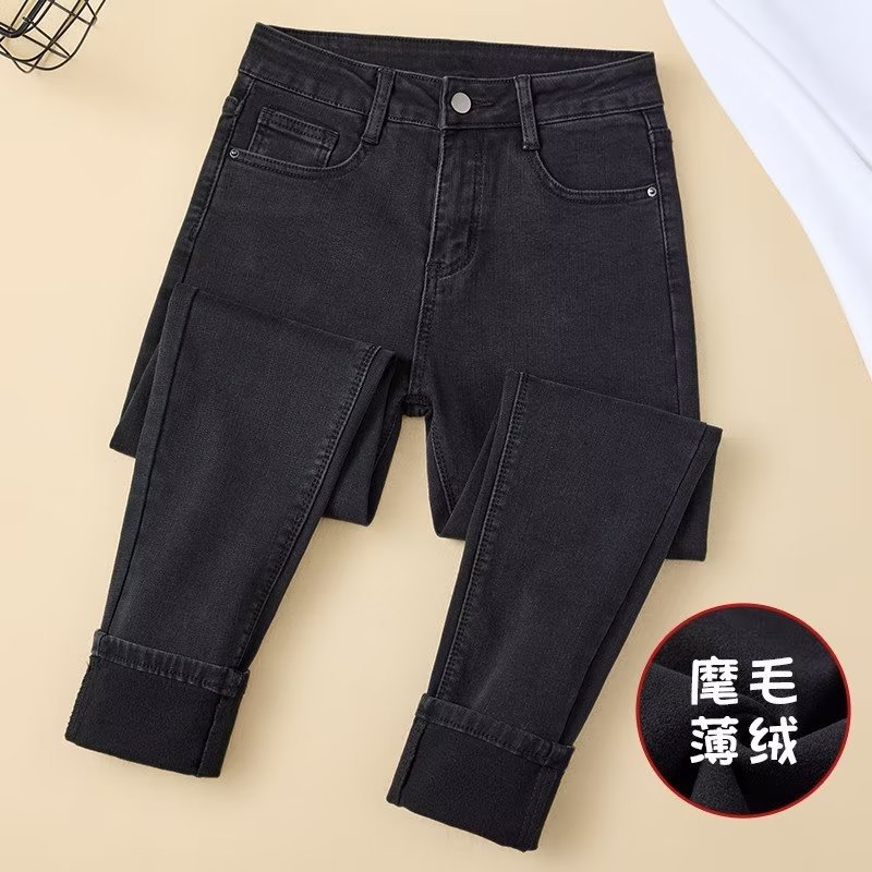 2024 한국 스타일 가을과 겨울 새로운 양털 플러스 사이즈 청바지 여성의 높은 허리 슬리밍 탄성 슬림 연필 바지스토어 가기